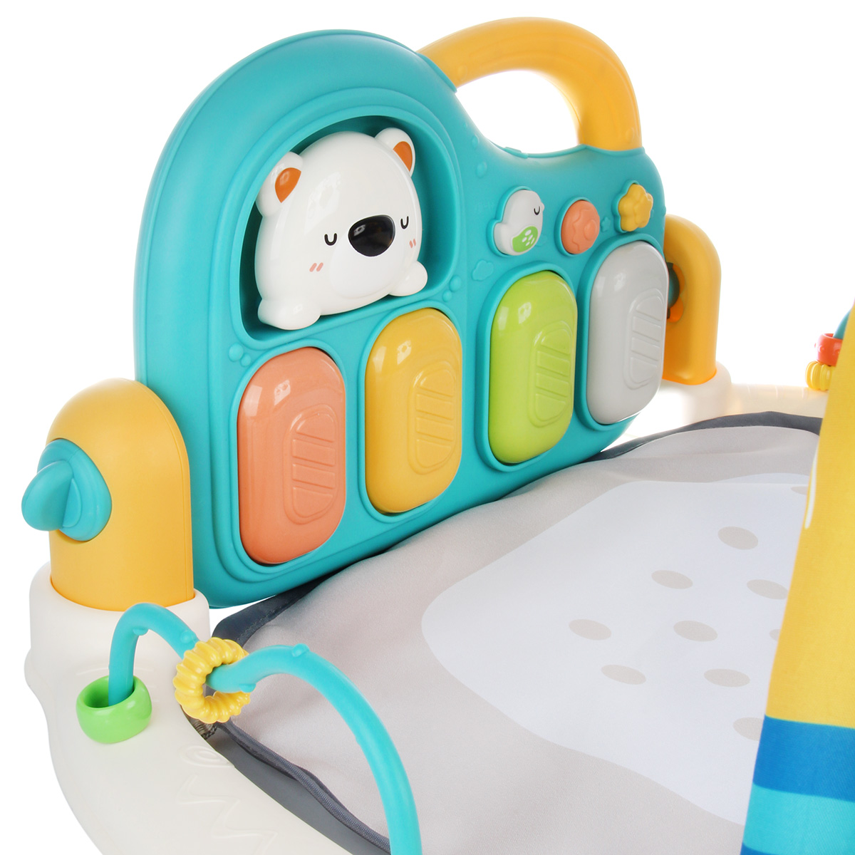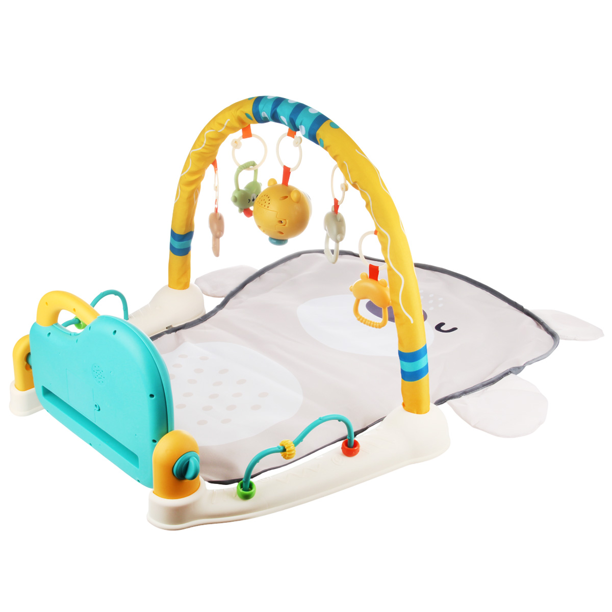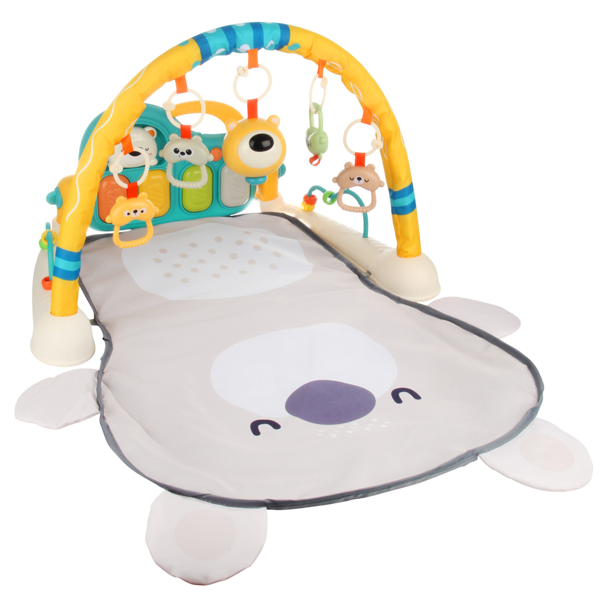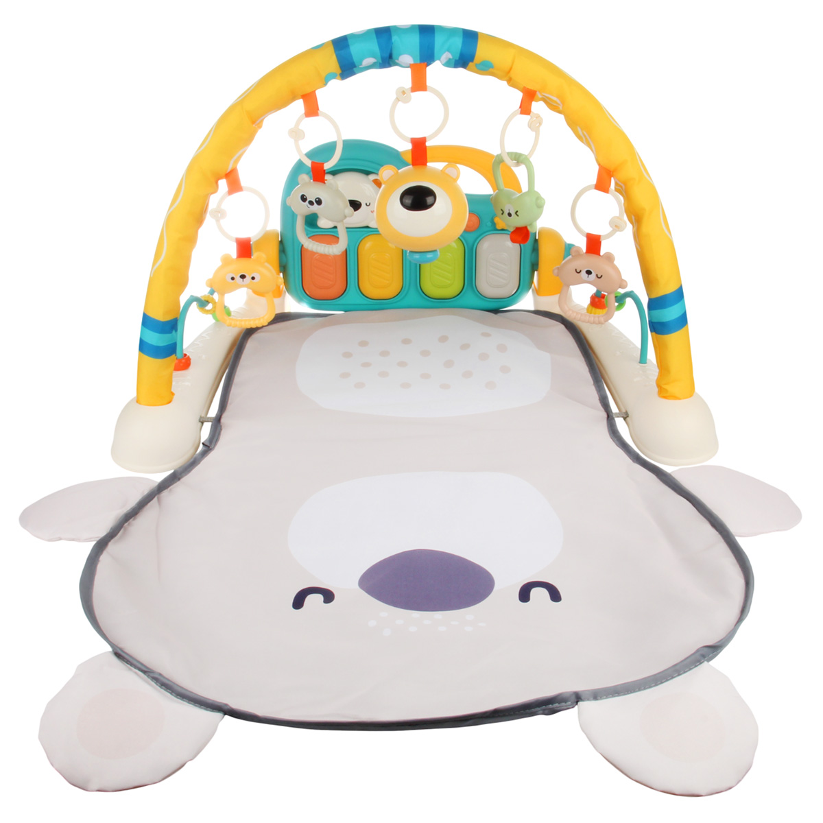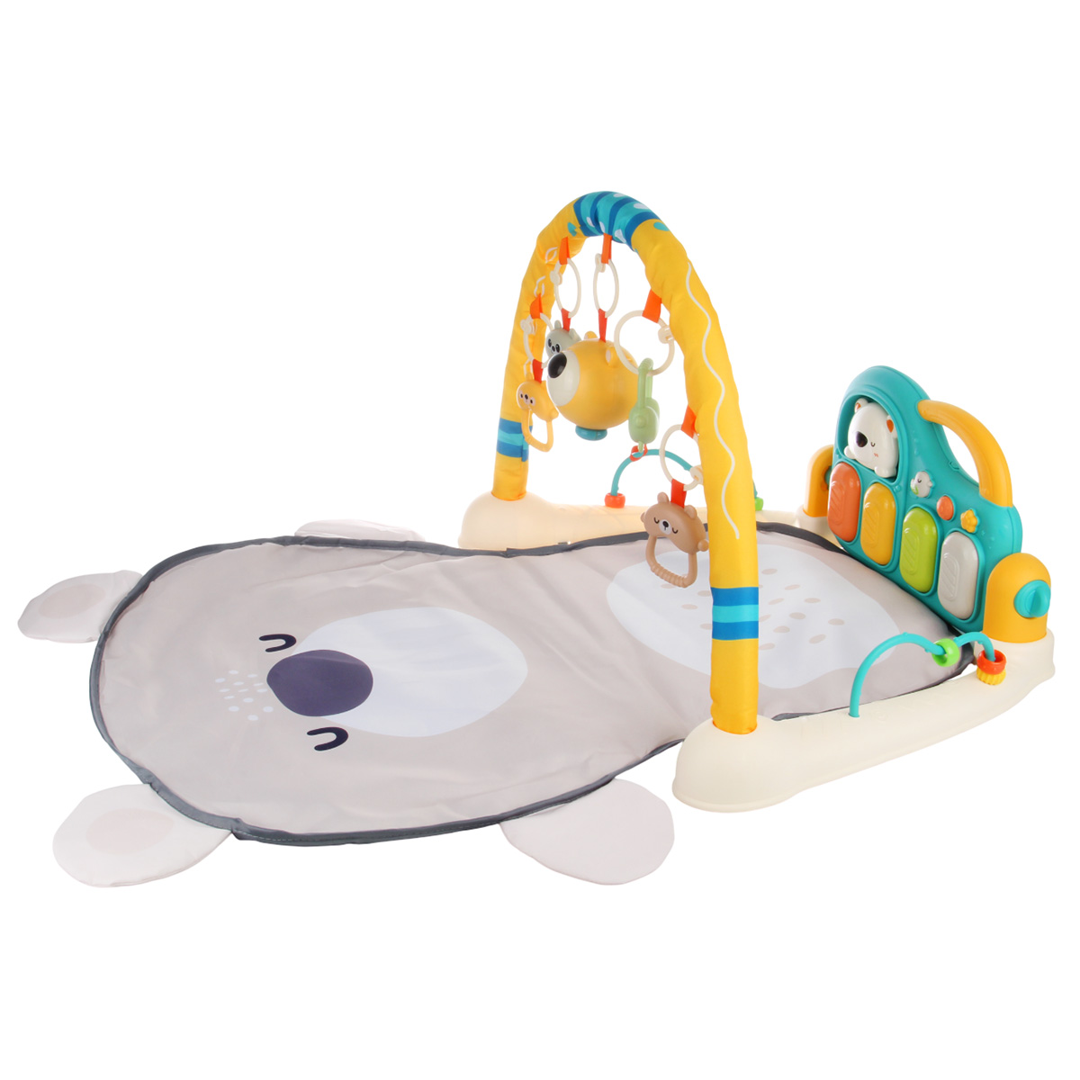 3 в 1, коврик, пианино и коврик с дугой с игрушками. Роскошный развивающий музыкальный коврик для новорожденного со съемными игрушками погремушками, оформленными в милом дизайне. Светильник в виде головы медвежонка, проигрывает колыбельные. Пианино с 3 режимами работы, издает звуки нот, проигрывает более 5 мелодий, достройка мелодий, регулировка уровня громкости. Детский коврик для ползанья имеет мягкую подкладку, легко стирать. Отличное качество исполнения, удобство хранения в разобранном виде. Такой коврик для ползанья отлично подойдет для развития тактильных и слуховых навыков ребёнка, станет замечательным подарком на Новый год и День рождения.