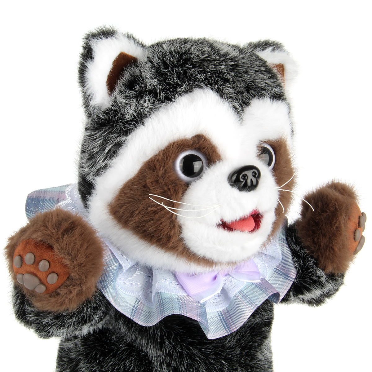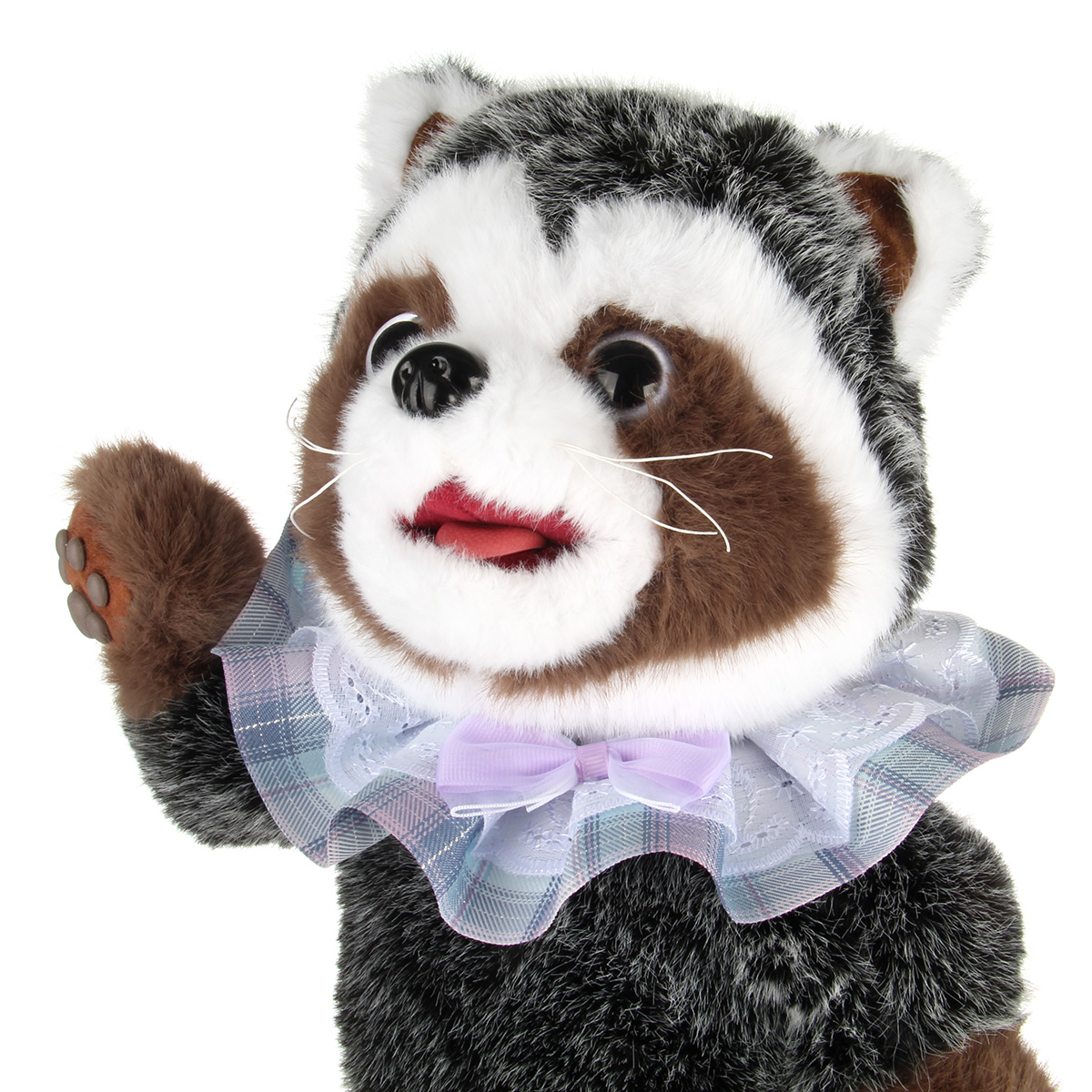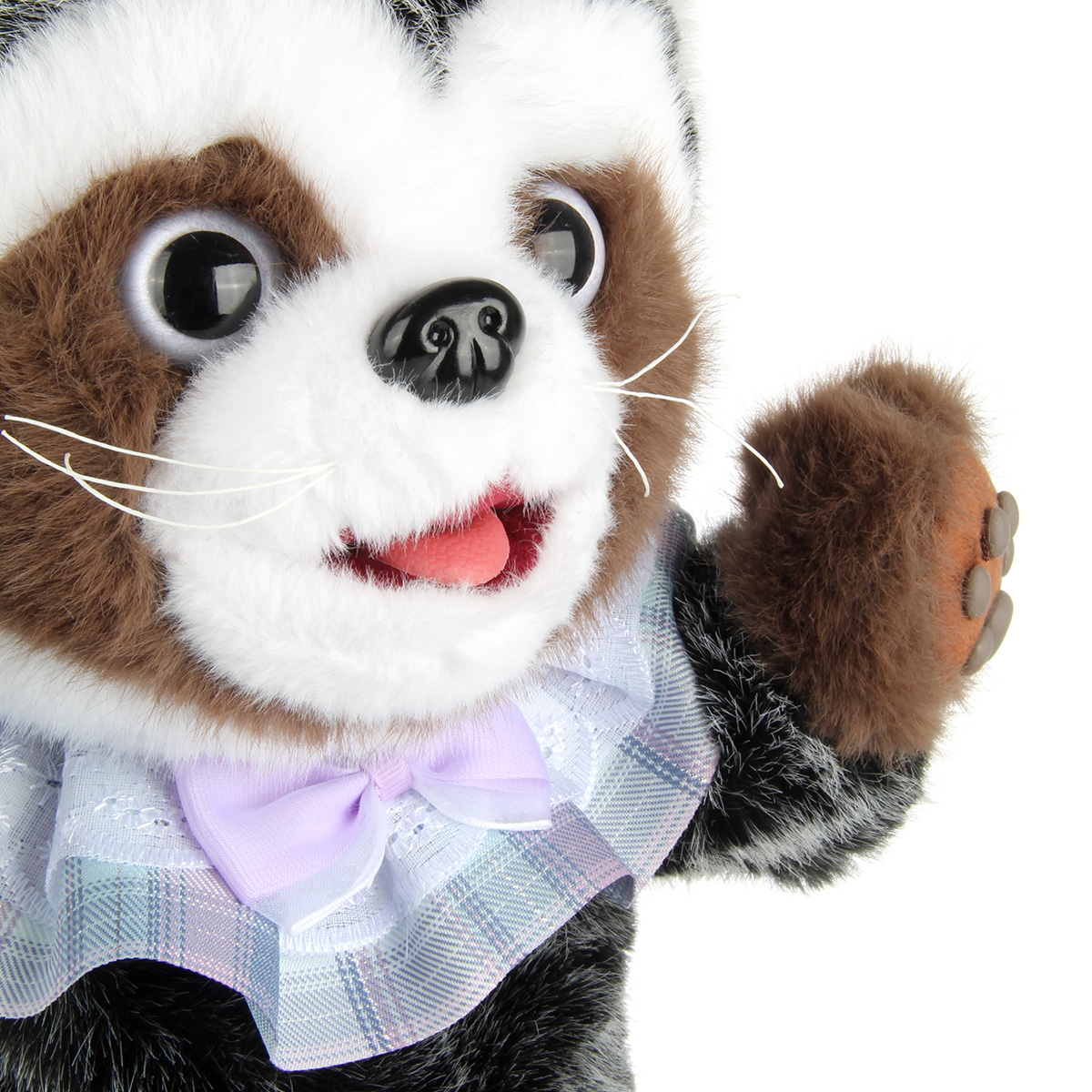 2. При нажатии на лапку проигрывает треки, более 3 песен, шевелит головой, верхними лапками, высовывает язычок, имитируя процесс облизывания. Повторное нажатие на лапку останавливает музыку и движения. Еще одно повторное нажатие на лапку, енотик проигрывает следующую песню, движение головой, верхними лапками и язычком.