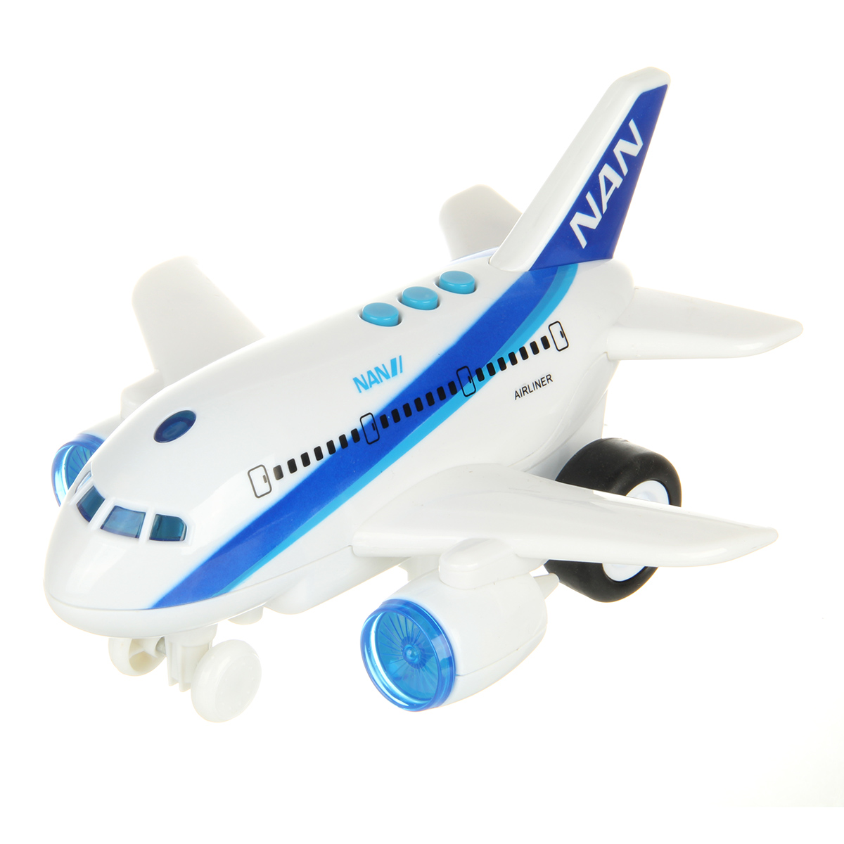 2. При нажатии кнопок на корпусе издает звук взлетающего самолета, звуковые сигналы объявления, женский голос делает объявления о взлете и посадке самолета.