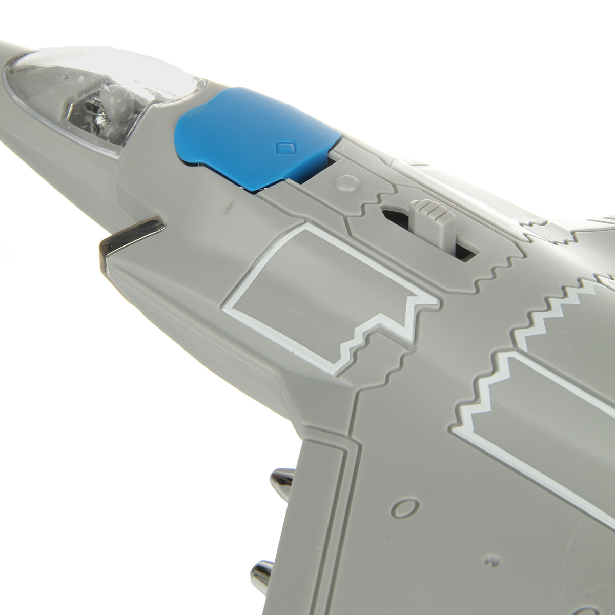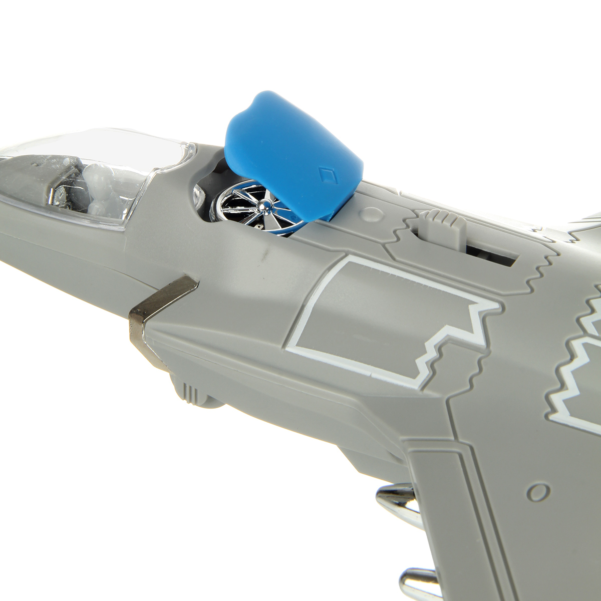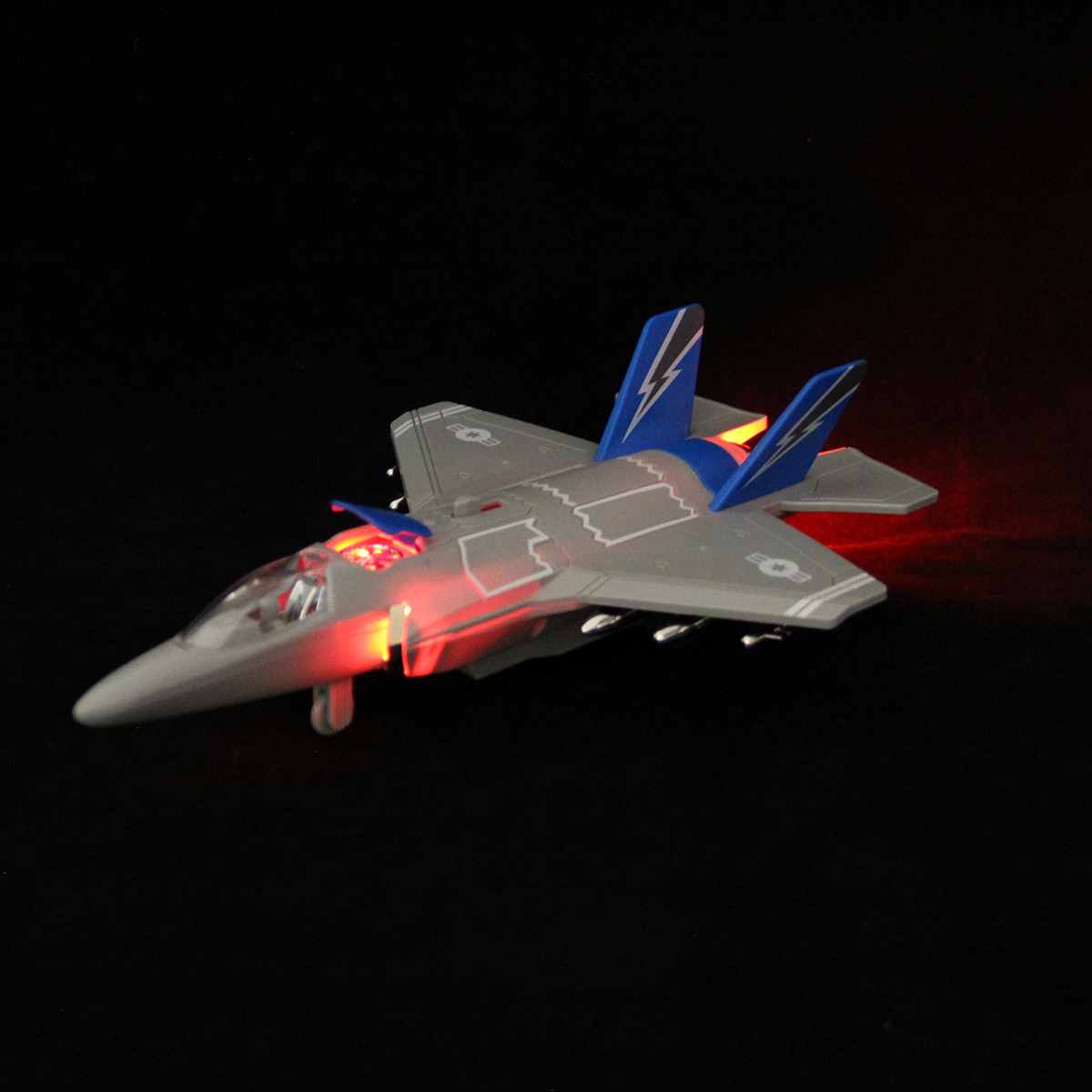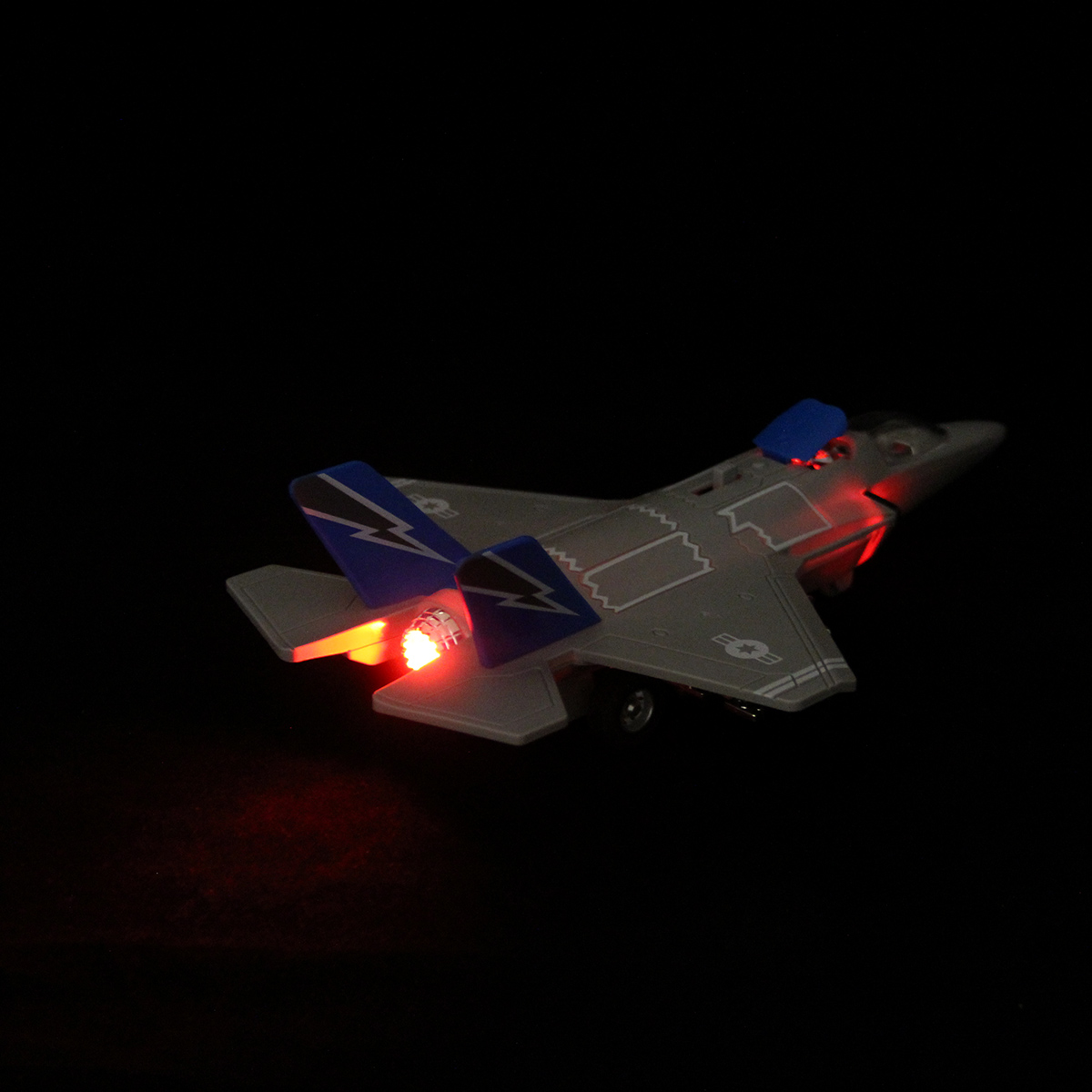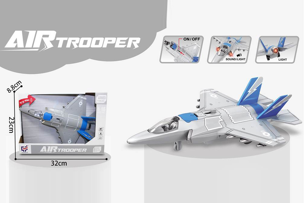 2. При передвижении рычажка на корпусе открывается крышка воздухозаборника, издает звуки взлетающего транспорта, стрельбы, подсветка заднего фонаря, воздухозаборника и бортовых фонарей.