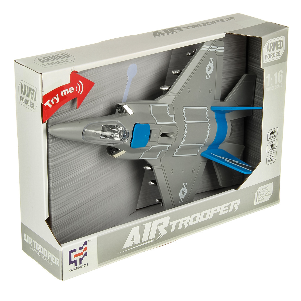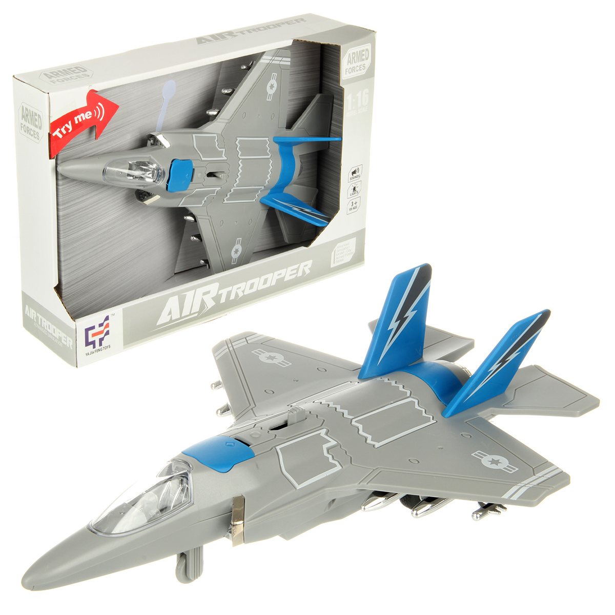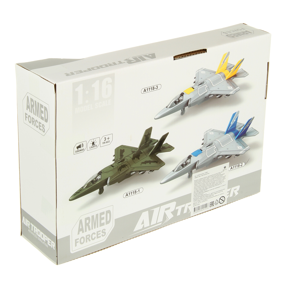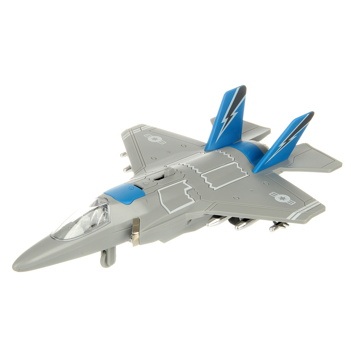 2. При передвижении рычажка на корпусе открывается крышка воздухозаборника, издает звуки взлетающего транспорта, стрельбы, подсветка заднего фонаря, воздухозаборника и бортовых фонарей.