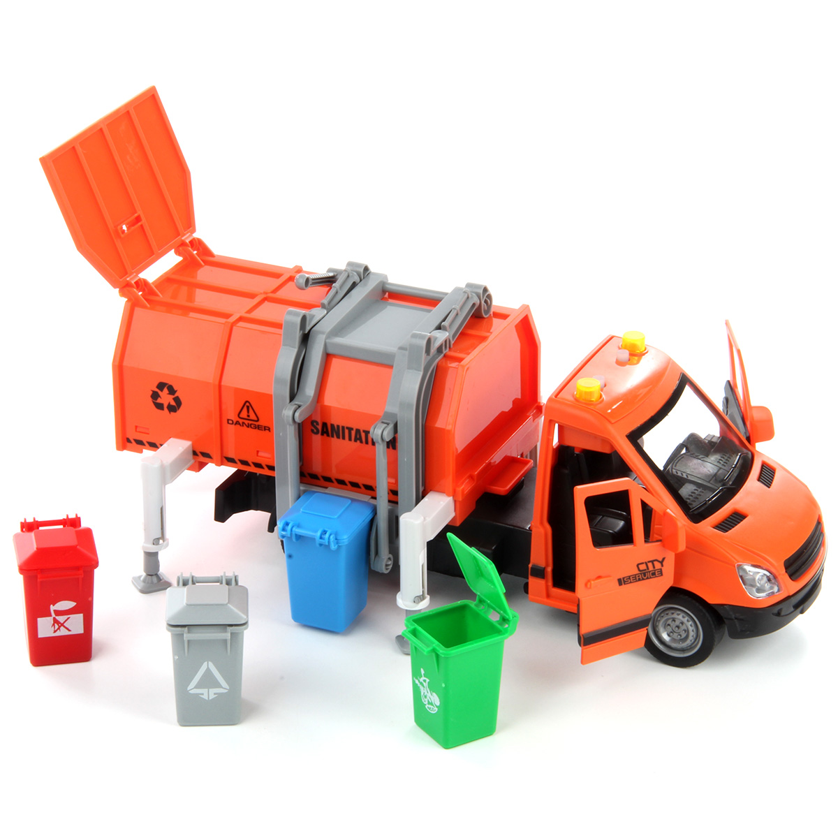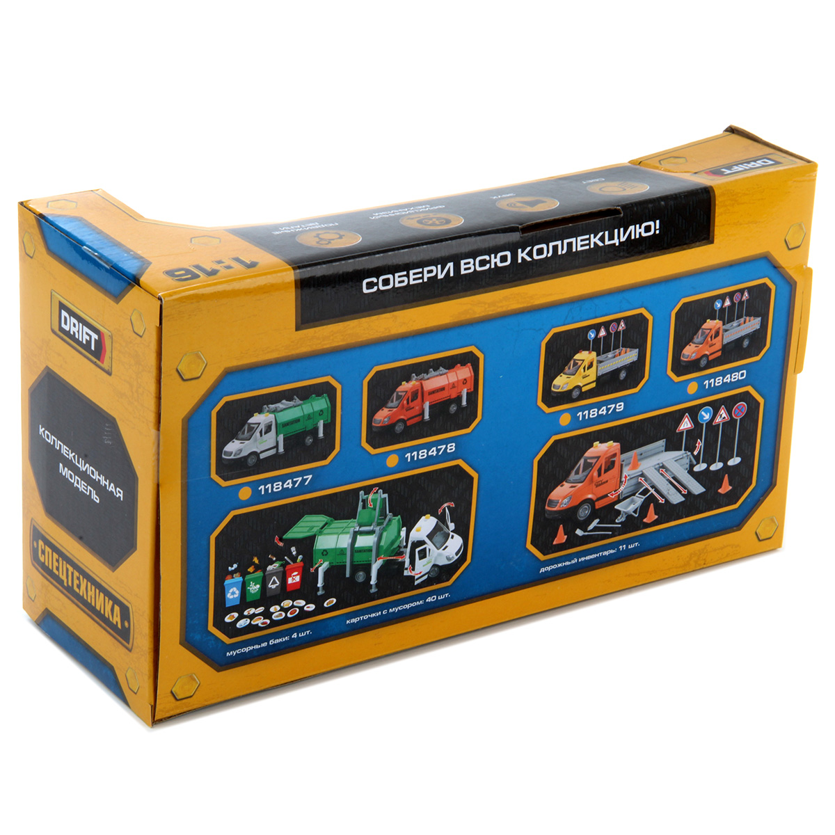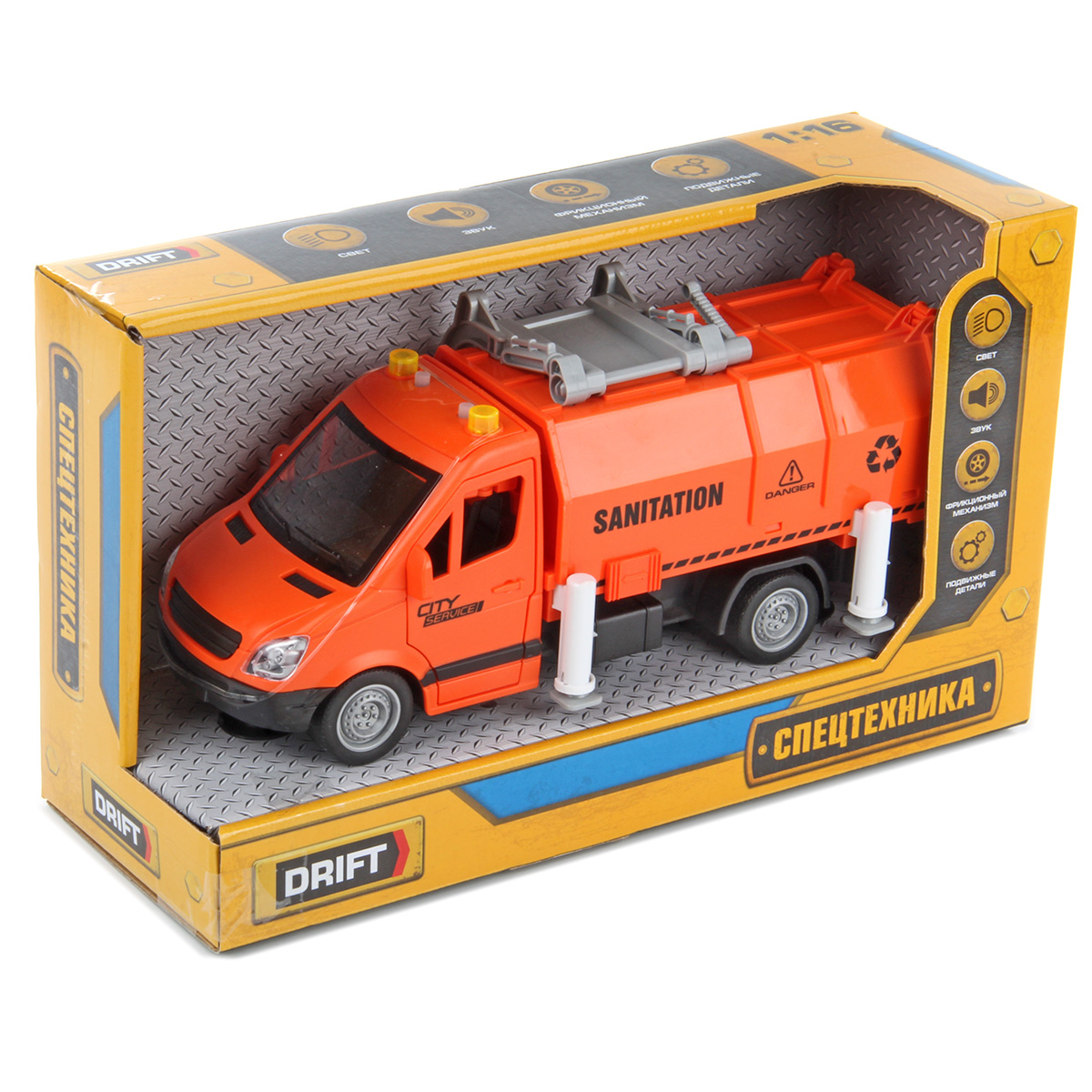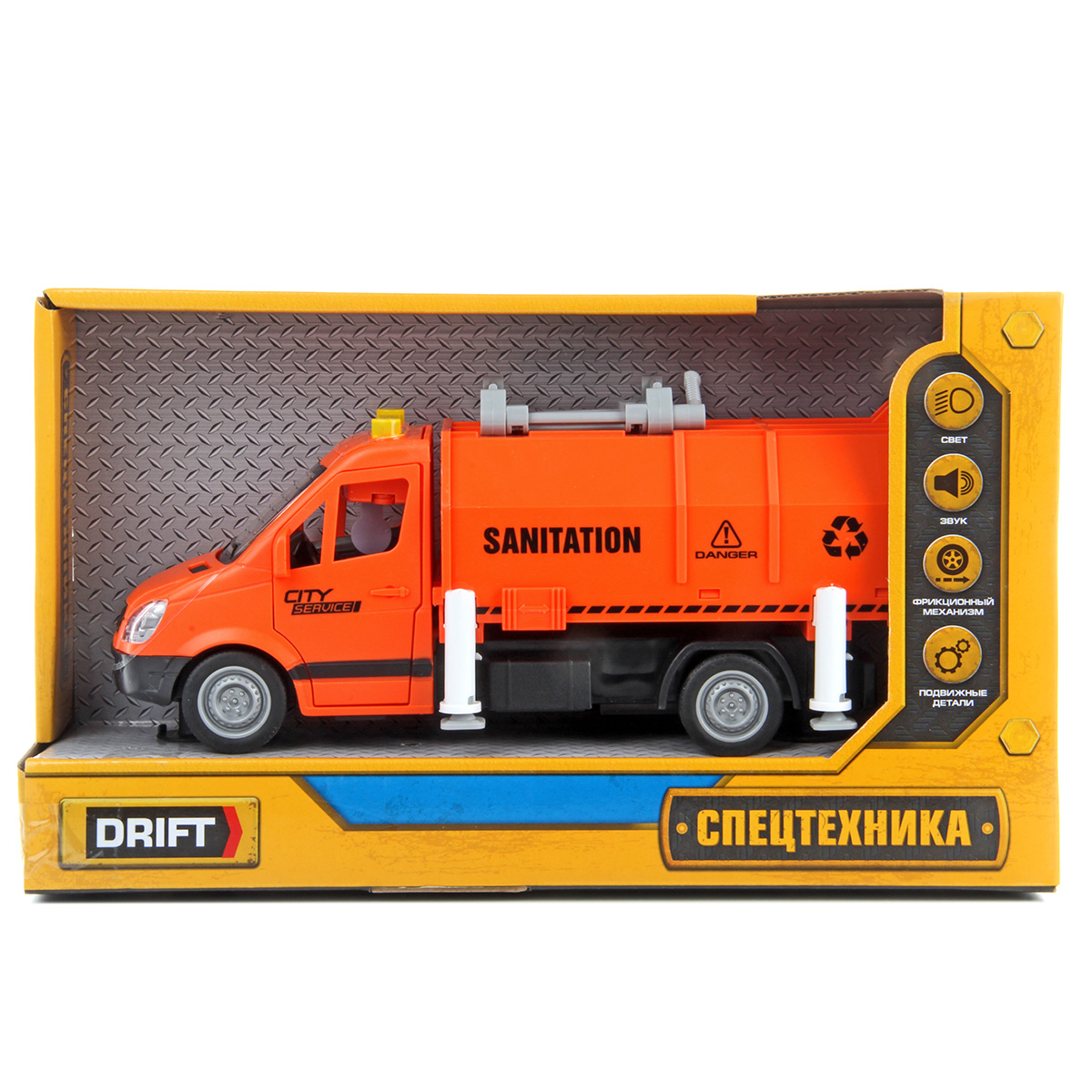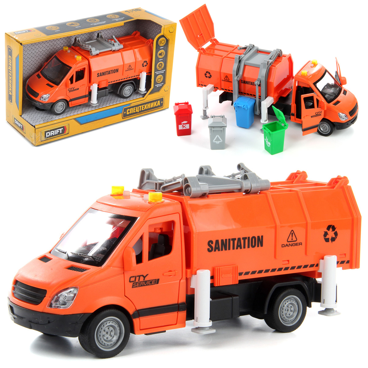 Машина-спецтехника Drift, с прорезиненными колёсами, звуковыми и световыми эффектами. Большое количество подвижных элементов и высокое качество изготовления подарят незабываемые впечатления от игры вашему ребёнку. В комплект игрушки входит мусоровоз, 4 мусорных бака, 4 комплекта бумажного мусора. Мусоровоз работает от батареек AG-13 3 шт., входят в комплект. Функционал игрушки: -двери открываются и закрываются; -машинка оснащена фрикционным механизмом, двигается вперёд, назад; -при нажатии кнопок на крыше издаёт различные звуки мусоровоза, сигналы мигают; -мусорный контейнер снимается; -дверь контейнера открывается; -мусор помещается в мусорный бак; -мусорный бак фиксируется в подъёмном механизме и вытряхивается в контейнер; -опоры поднимаются и опускаются, мусорный бак фиксируется на двери контейнера. Размеры упаковки: 32*12*19 см. Размеры машинки: 27*12*12 см. Размеры мусорного бака: 5*4*3 см. Изготовлено из пластика, резины.