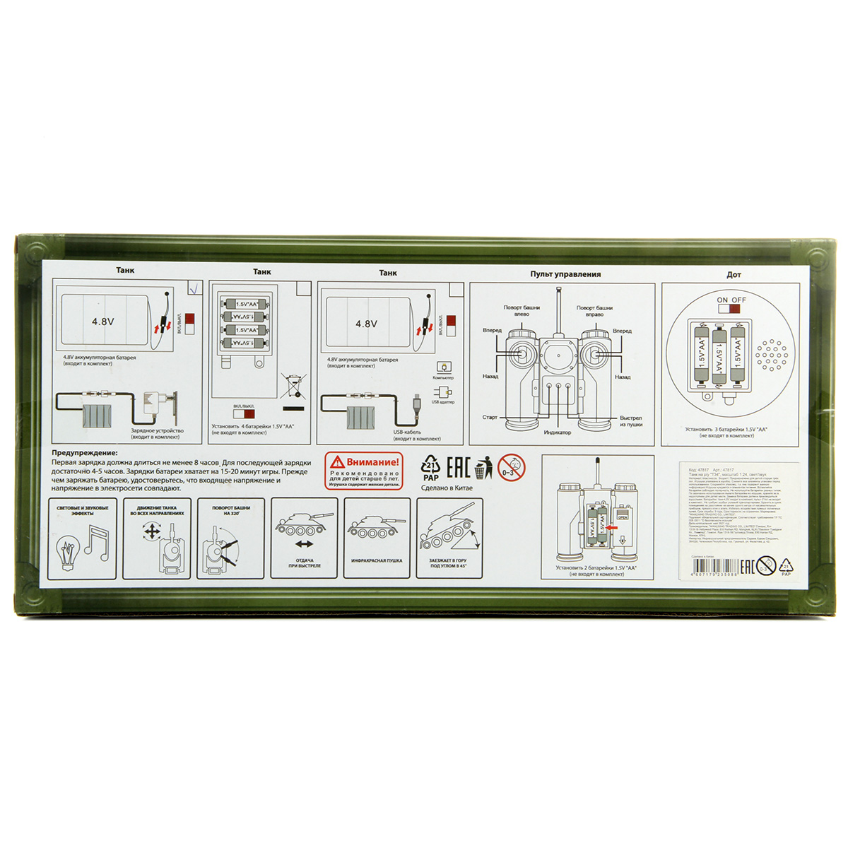 Деморежим. Функция автоотключения. Имитация отката при выстреле. Движение танка во все стороны. Поворот башни на 320 градусов. Подъём на наклонную поверхность при угле наклона - до 45 градусов.
