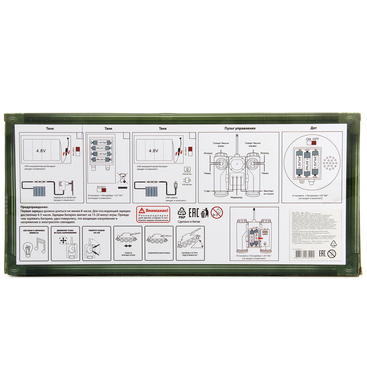 Пульт работает на батарейках АА 2 шт., не входят в комплект, танк работает от аккумулятора 4.8 V.