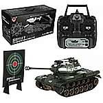 Радиоуправляемый игрушечный танк с функцией стрельбы, картонной мишенью, аккумулятором и набором аксессуаров. Игрушка танк для мальчика может стрелять орбизами и пластиковыми пульками. Подвижные элементы, поднимающаяся поворачивающаяся башня, движение во все стороны, открывающийся люк, в который можно поместить солдатика. Военная игрушка изготовлена из прочных и безопасных материалов в качественном исполнении с вниманием к деталям. Оформлен в стильной военной расцветке.