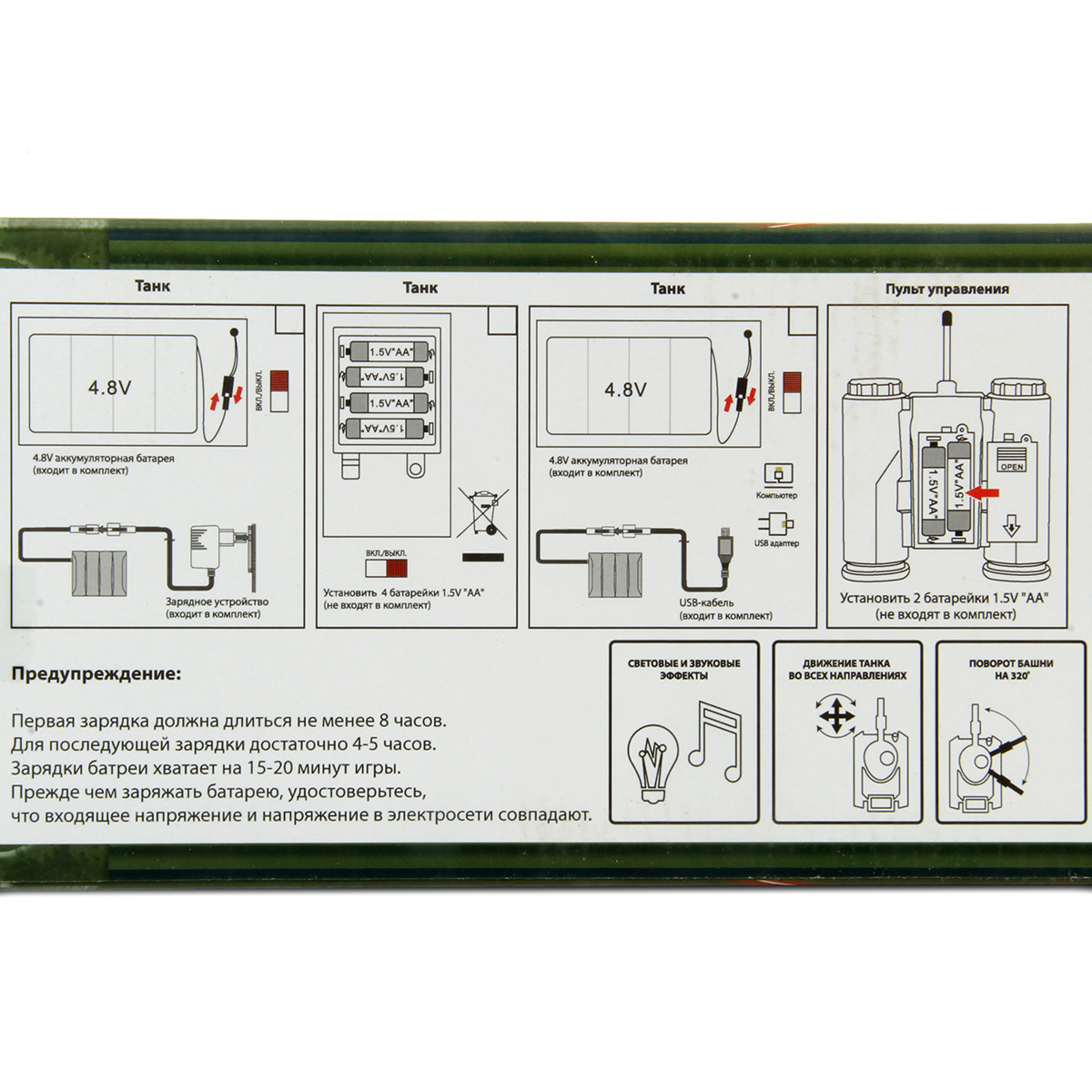 Каждый танк работает от аккумулятора 4.8 V, входят в комплект.