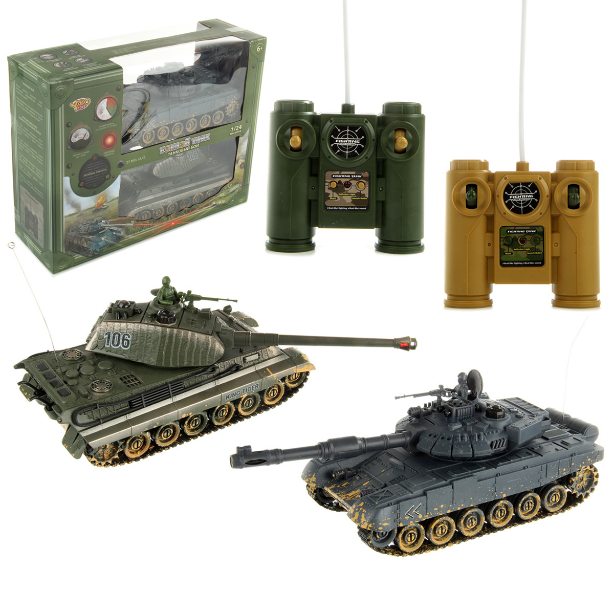 В комплект входят 2 танка, 2 пульта управления, 2 адаптера для зарядки, 2 аккумулятора 4.8 V.
