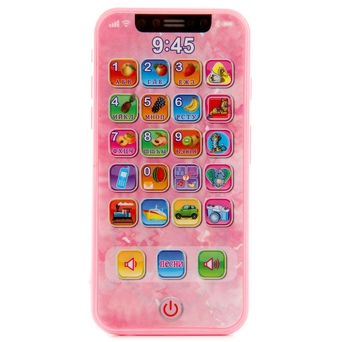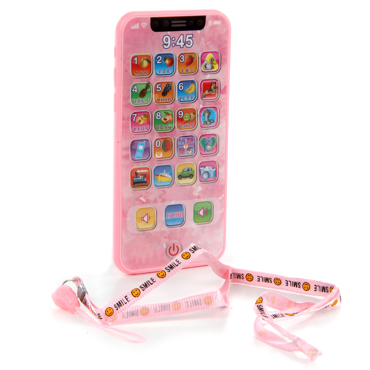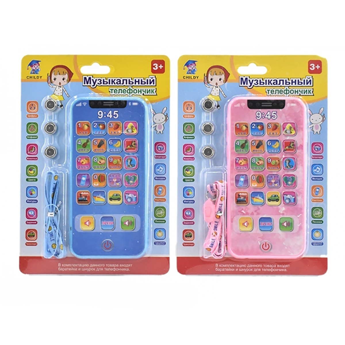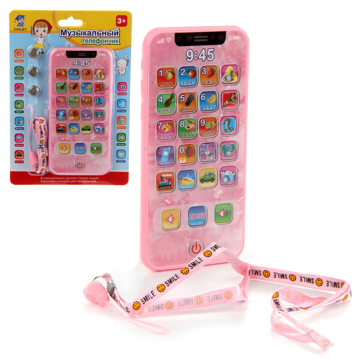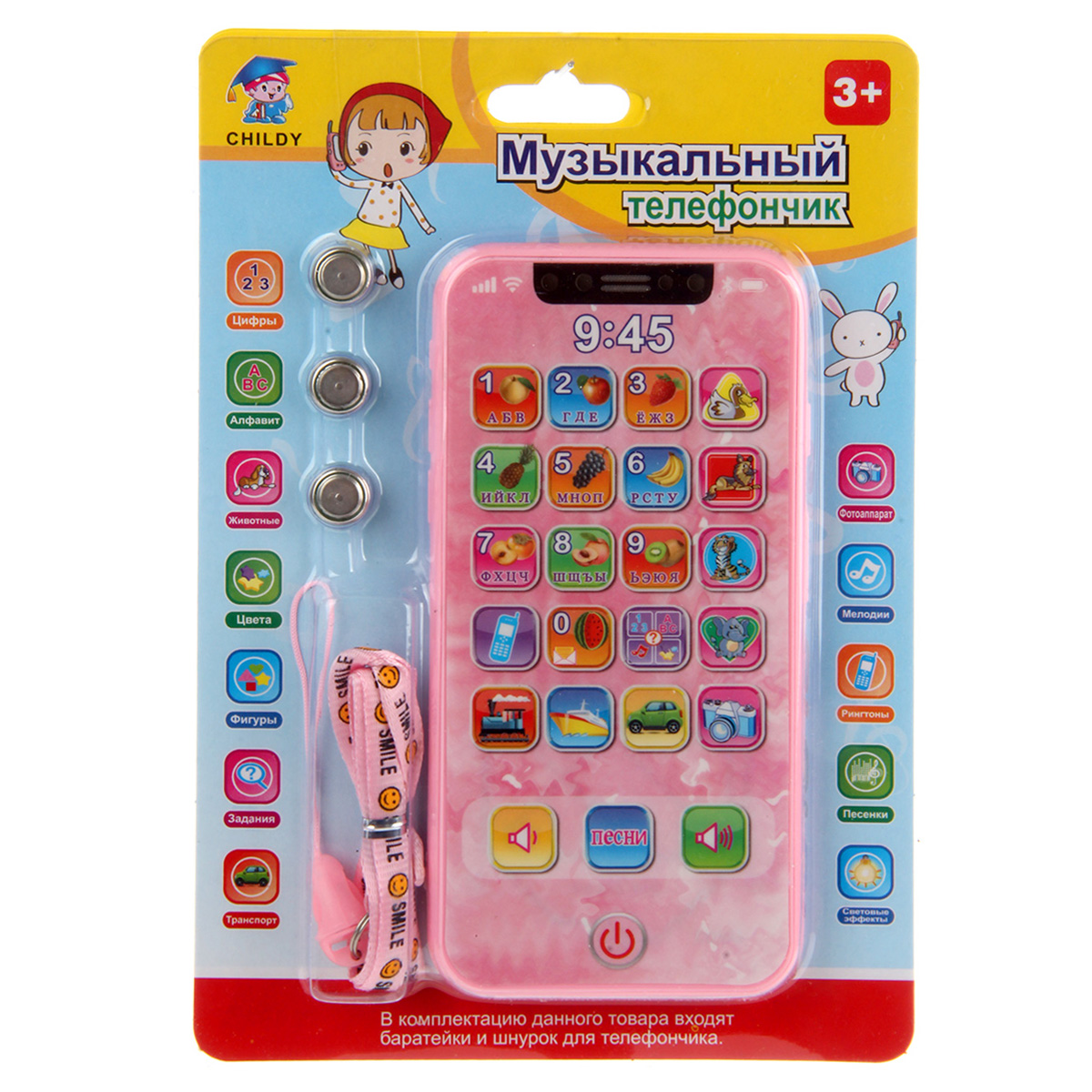 Отличная игрушка для развития малыша - обучающий телефончик. В комплект входит ремень, телефон. Телефон работает на батарейках AG-13 3 шт., входят в комплект. Функционал игрушки: -при включении смеётся, при выключении говорит пока; -при нажатии кнопок с животными называет их; -при нажатии кнопок с предметами издаёт характерные звуки; -при нажатии кнопки камера подсвечивается; -при нажатии цифр называет их, при повторном нажатии называет буквы, издаёт звук нажатия кнопки, проигрывает мелодию; -громкость регулируется; -умеет петь 2 песни, на русском языке. Размеры упаковки: 19*2*13 см. Размеры телефона: 14*1*7 см. Изготовлено из пластика.
