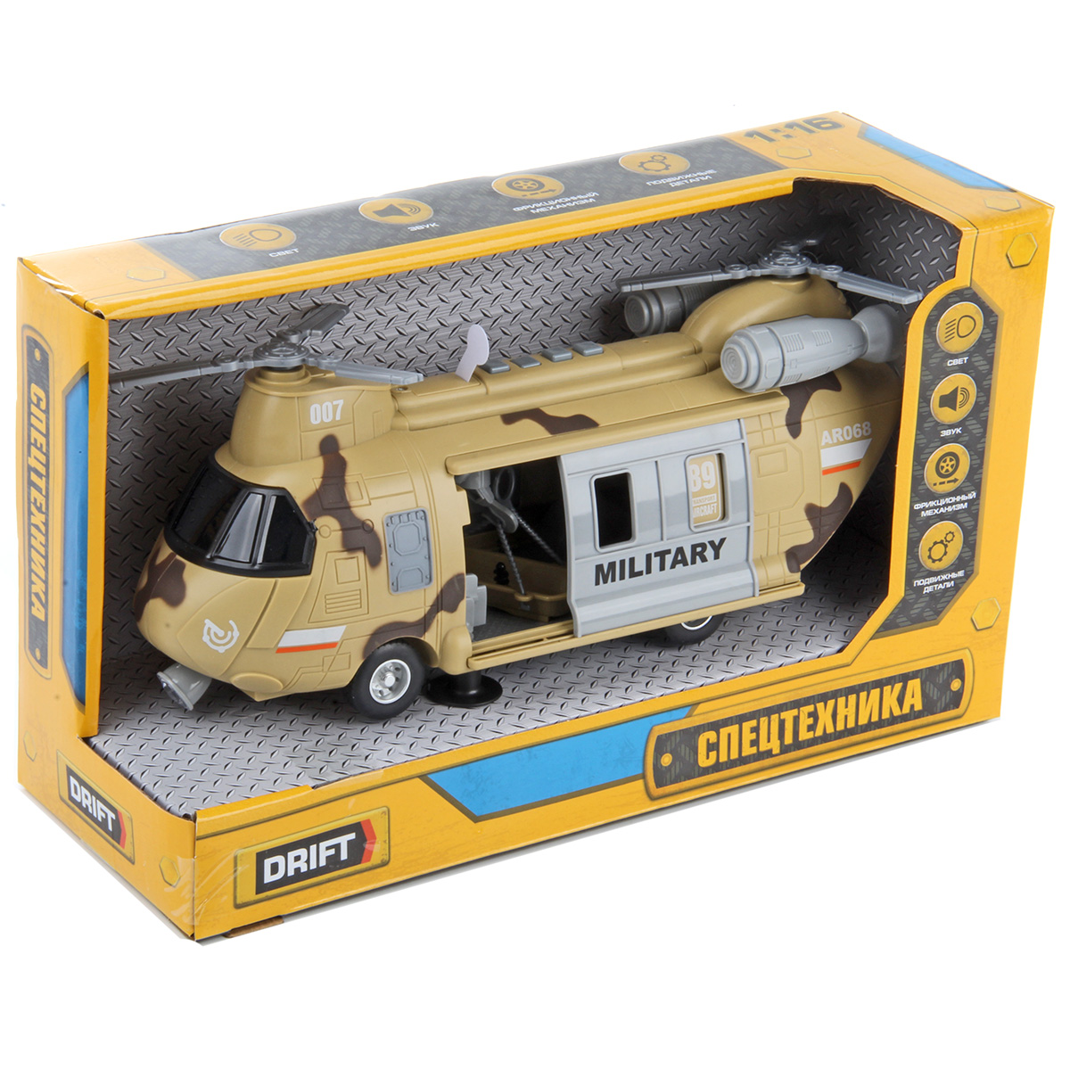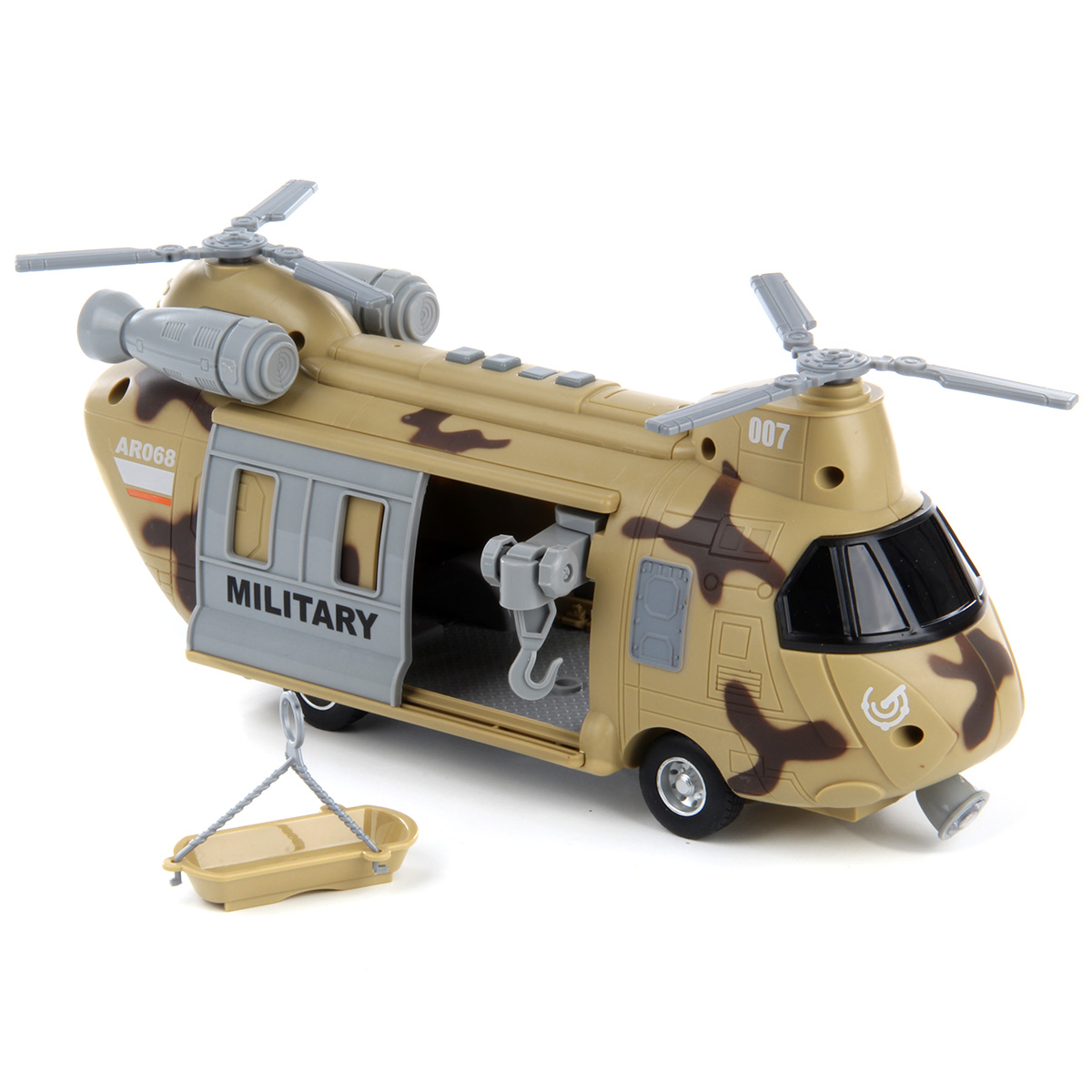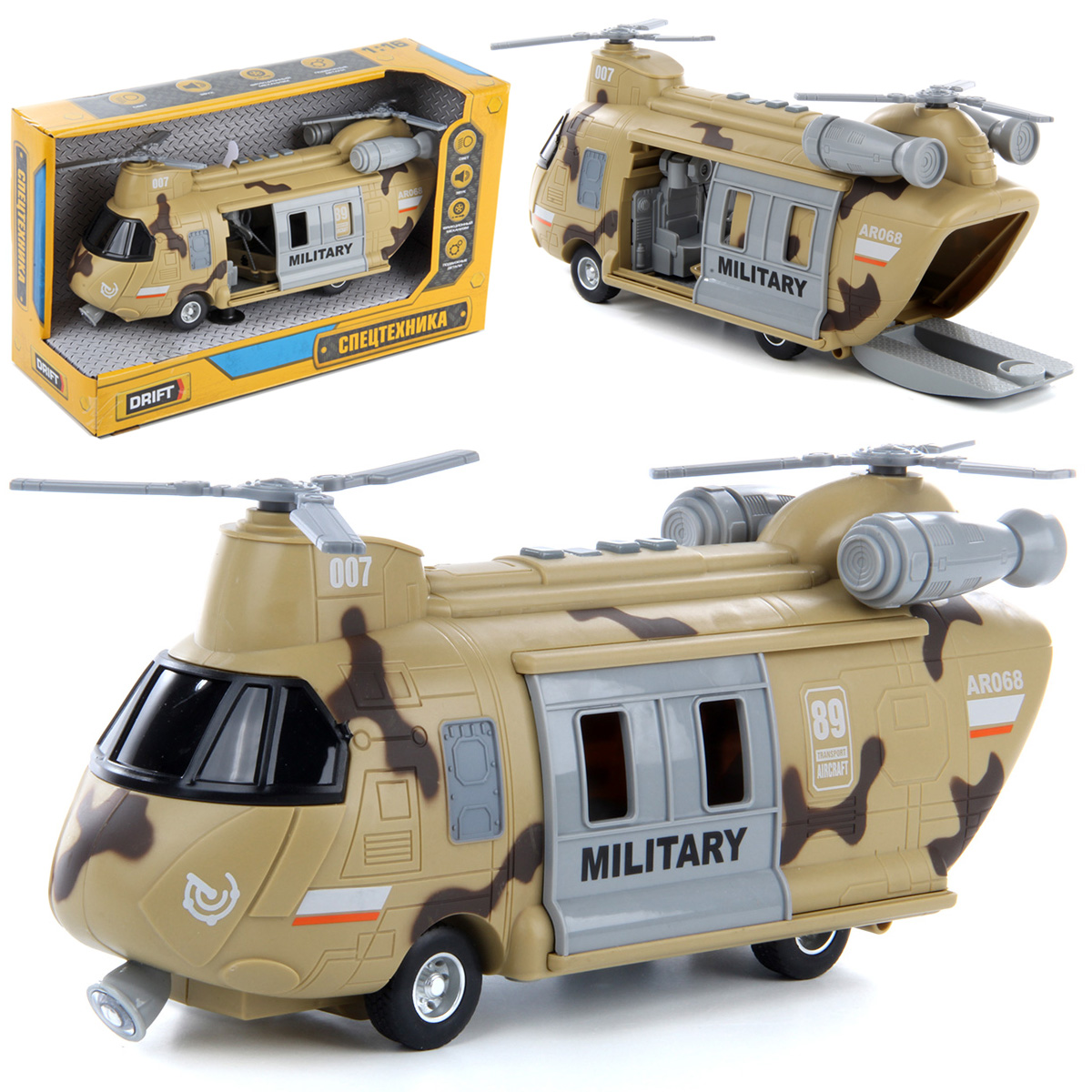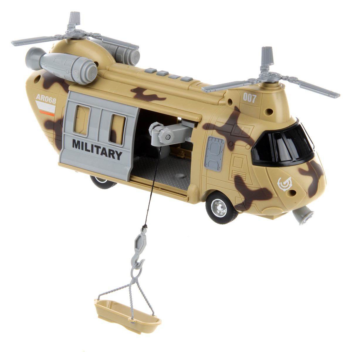 Игрушечный вертолёт с подвижными элементами и световыми и звуковыми эффектами. Фрикционный механизм, катается вперёд и назад, лопасти крутятся, двери открываются и закрываются. Рампа откидывается, люлька крепится к крану, кран выдвигается из обоих дверей, верёвка сматывается и разматывается. При включении издаёт звуки воздушного транспорта, сирены, в салоне мигает лампочка. Детский вертолетик изготовлен из прочных и долговечных материалов в качественном исполнении. Оформлен в стильной военной расцветке.
