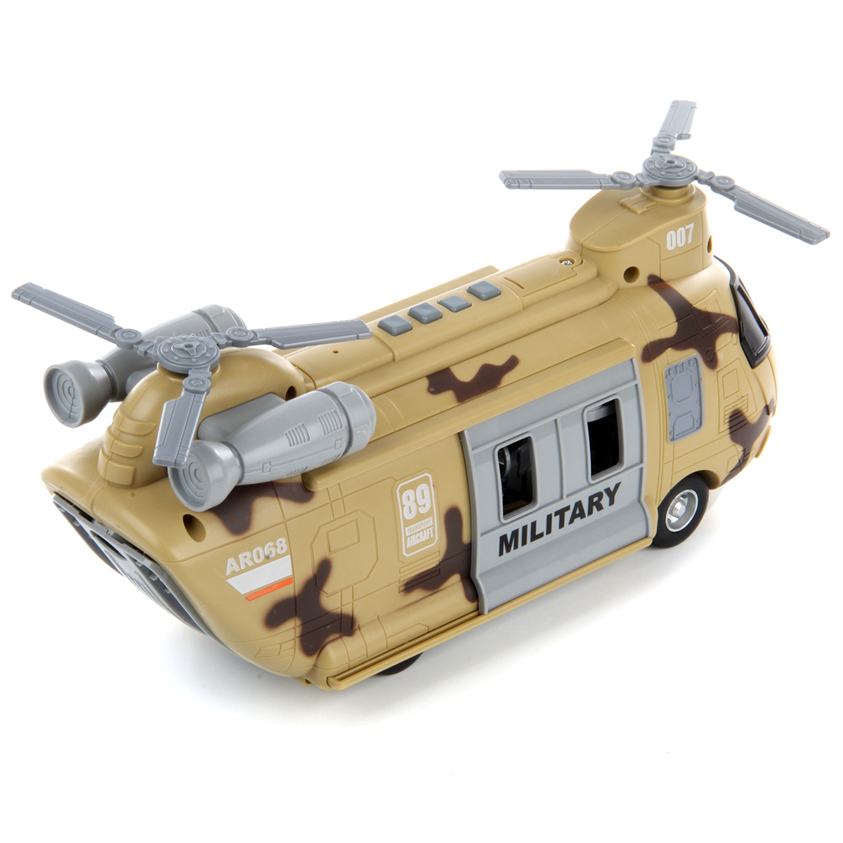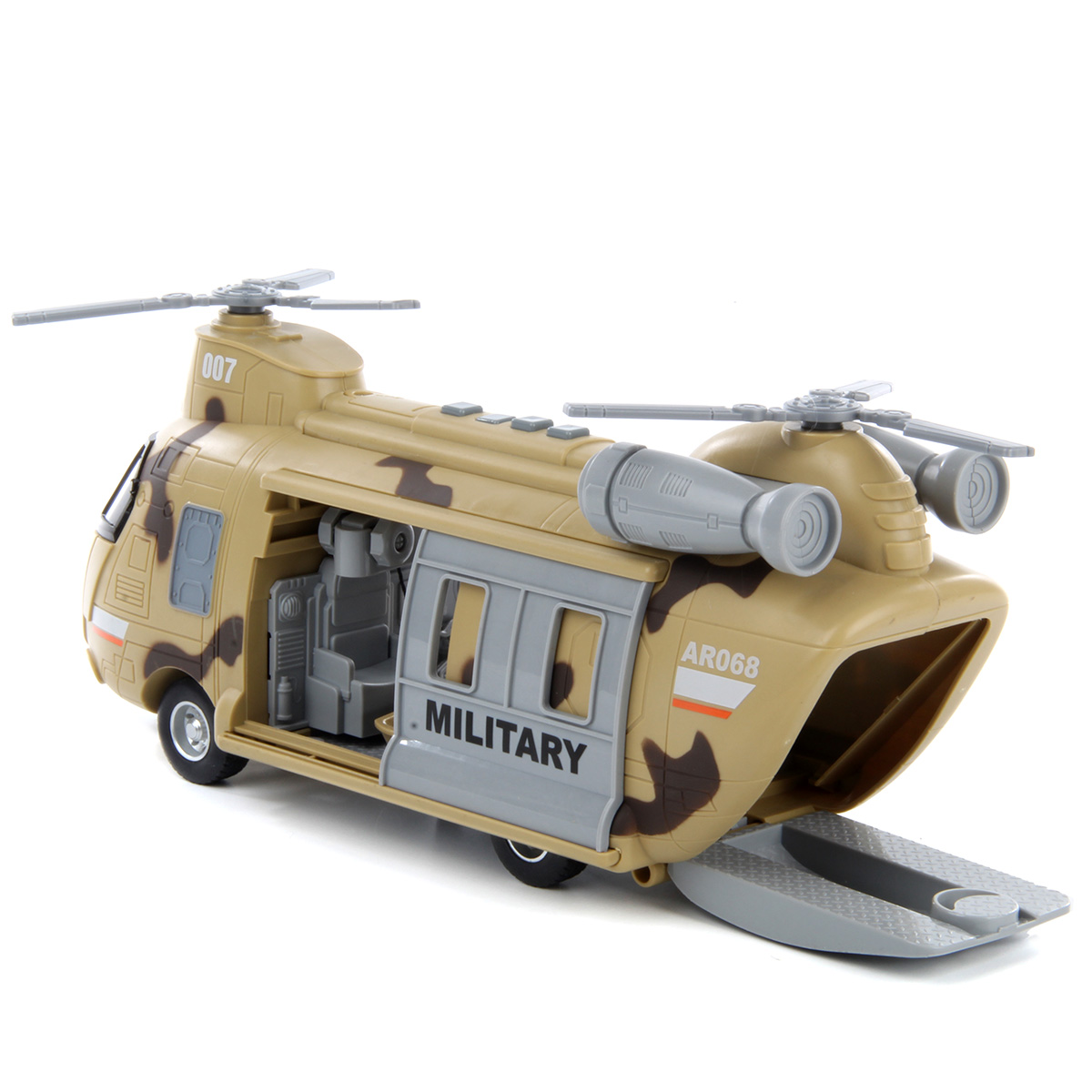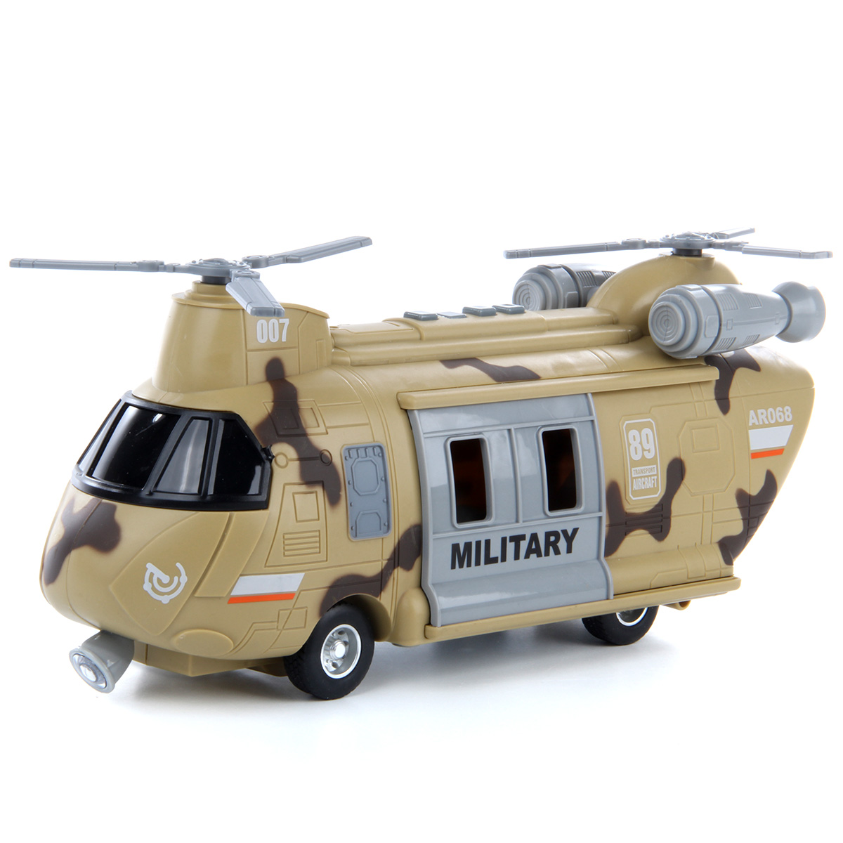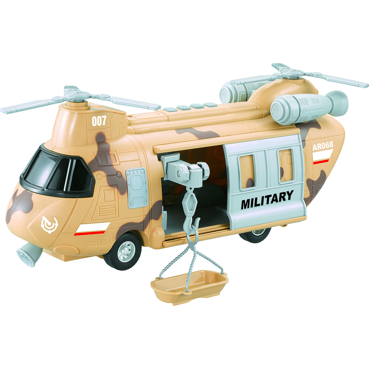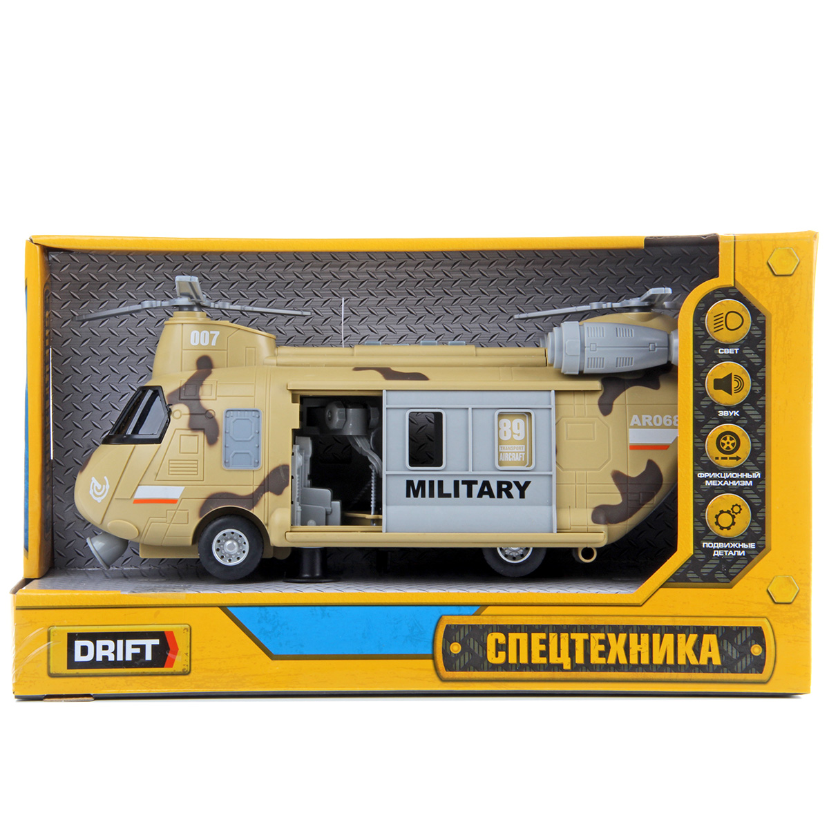 Игрушечный вертолёт с подвижными элементами и световыми и звуковыми эффектами. Фрикционный механизм, катается вперёд и назад, лопасти крутятся, двери открываются и закрываются. Рампа откидывается, люлька крепится к крану, кран выдвигается из обоих дверей, верёвка сматывается и разматывается. При включении издаёт звуки воздушного транспорта, сирены, в салоне мигает лампочка. Детский вертолетик изготовлен из прочных и долговечных материалов в качественном исполнении. Оформлен в стильной военной расцветке.