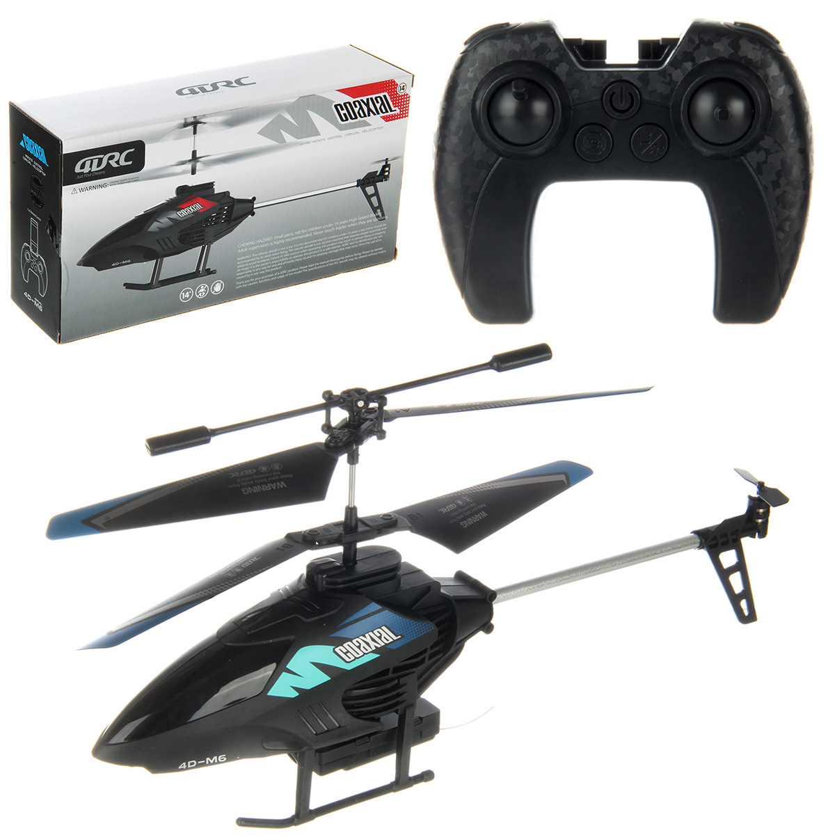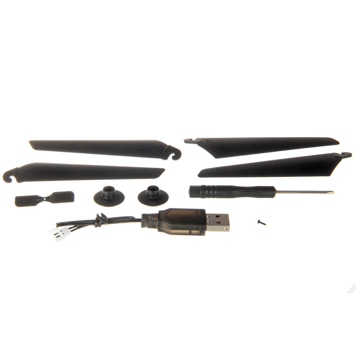 В наборе вертолет, пульт управления, 4 запасные лопасти, запасная лопасть на хвостовой винт, 2 болтика, 2 стика на пульт, USB кабель, крестовая отвертка, подставка для пульта и телефона, инструкция на английском языке, мануал на английском и китайском языках.