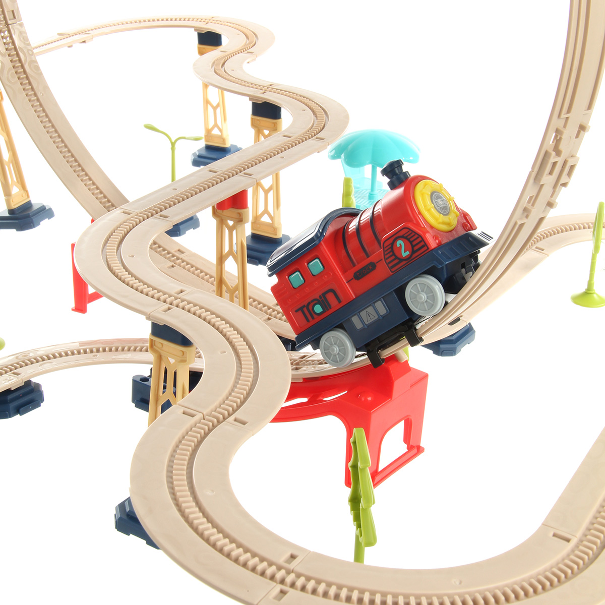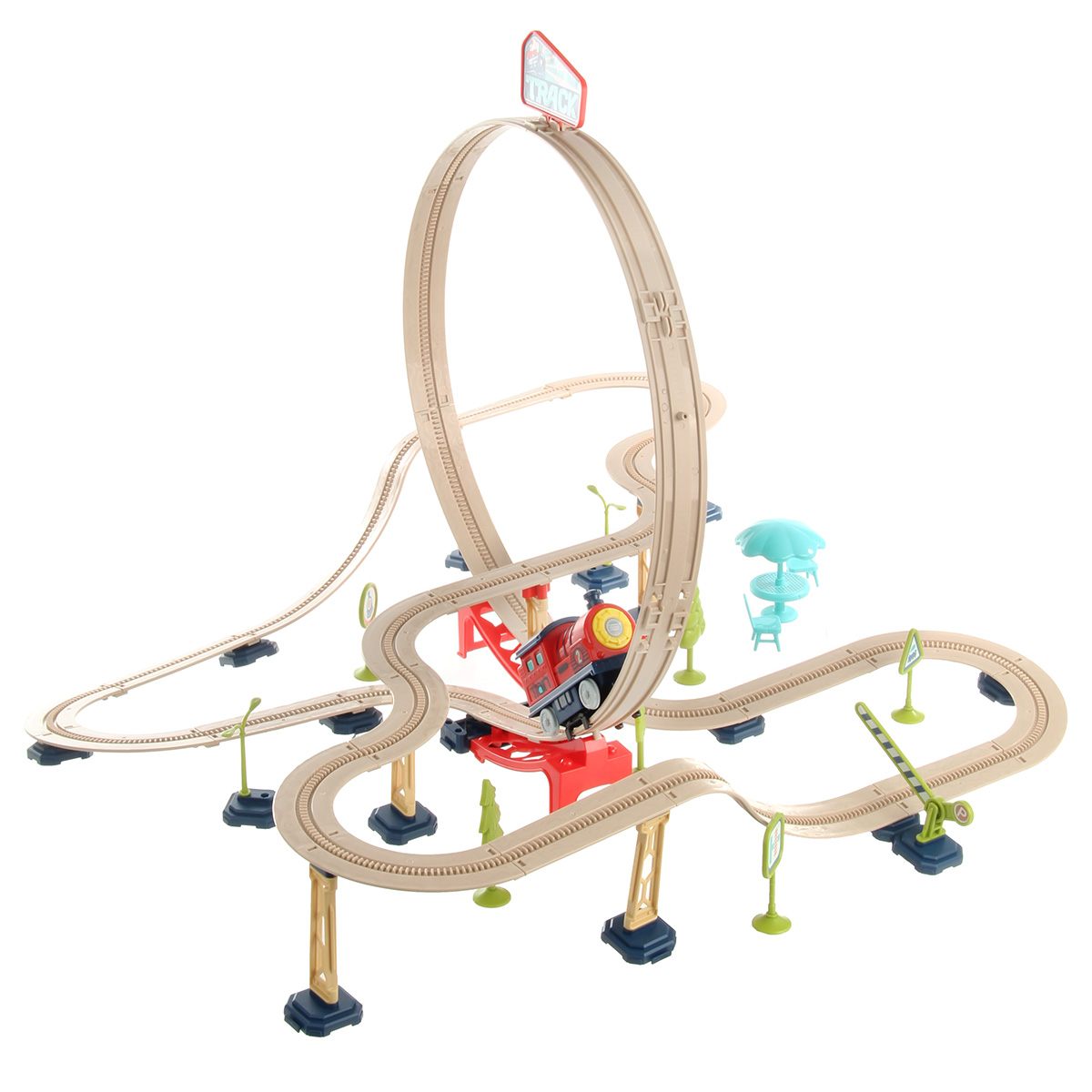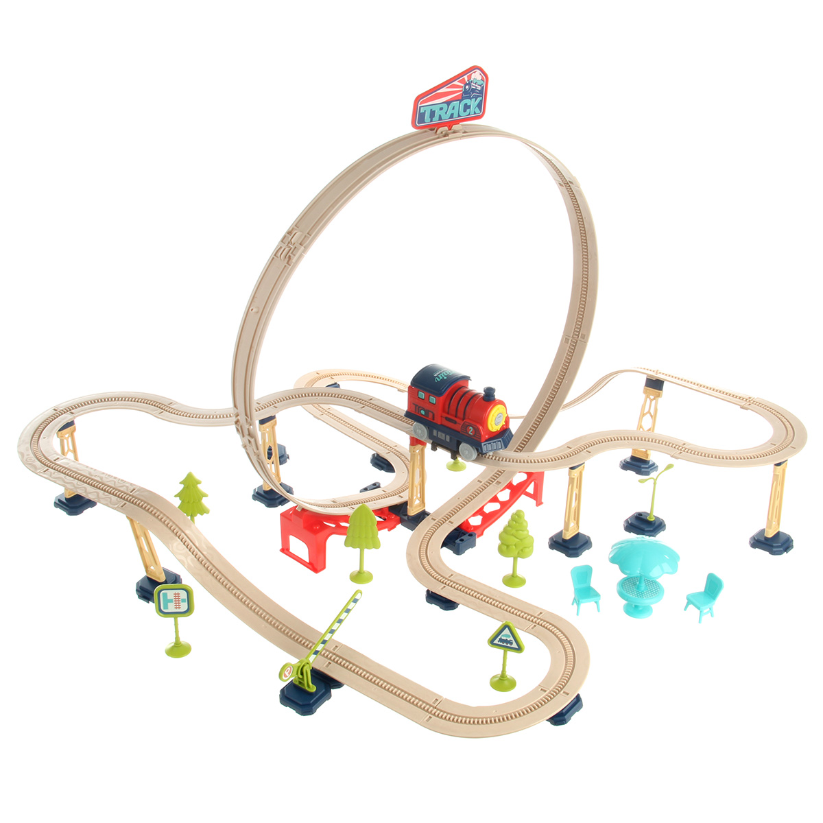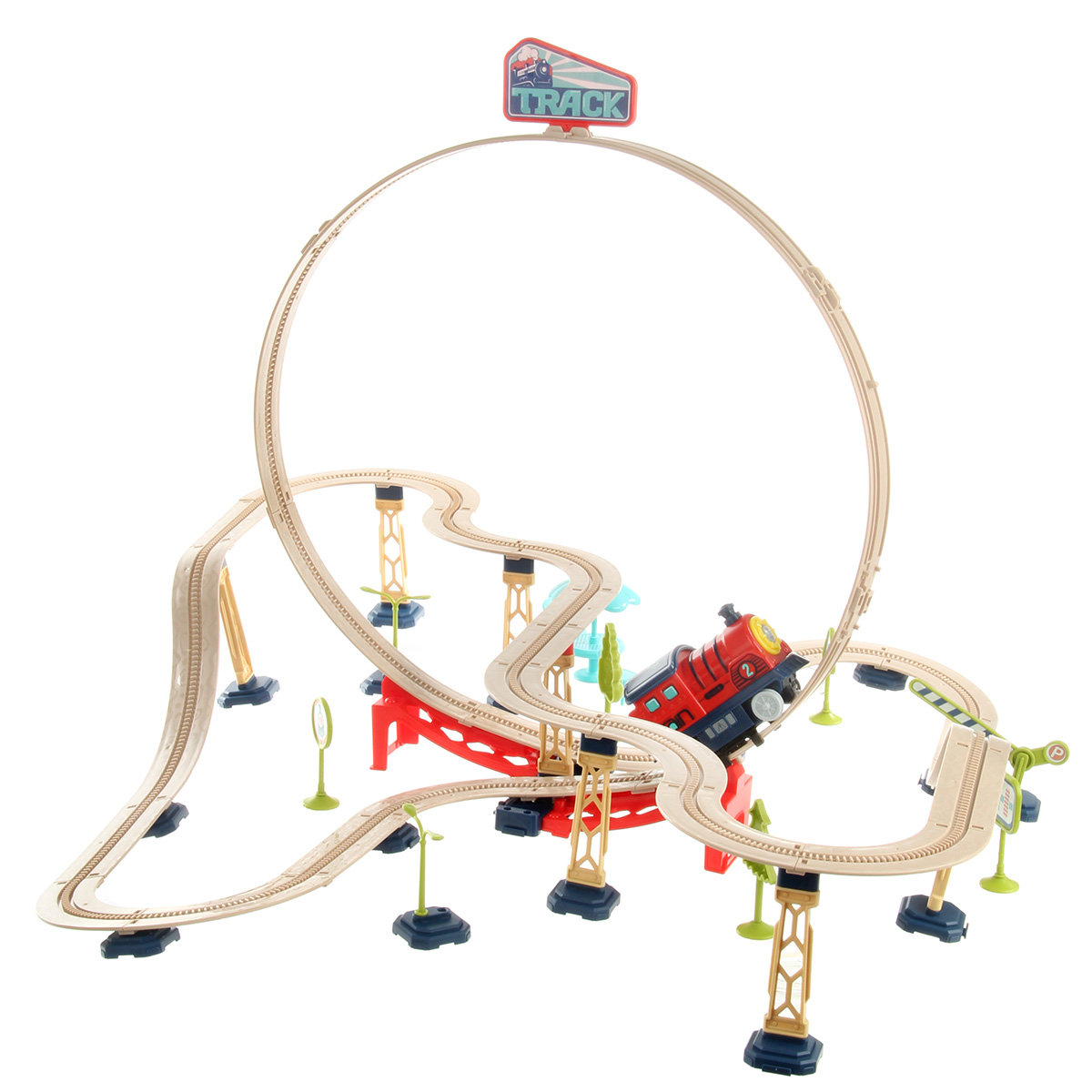 Трек игрушечный с паровозиком, который умеет ездить по Мертвой петле. Очень простая сборка, множество элементов, яркая расцветка, привлекающая внимание, железная дорога в компактном размере с миниатюрными предметами.