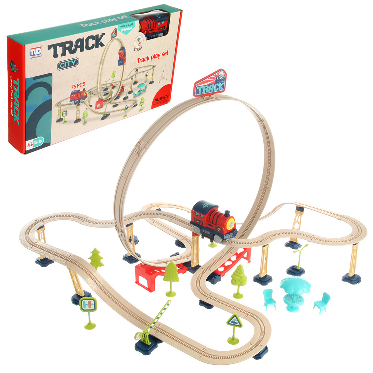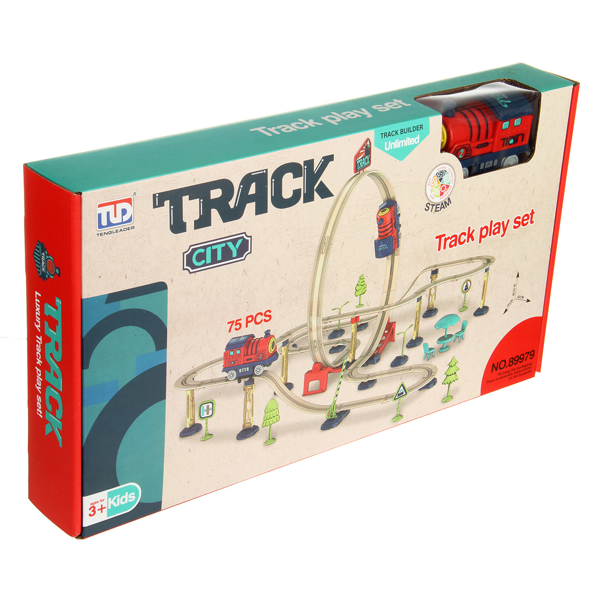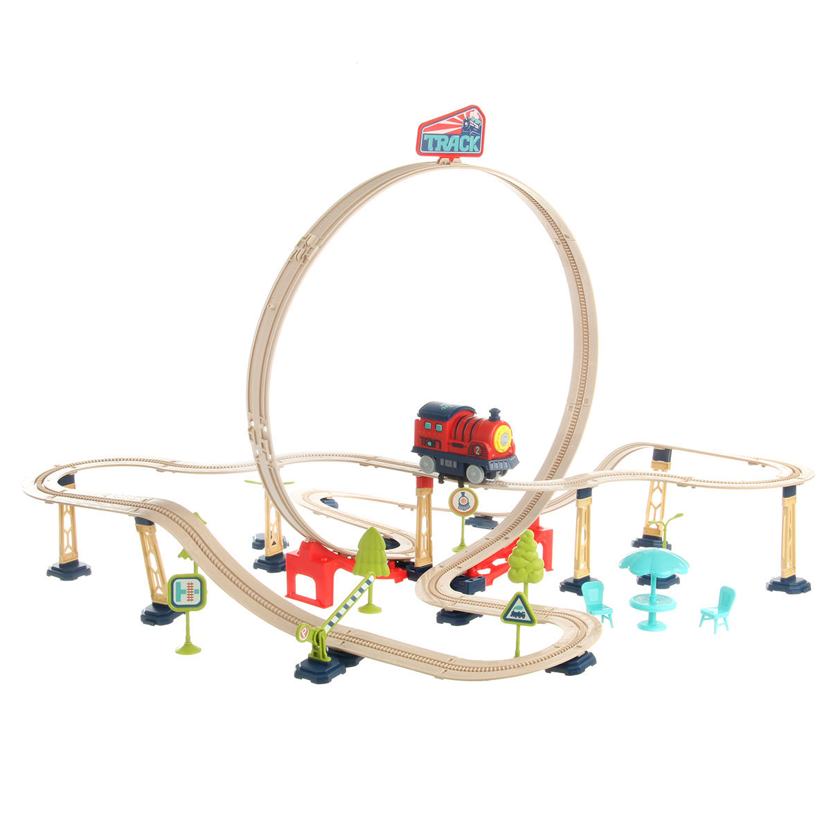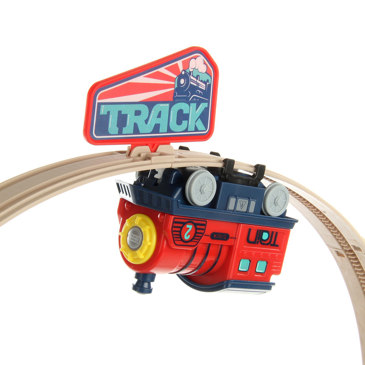 Трек игрушечный с паровозиком, который умеет ездить по Мертвой петле. Очень простая сборка, множество элементов, яркая расцветка, привлекающая внимание, железная дорога в компактном размере с миниатюрными предметами.