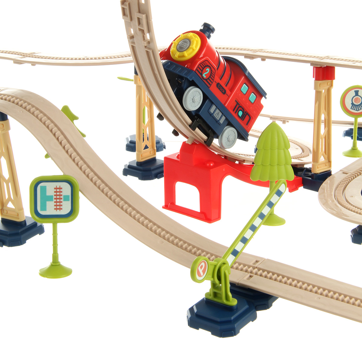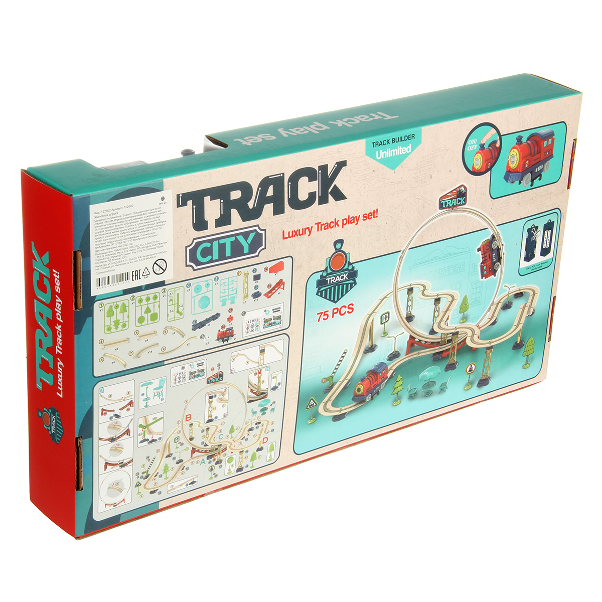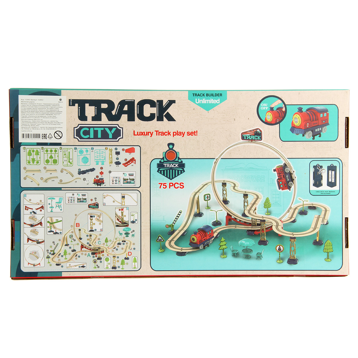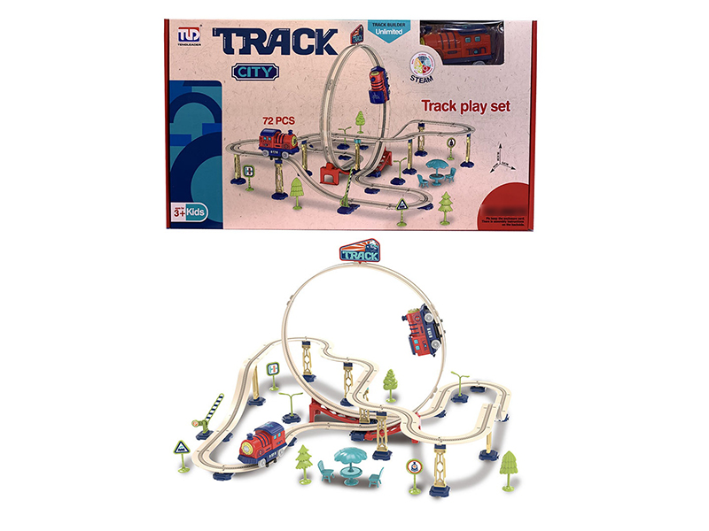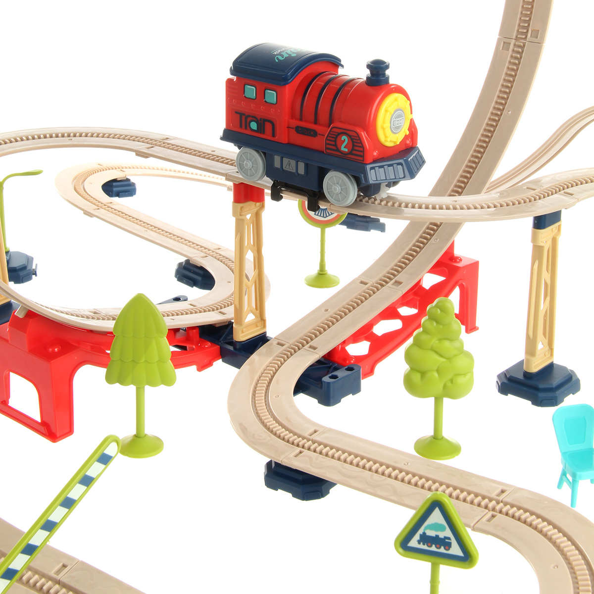 Трек игрушечный с паровозиком, который умеет ездить по Мертвой петле. Очень простая сборка, множество элементов, яркая расцветка, привлекающая внимание, железная дорога в компактном размере с миниатюрными предметами.