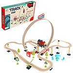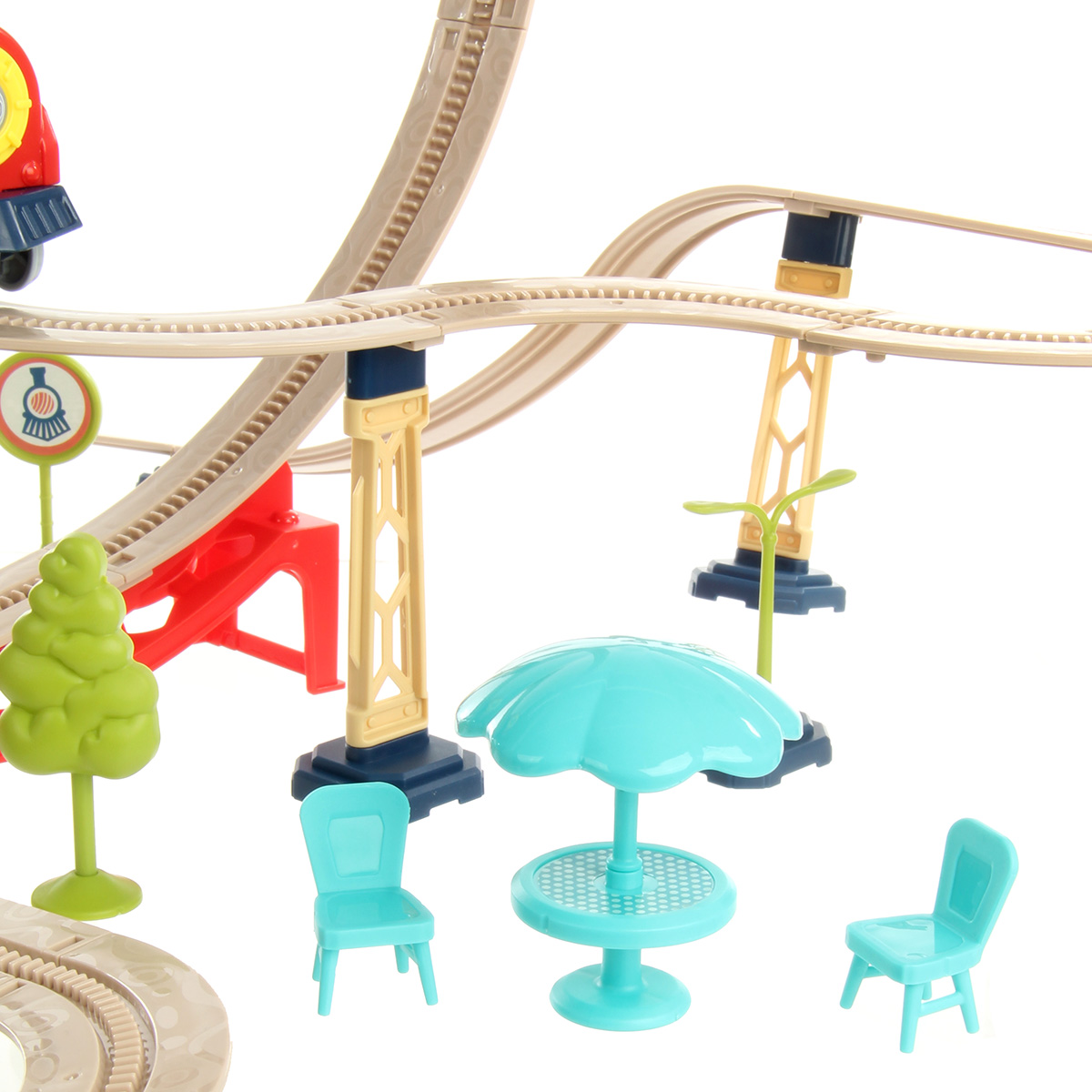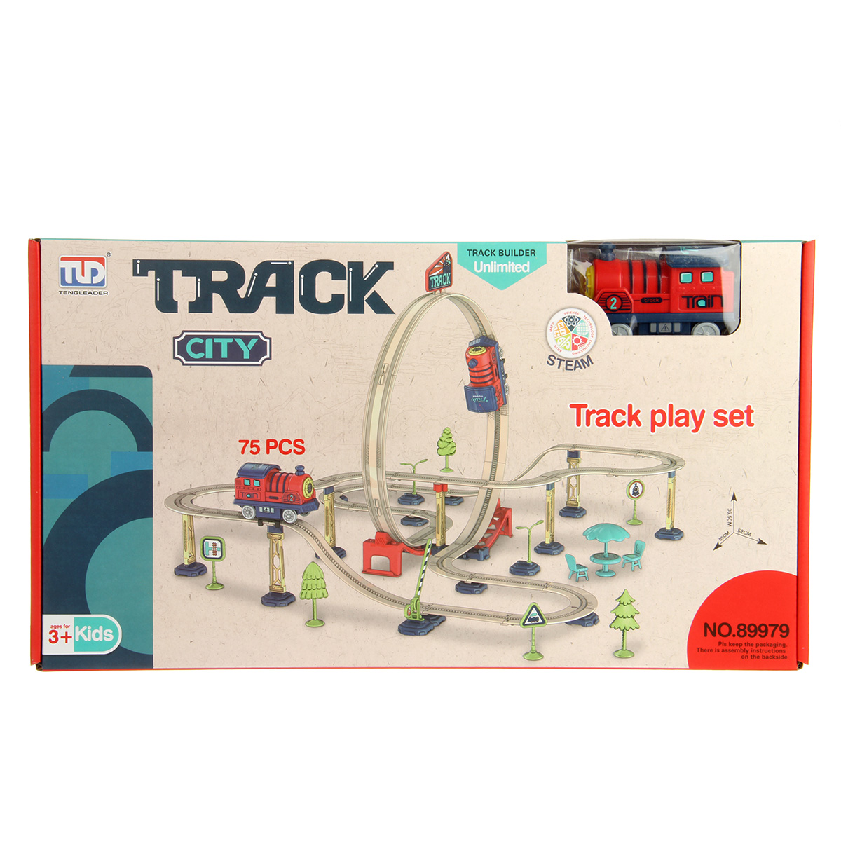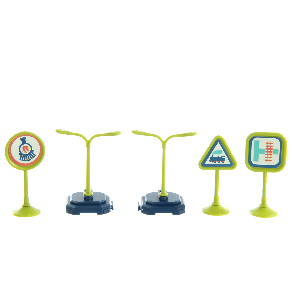В комплекте детали для сборки трека, паровозик, 2 фонаря, зонтик, 2 стула, 3 дорожных знака, 3 деревца, набор наклеек.