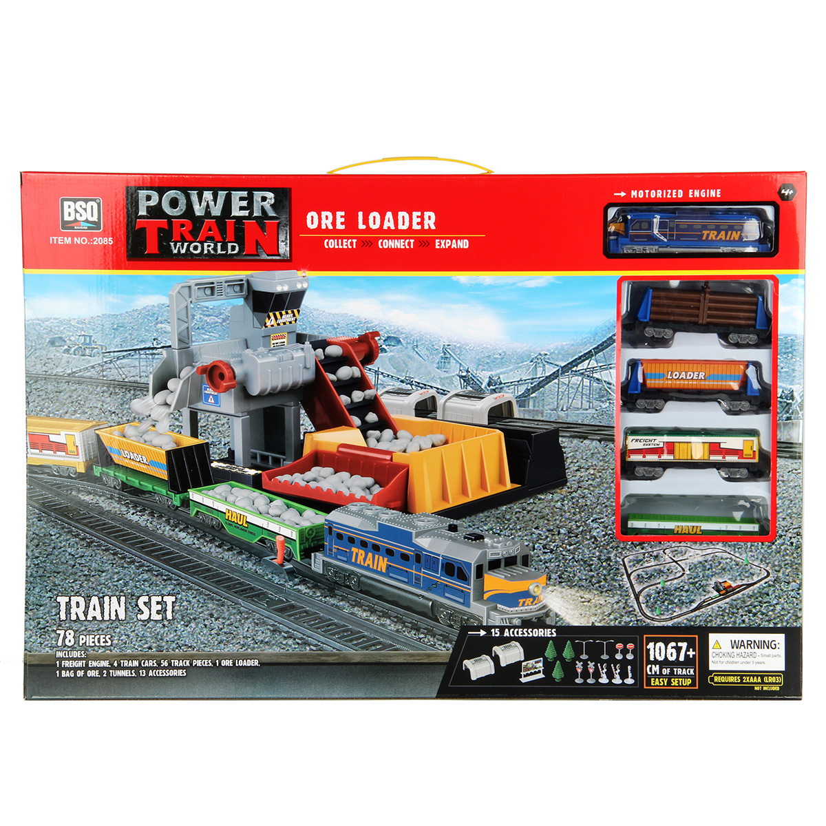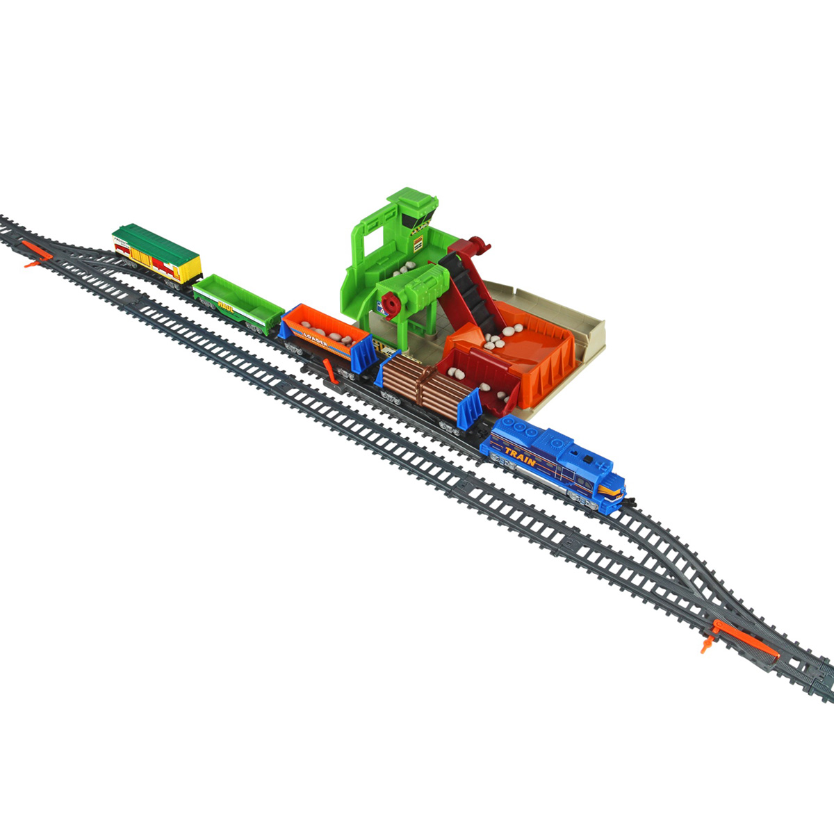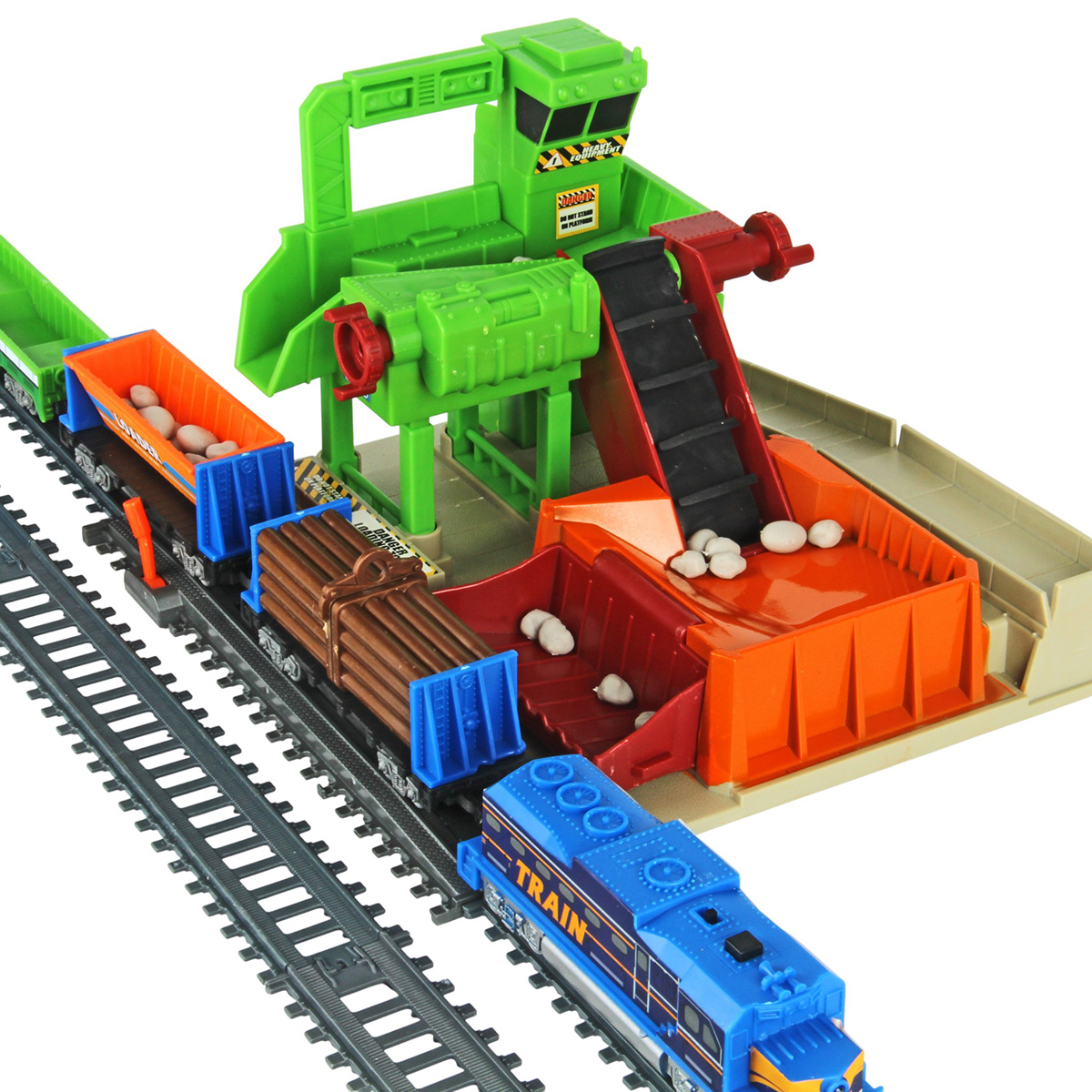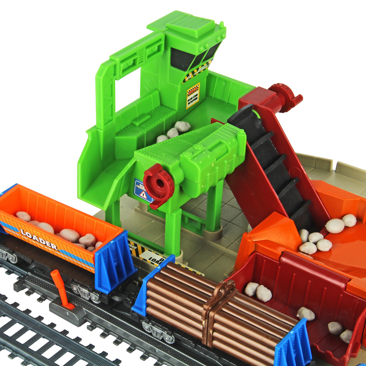 Игрушечная железная дорога с каменоломней, множеством аксессуаров, подсветкой. Легкая сборка, движение локомотива вперёд, 2 скорости, более быстрая и более медленная, подсветка носового фонаря, каменоломня с подвижной транспортной лентой, доставка грузов на верхний этаж, можно поместить каменную породу в вагон самосвал. Смена направления движения поезда путем перевода стрелочных механизмов, железнодорожный переезд с функцией остановки движения локомотива. Игрушка изготовлена из прочных и безопасных материалов в качественном исполнении с вниманием к деталям.