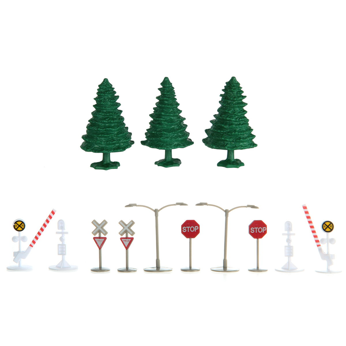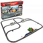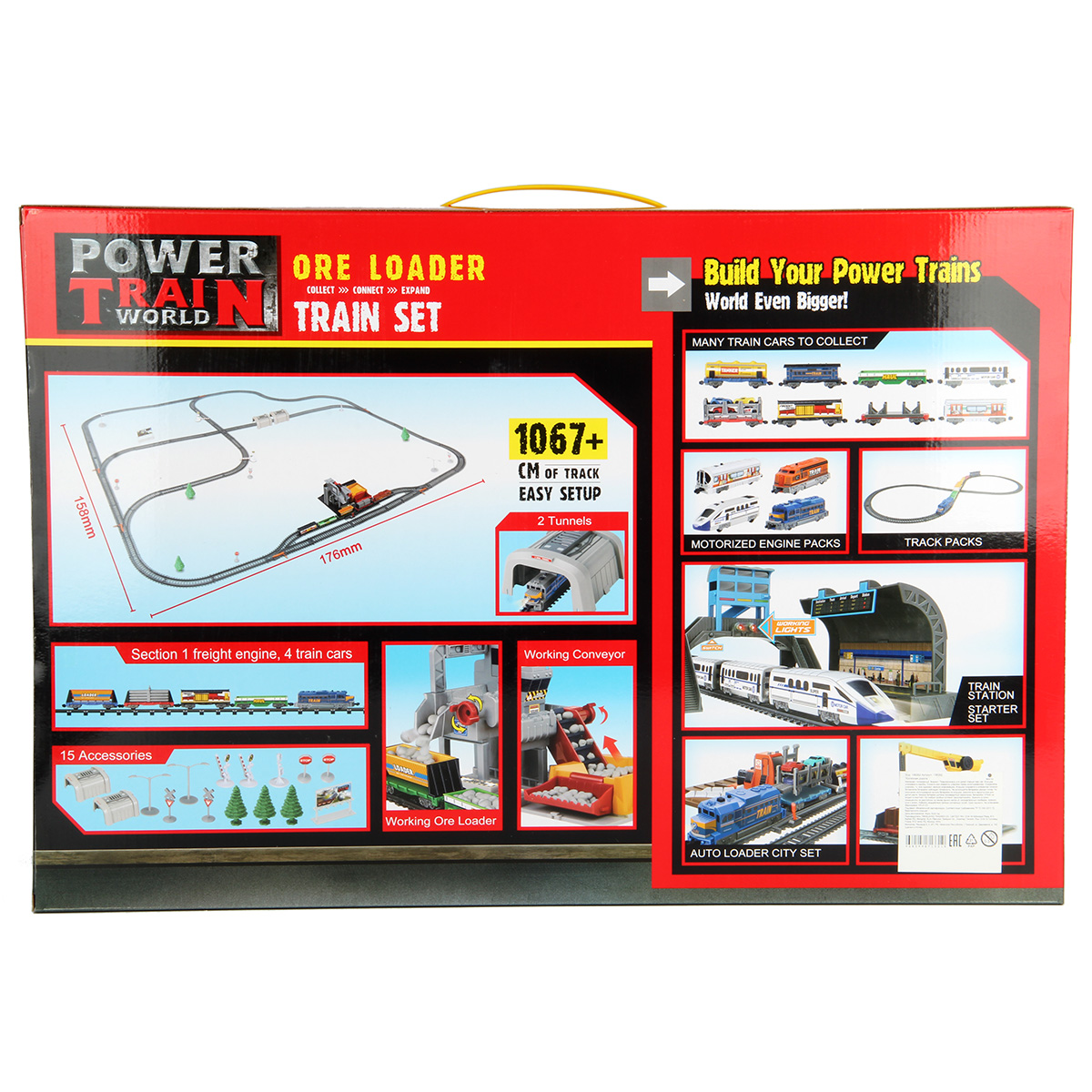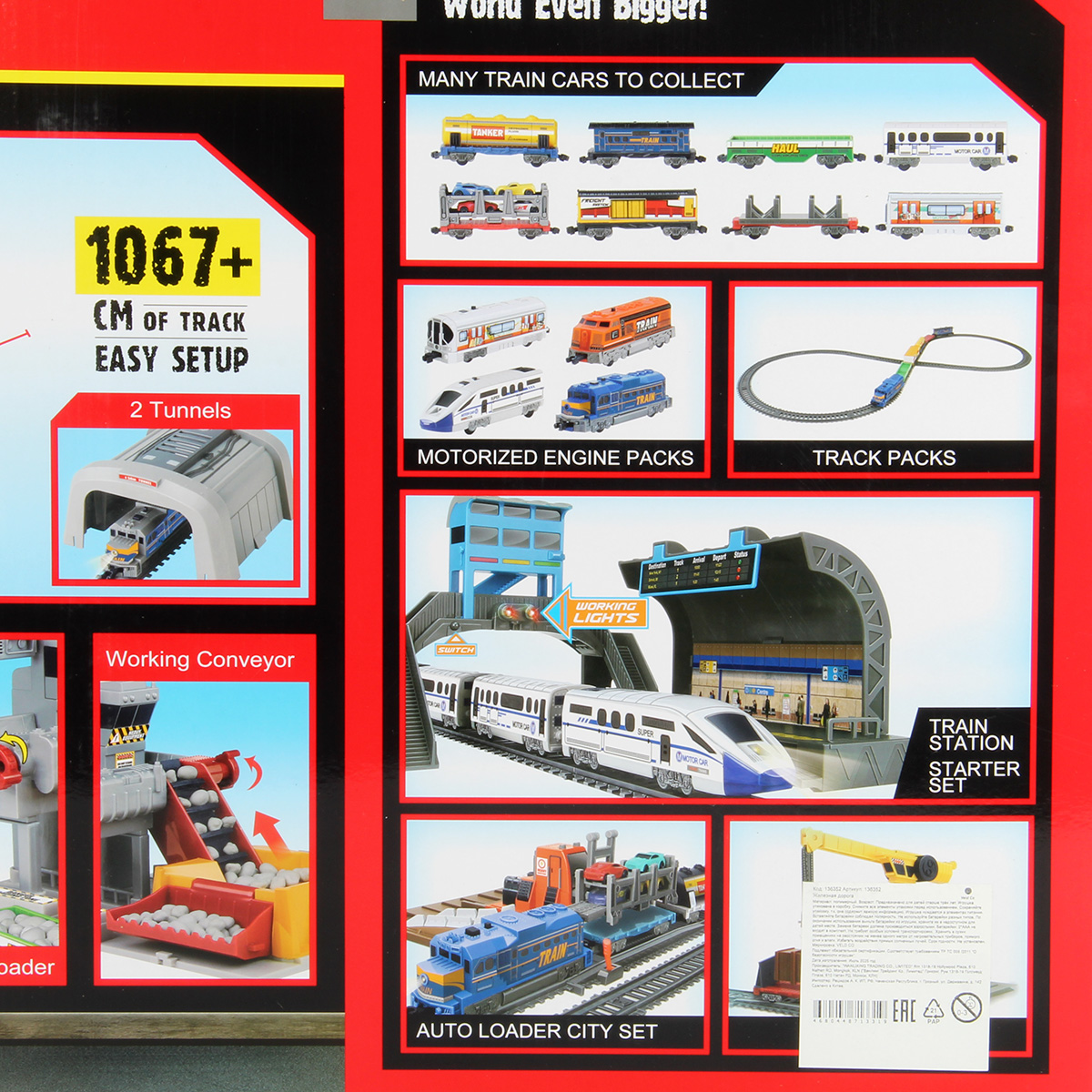 Детали для сборки железной дороги, детали для сборки каменоломни, 1 локомотив, 4 вагона, 3 дерева, 8 дорожных знаков, билборд, 32 фигурки имитации горной породы, инструкция на английском языке.