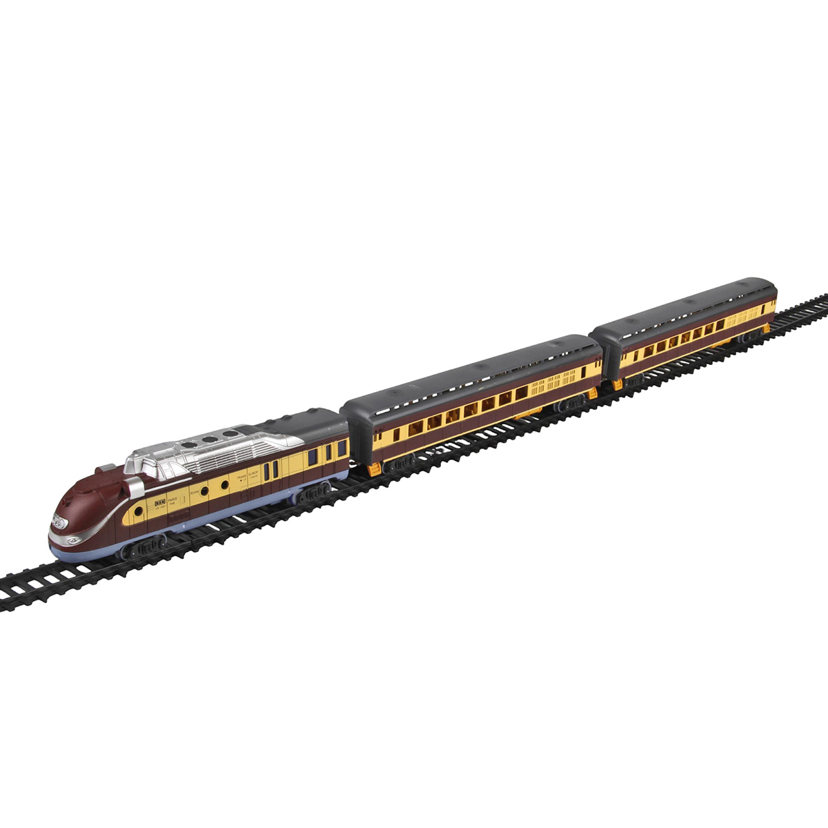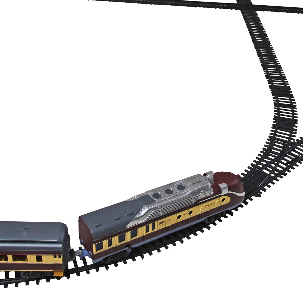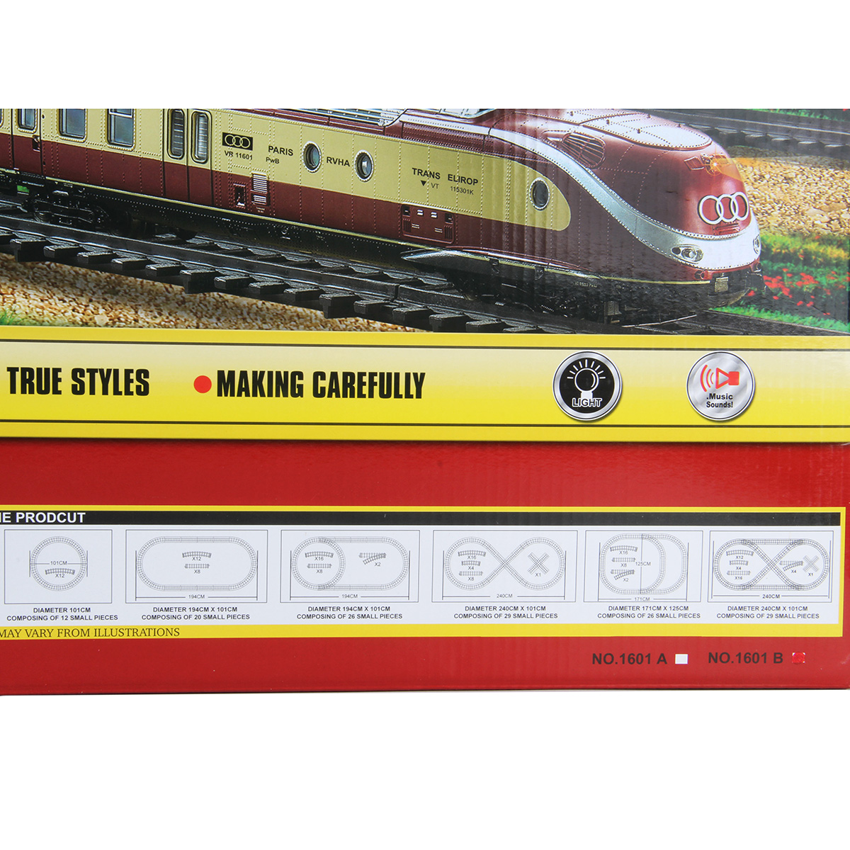 1. При передвижении бокового рычага локомотив едет вперёд, красная подсветка носового фонаря, звуки гудка, стука колес, железнодорожного переезда. Вагоны и локомотив соединяются сцепкой.