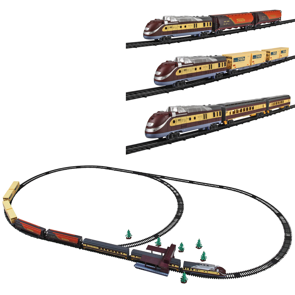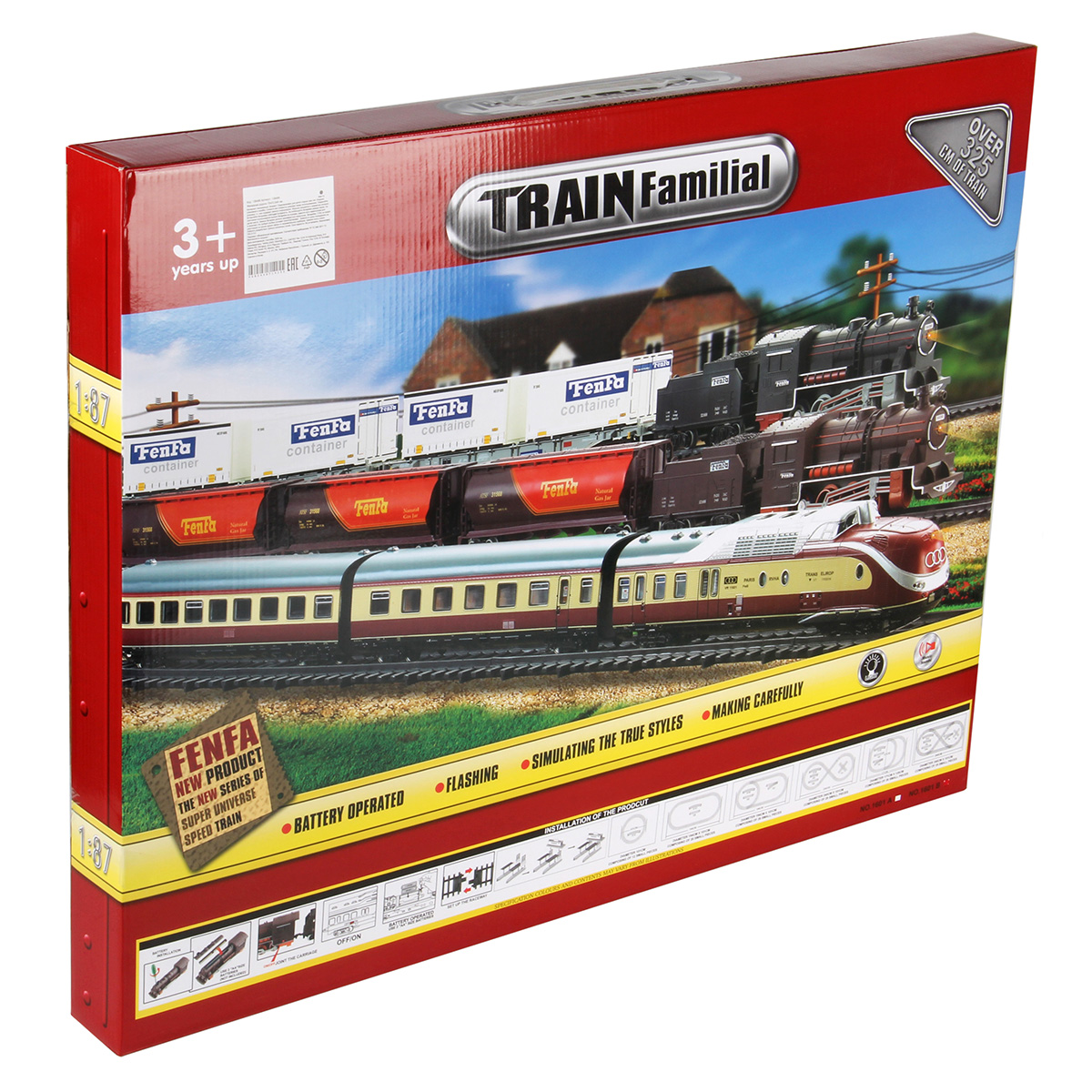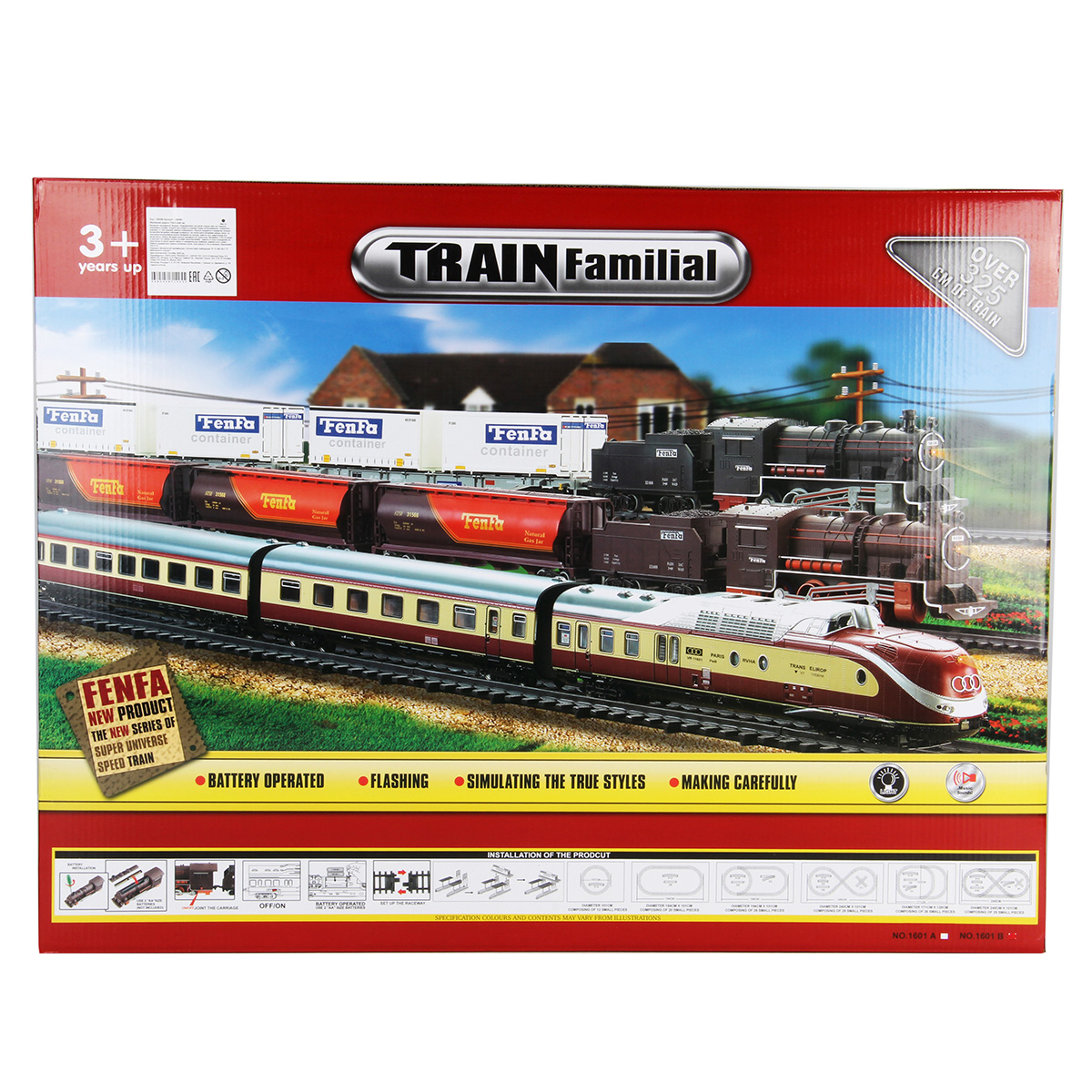 Игровая железная дорога с большим количеством аксессуаров. Локомотив на батарейках, едет вперёд, красная подсветка носового фонаря, звуки гудка, стука колес, железнодорожного переезда. Вагоны и локомотив соединяются сцепкой. Железная дорога легко собирается и разбирается, различные варианты сборки, в виде круга, в виде восьмерки, в виде овала. Игрушка изготовлена из прочных и долговечных материалов в качественном исполнении.