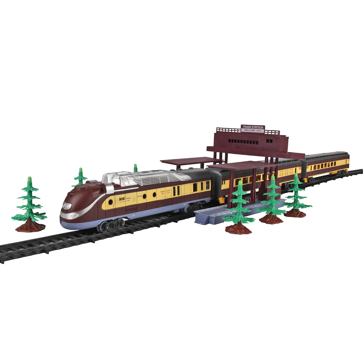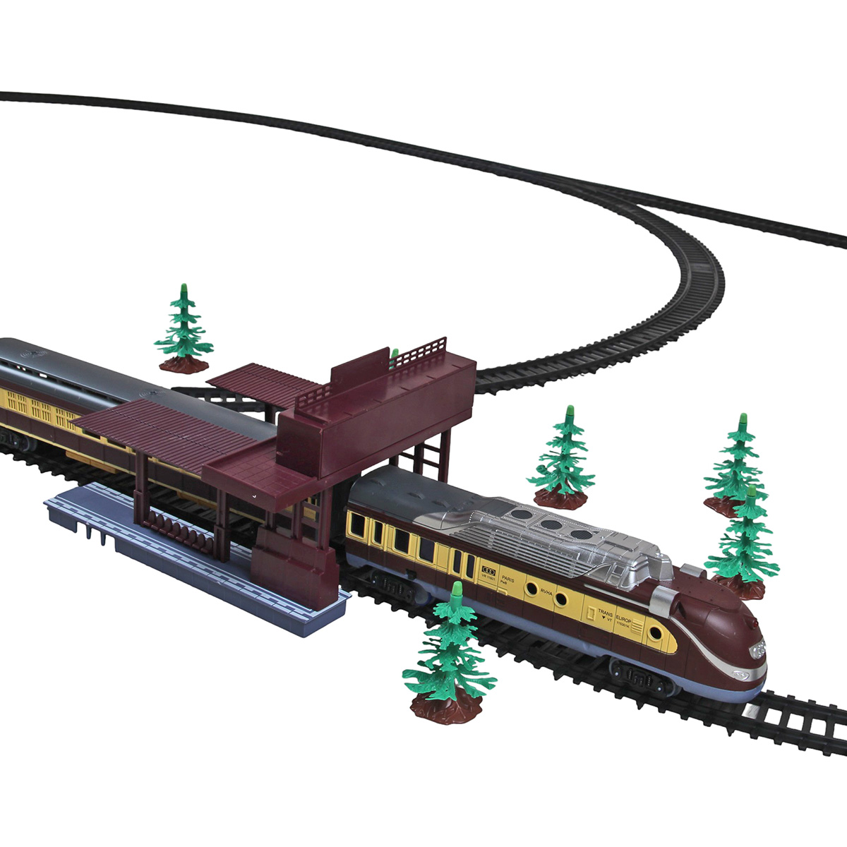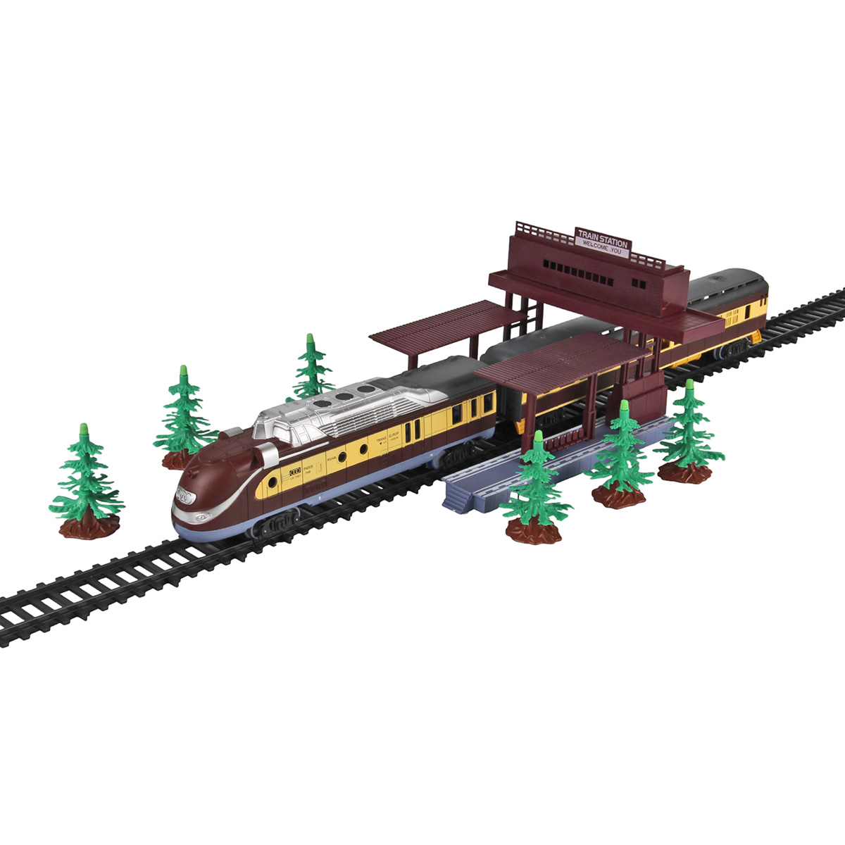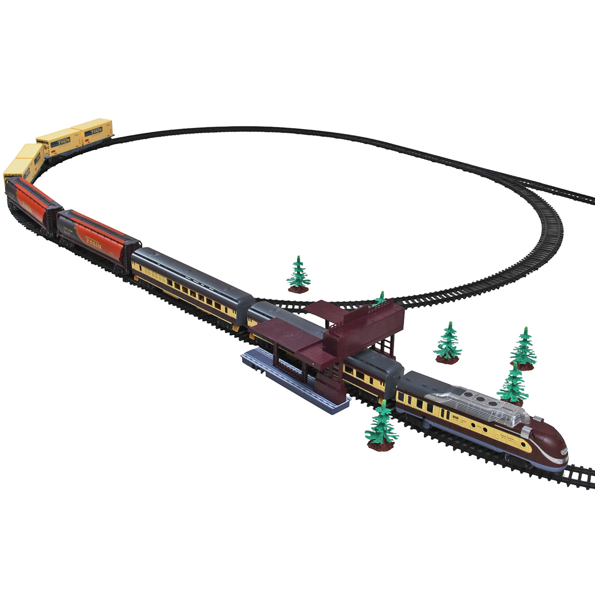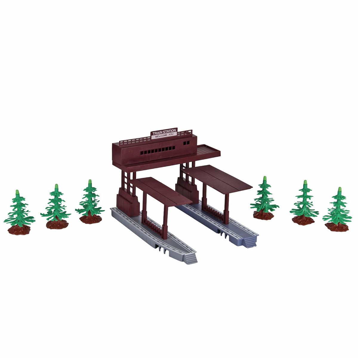 Детали для сборки железной дороги 41 шт, 6 вагонов, 1 локомотив, остановка, 5 деревьев.