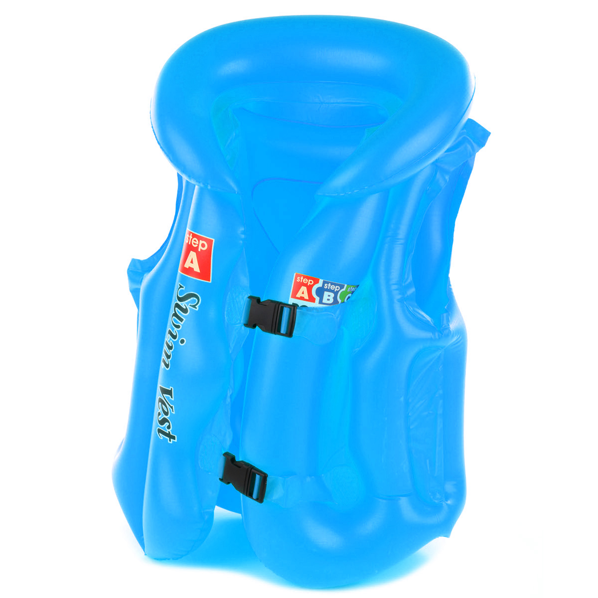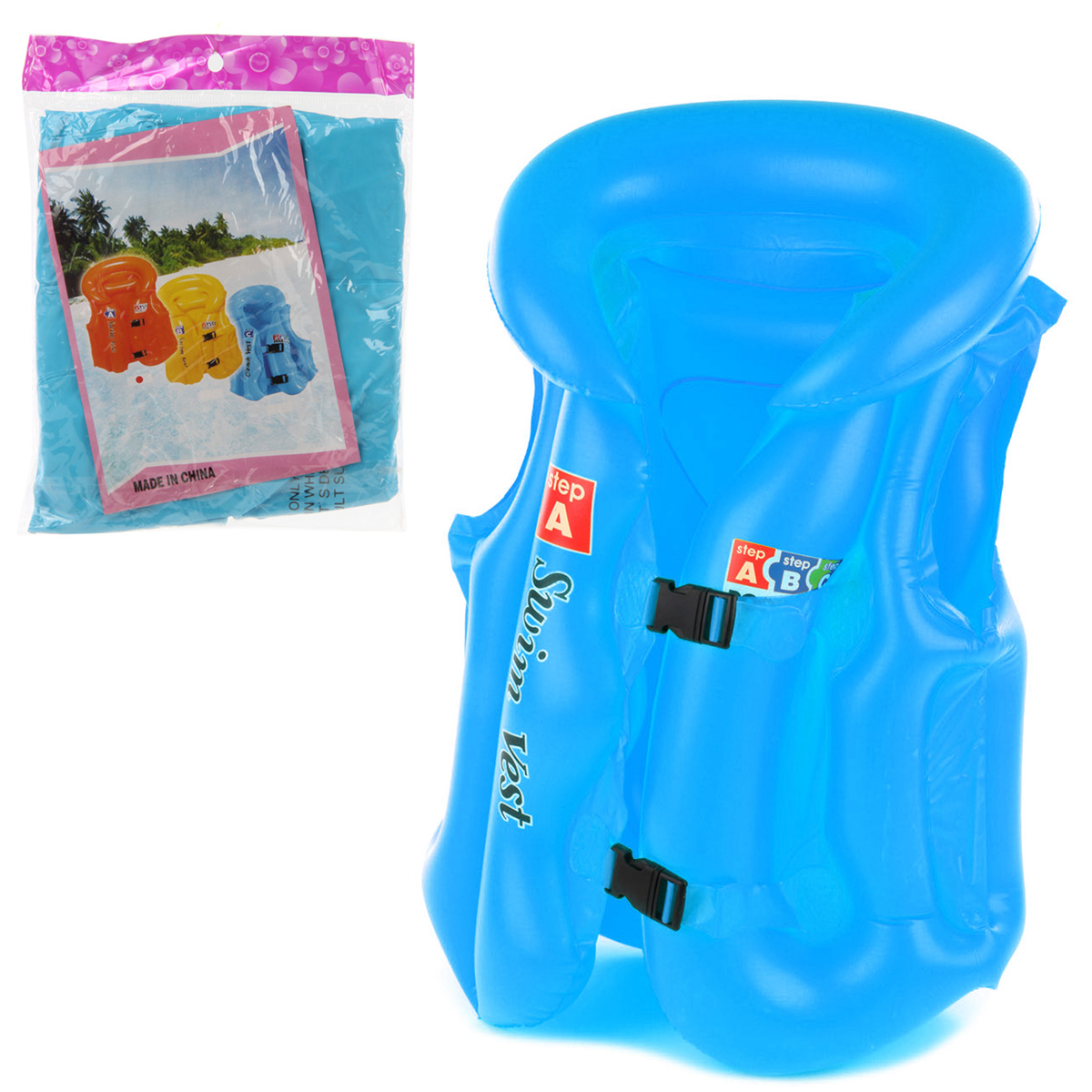Детский надувной жилет для плавания c 3 воздушными камерами, расстегивающимися ремешками и удобным подголовником. 3 клапана, крепкие застежки, регулируемые ремешки, мягкие швы и мягкий воротник. Легко надувается и сдувается, занимает мало места в сдутом состоянии.