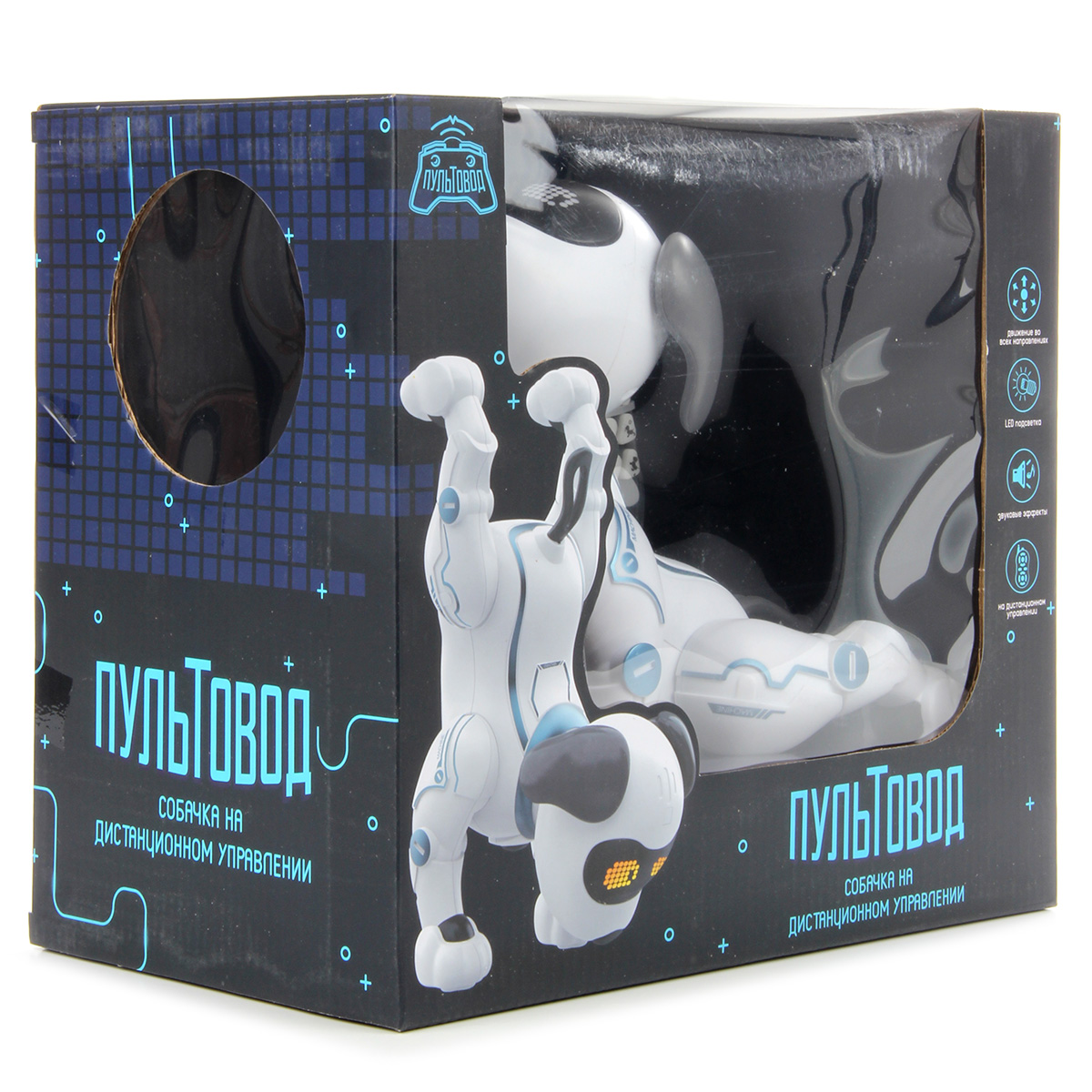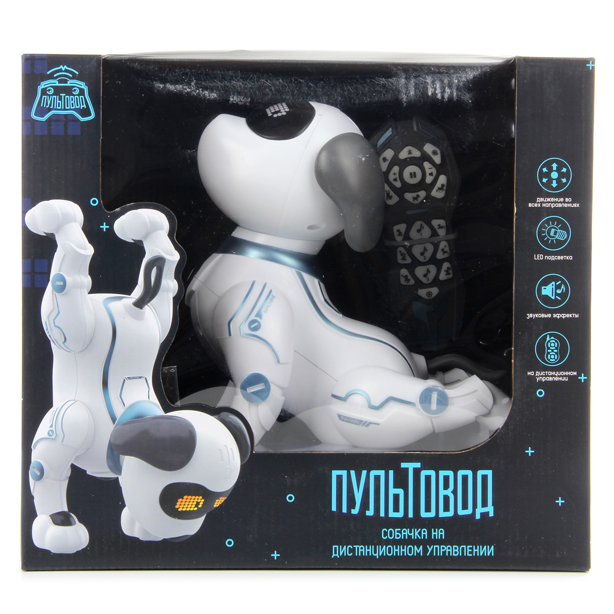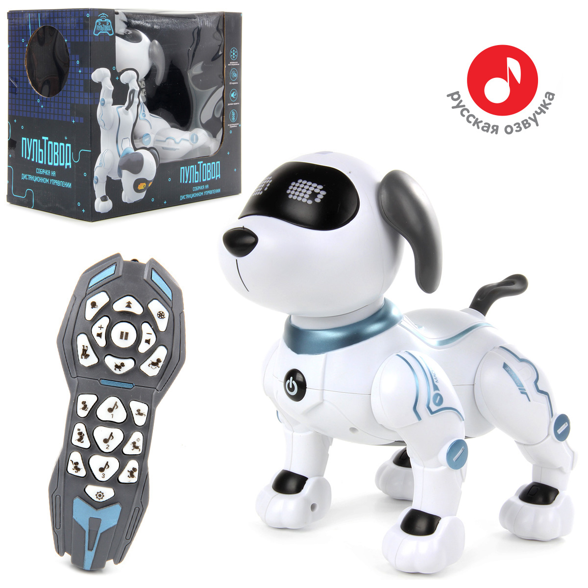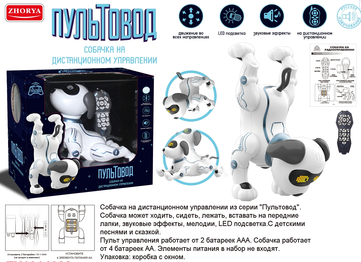 В комплект входят собачка, пульт радиоуправления, инструкция на русском языке и крестовая отвертка.