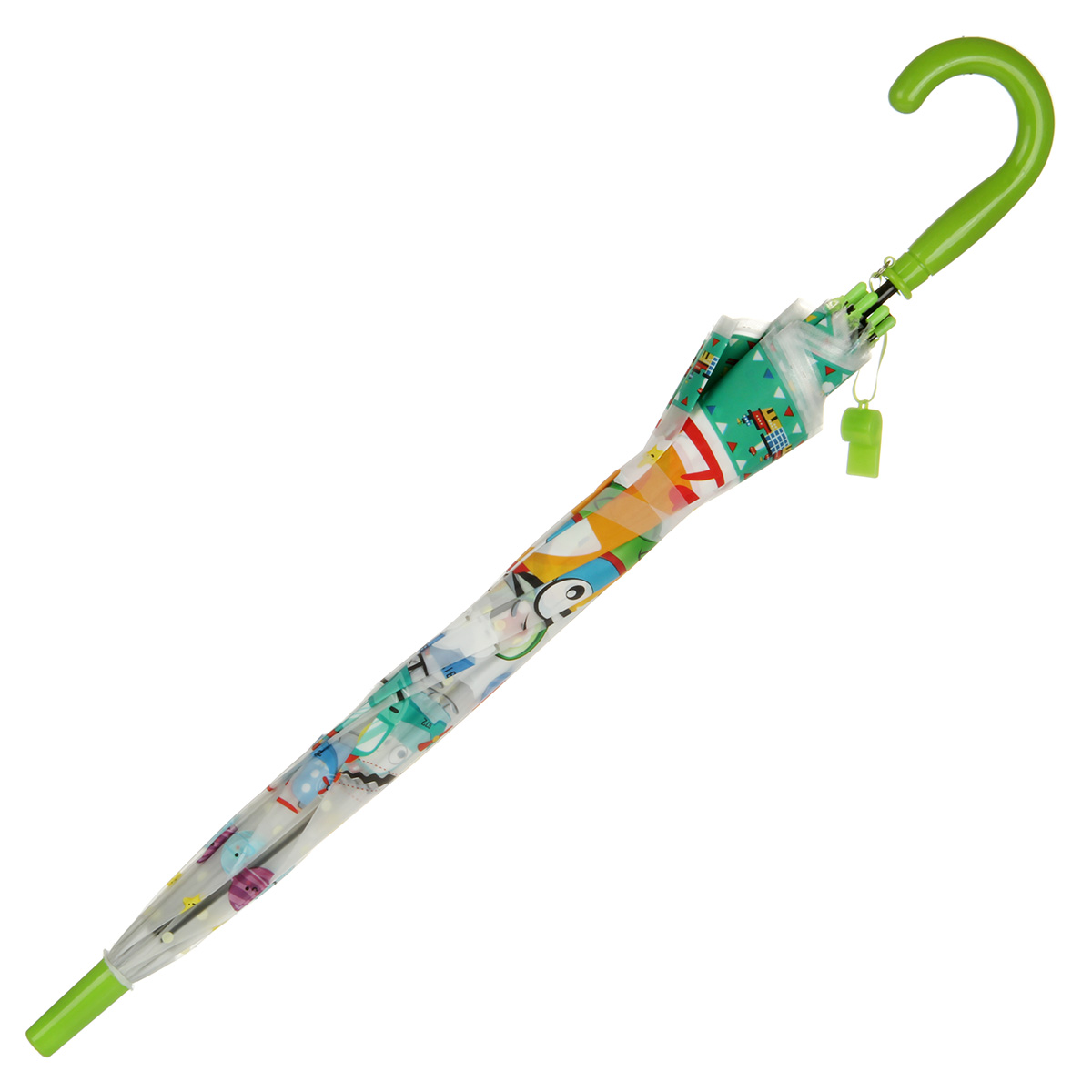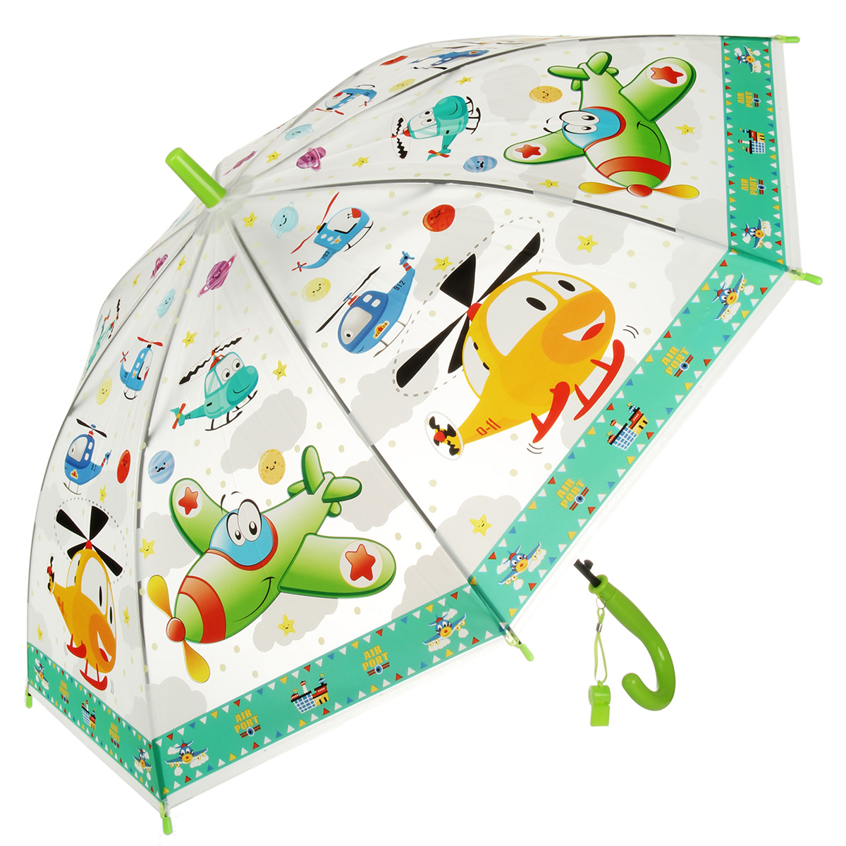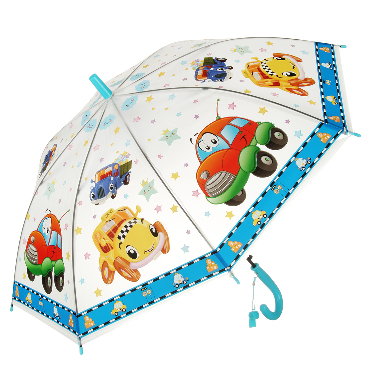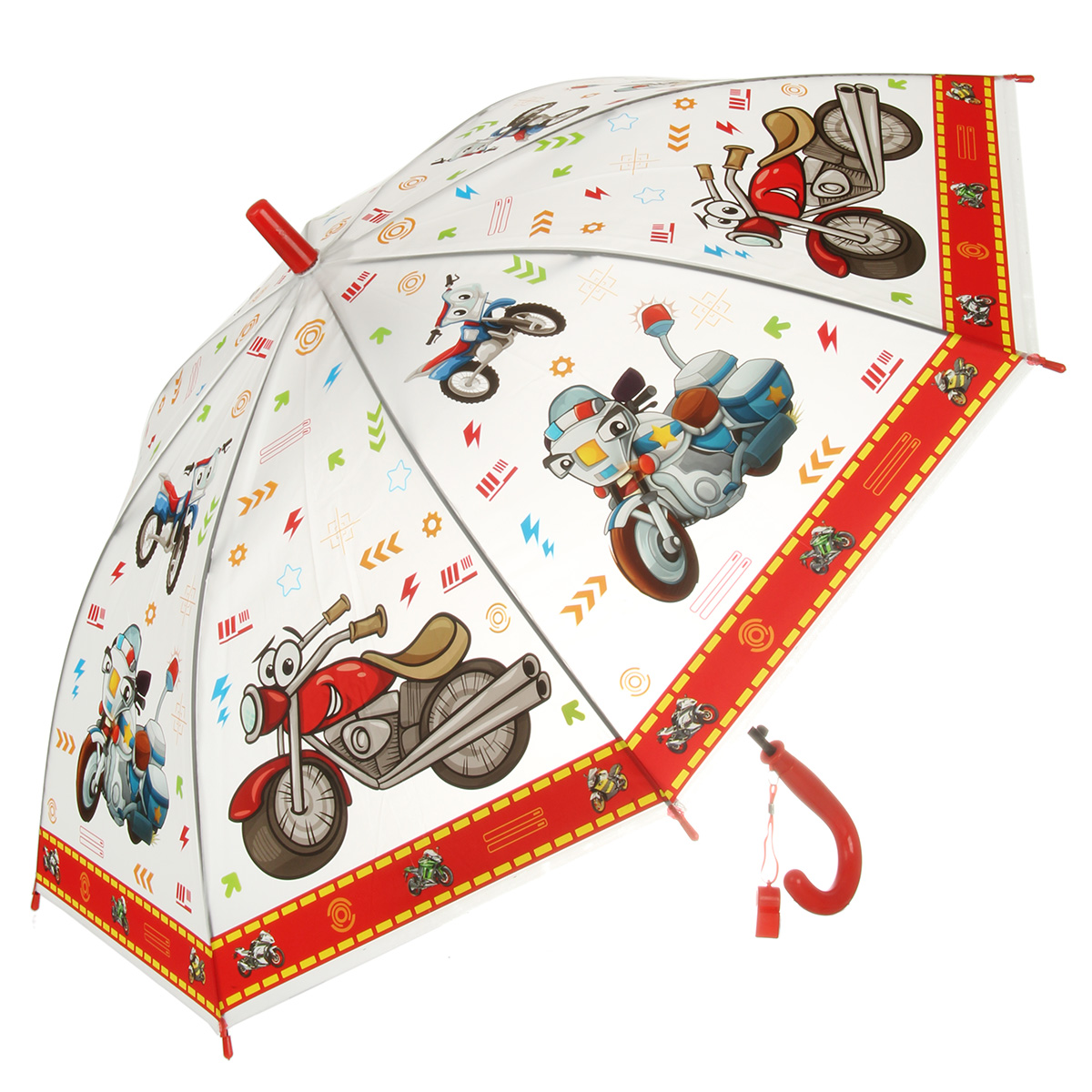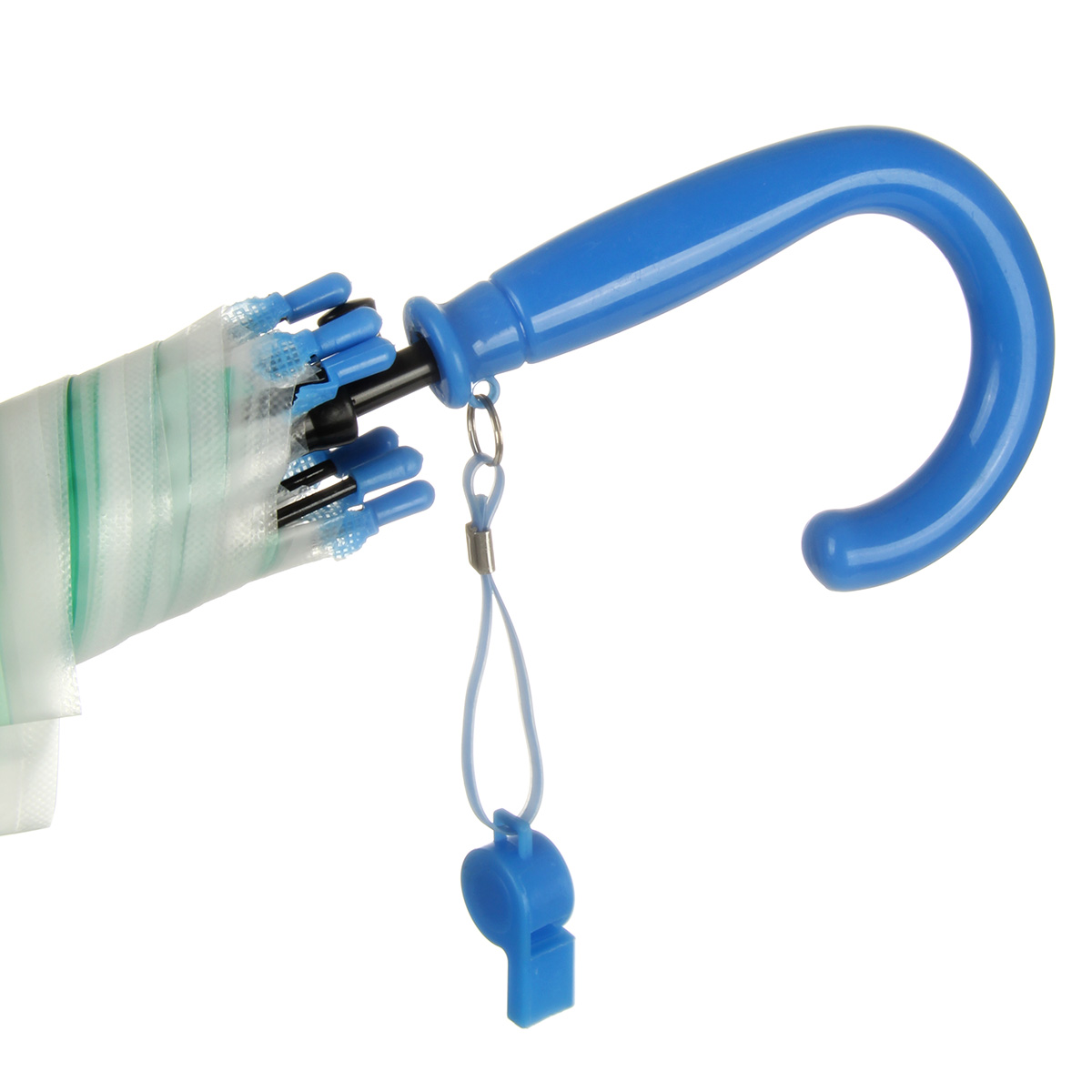 Красивый дизайн, удобная ручка, свисток на веревочке, без такого зонтика-трости не обойдется ни один выход в дождливую погоду. Зонтик детский полуавтоматический, раскрывается путем нажатия кнопки, складывается вручную, закрывается на ремешок на кнопке.