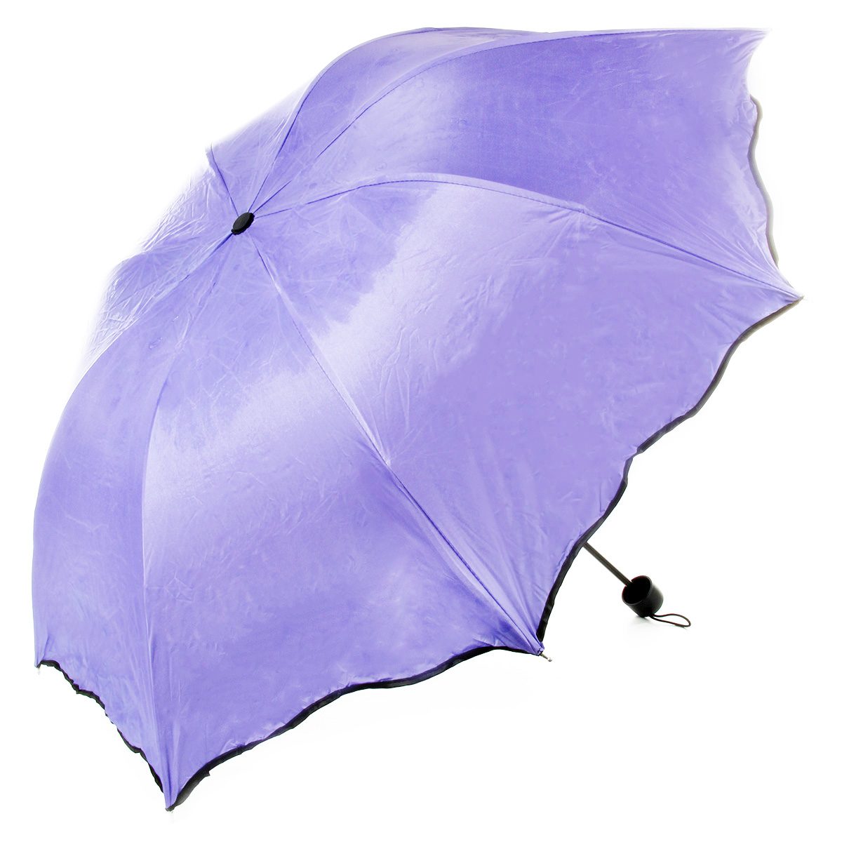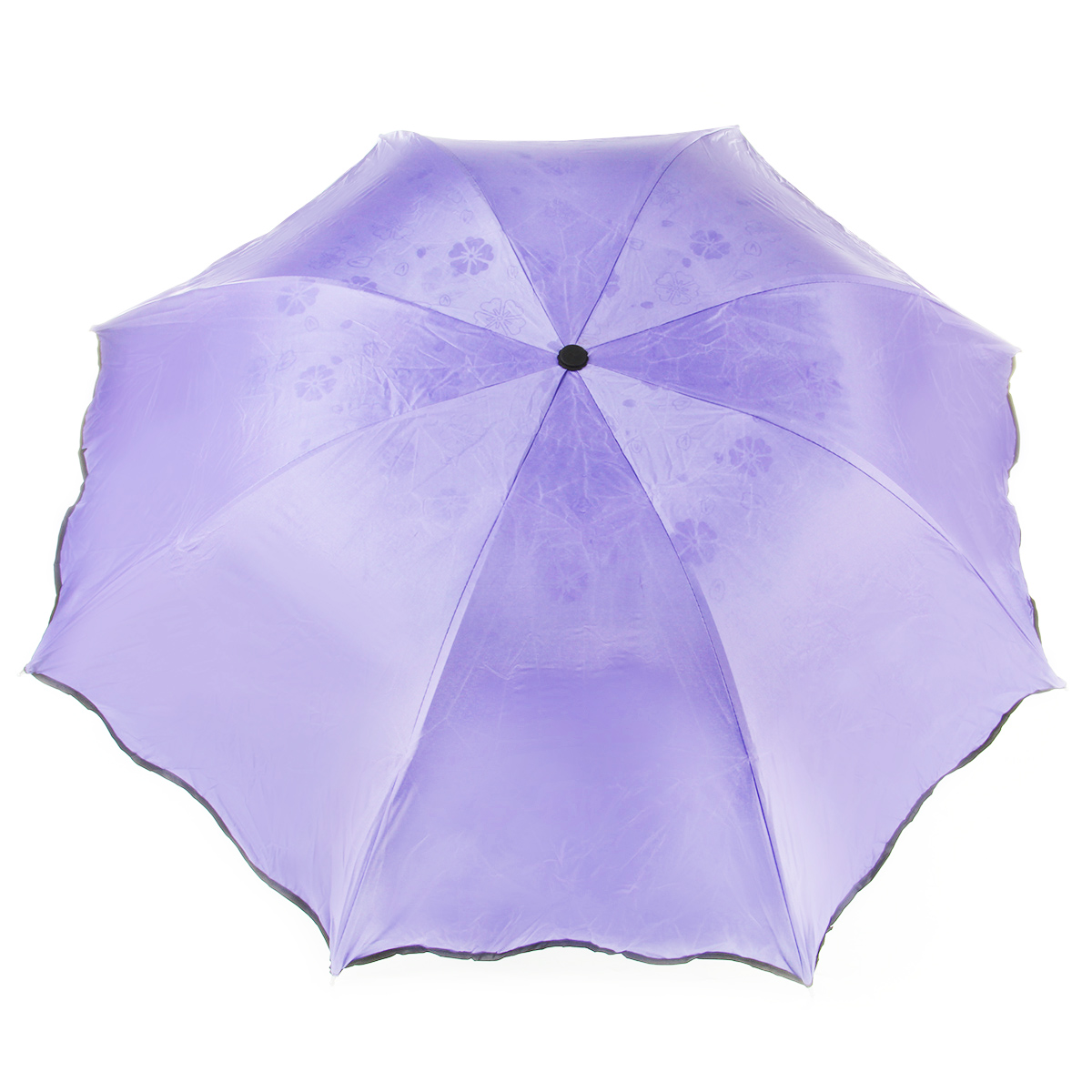 Зонт складной с металлическим каркасом, 8 надежных спиц, концы спиц закруглены для безопасного использования. Внутренний солнцезащитный слой купола надежно защищает от солнечных лучей, при попадании воды на куполе проявляются рисунки цветов и листочков.