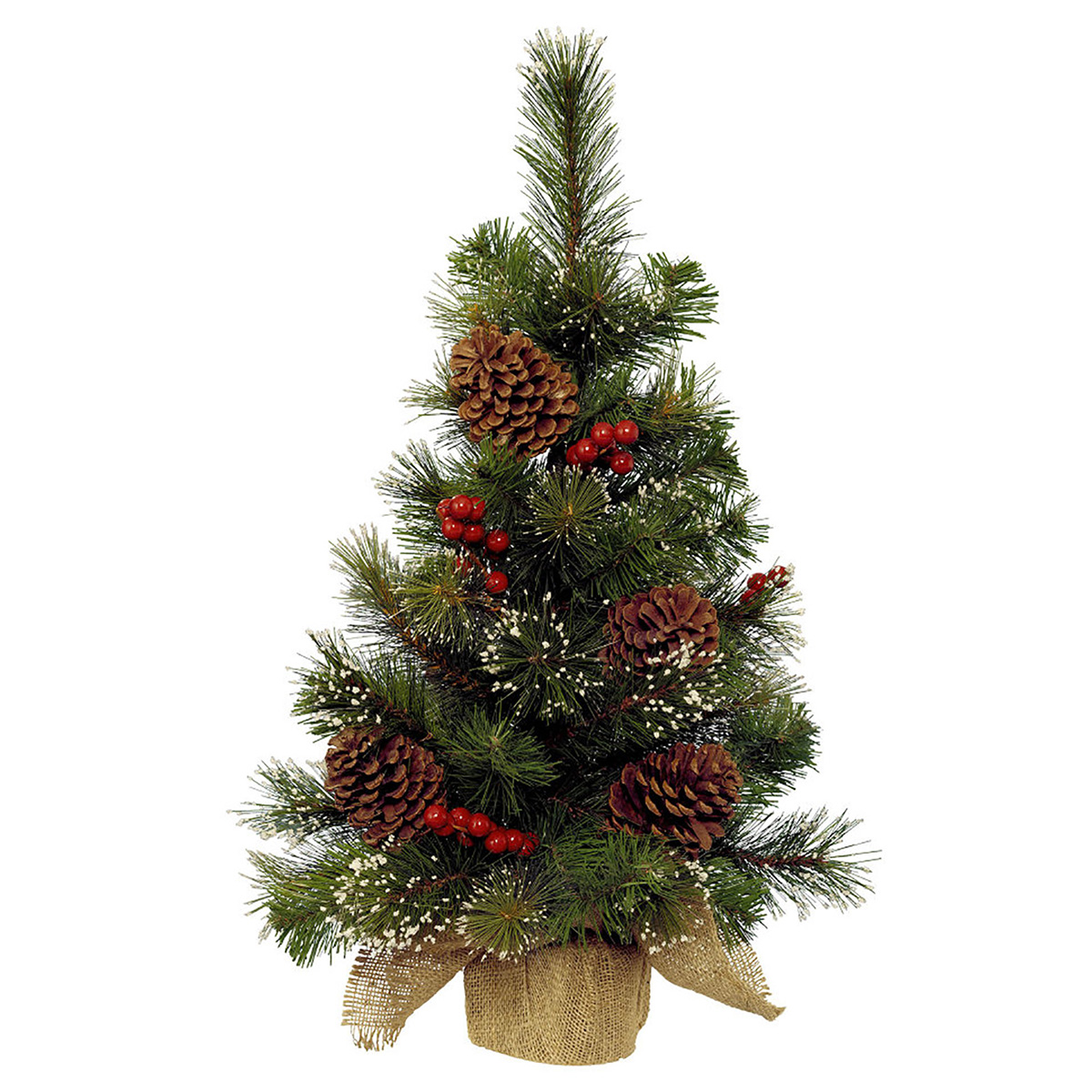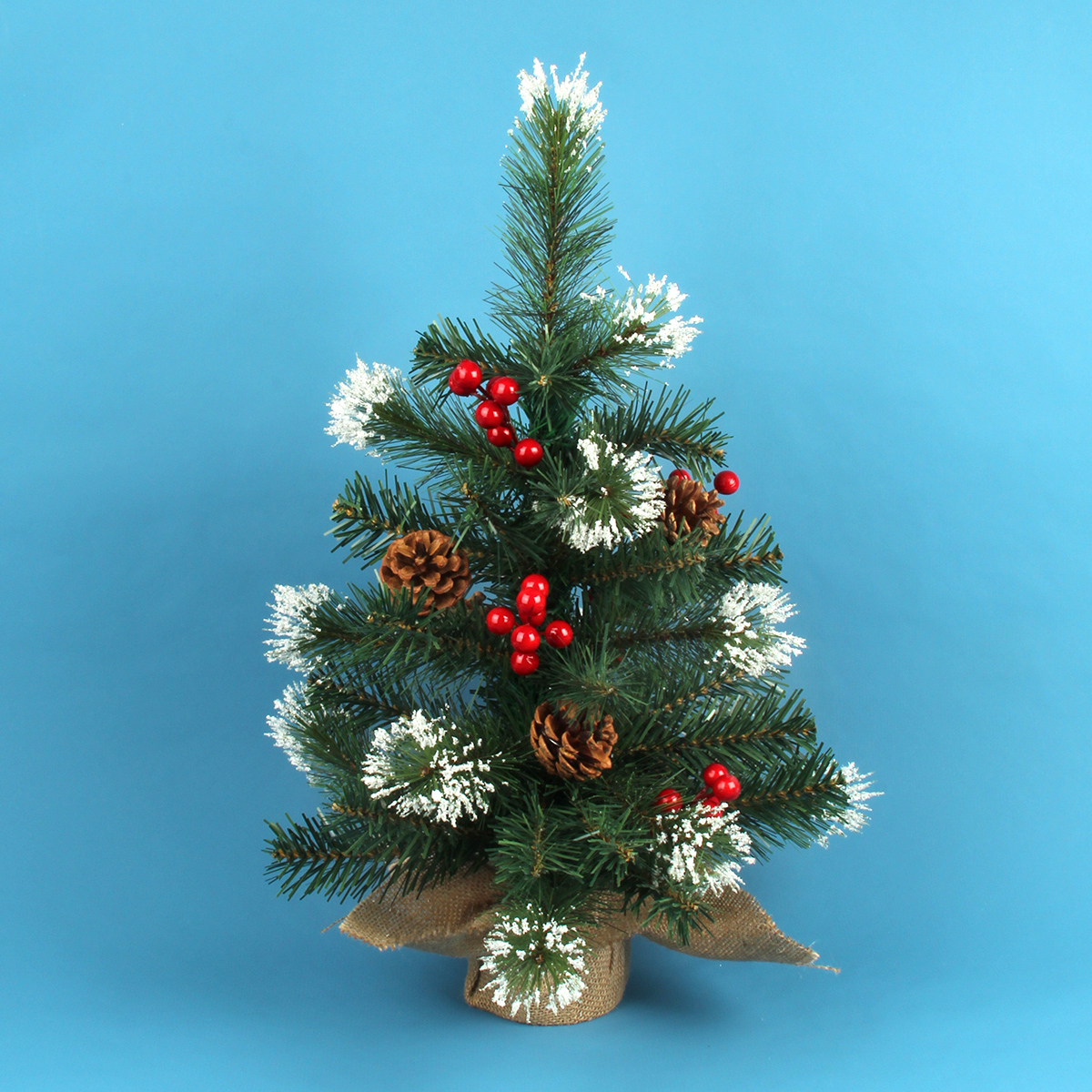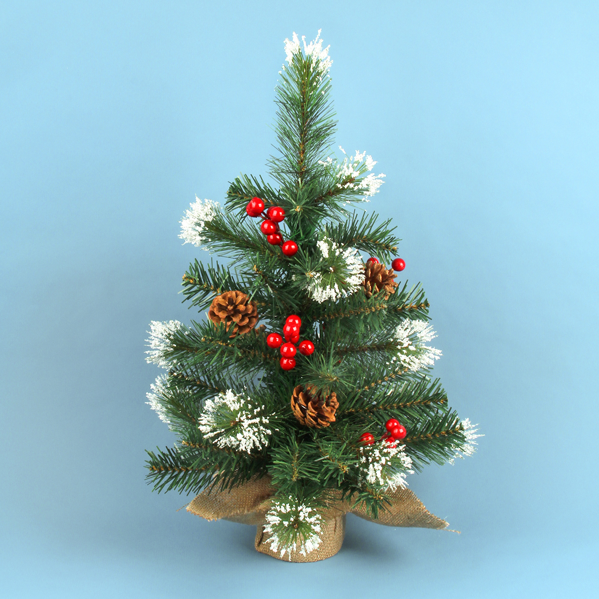 Искусственная елка для праздника декорирована настоящими шишками и украшениями в виде веточек ягод, есть пенопласт, имитирующий искусственный снег. Новогоднее украшение компактных размеров устойчиво стоит на подставке. Лапки рождественской елки гнутся в разные стороны.