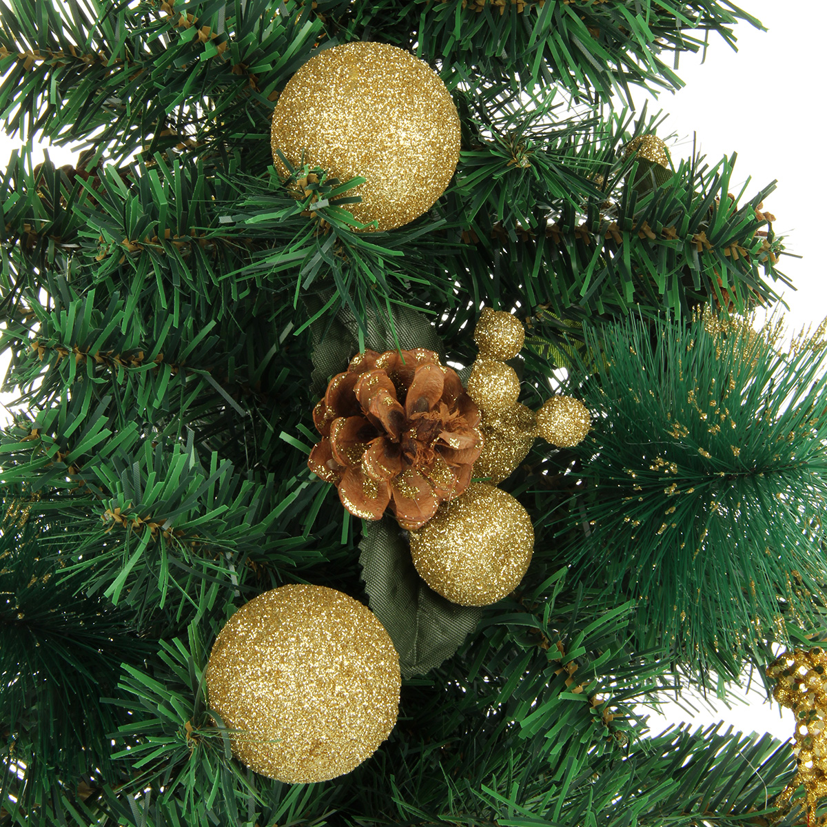 Елка интерьерная пластиковая декорирована настоящими шишками, шариками с глиттером, съемным бантом. Лапки елки гнутся, елочка устойчиво стоит в подставке.