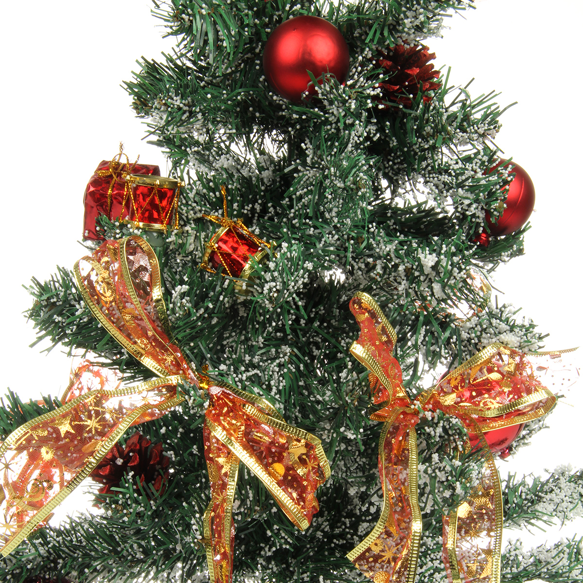 Искусственная елка для праздника декорирована в красной гамме бантиками, шарами, барабанами, подарками и настоящими шишками, есть пенопласт, имитирующий искусственный снег. Новогоднее украшение компактных размеров устойчиво стоит в подставке. Лапки рождественской елки гнутся в разные стороны.