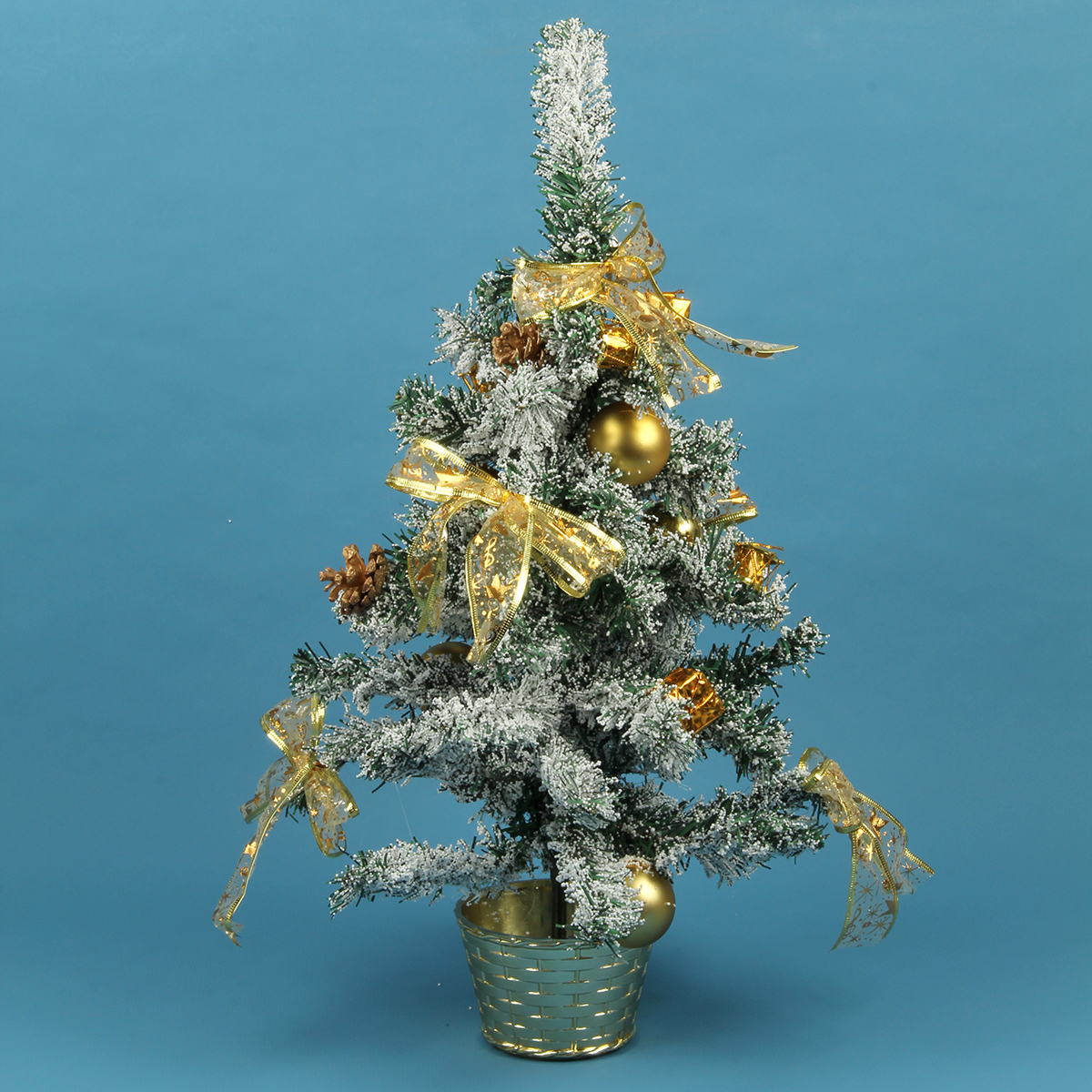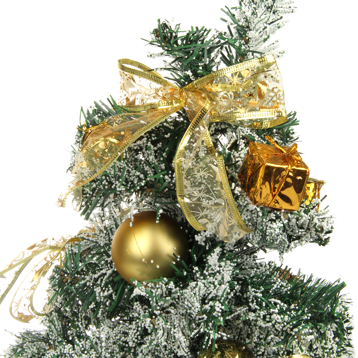 Новогодняя ель компактных размеров, красивая, декорирована в золотой гамме бантиками, шарами, бабочками, подарочками и ягодами. Устойчиво стоит в подставке.