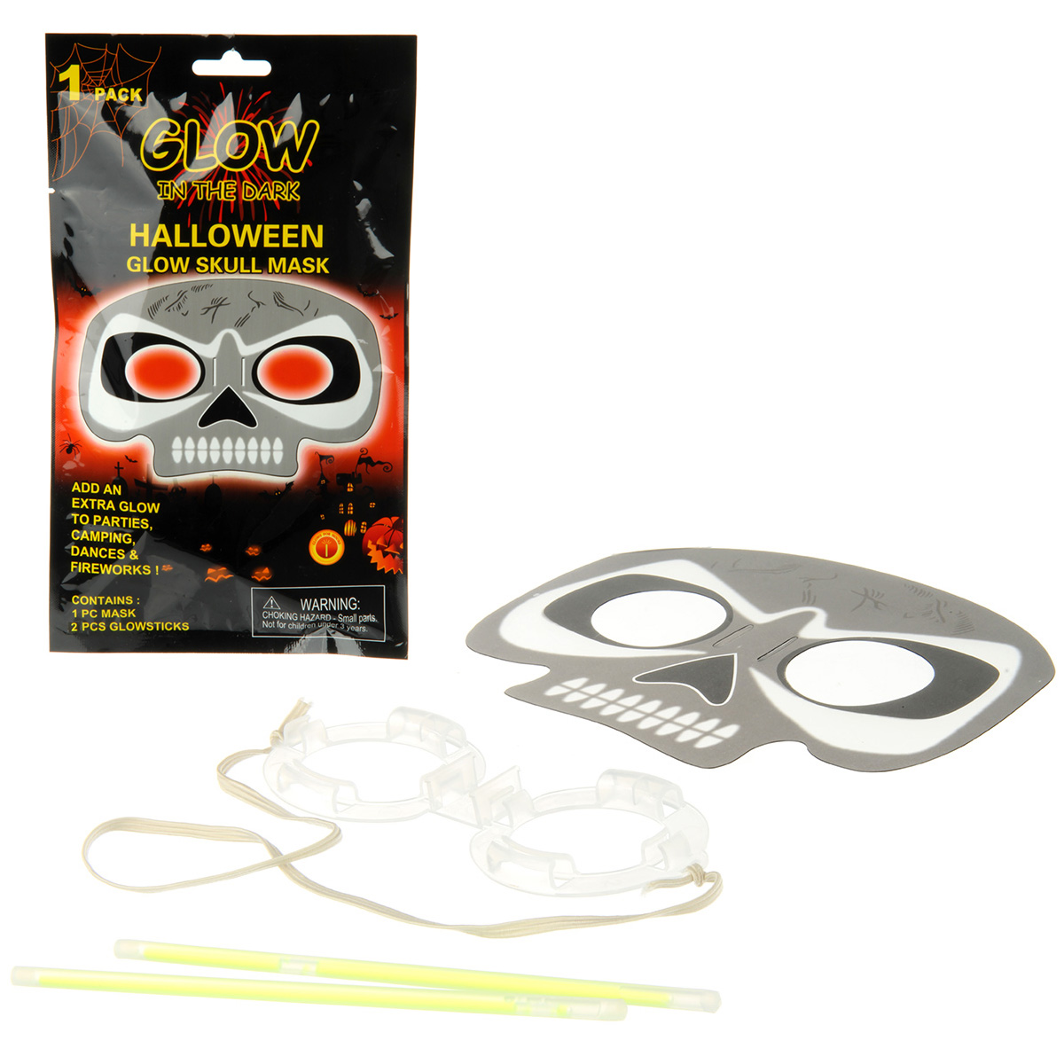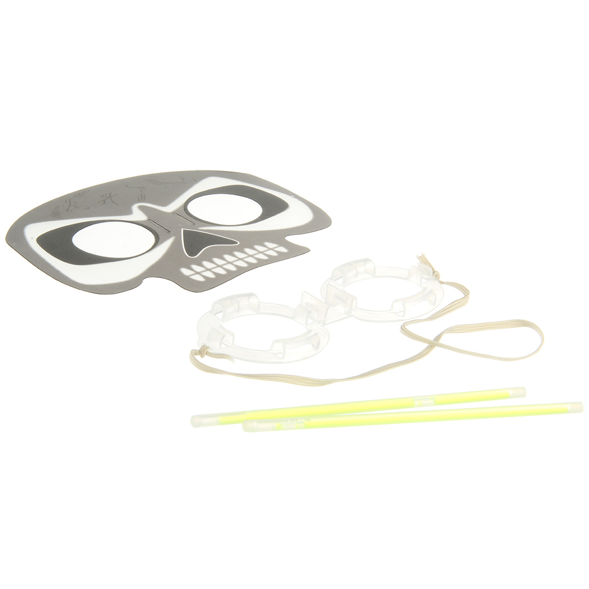 Маска хэллоуиновская светящаяся в форме черепа. Такой аксессуар придаст законченный вид вашему образу и станет незаменимым атрибутом для тематических вечеринок и розыгрышей. В комплект входит маска, 2 светящиеся палочки. Благодаря резинке эту маску сможет носить любой. Размеры упаковки: 14*1*25 см. Размеры карнавальной маски: 18*17*11 см. Размеры светящейся палочки: 15,5*0,5 см. Изготовлено из безопасного полимерного материала.