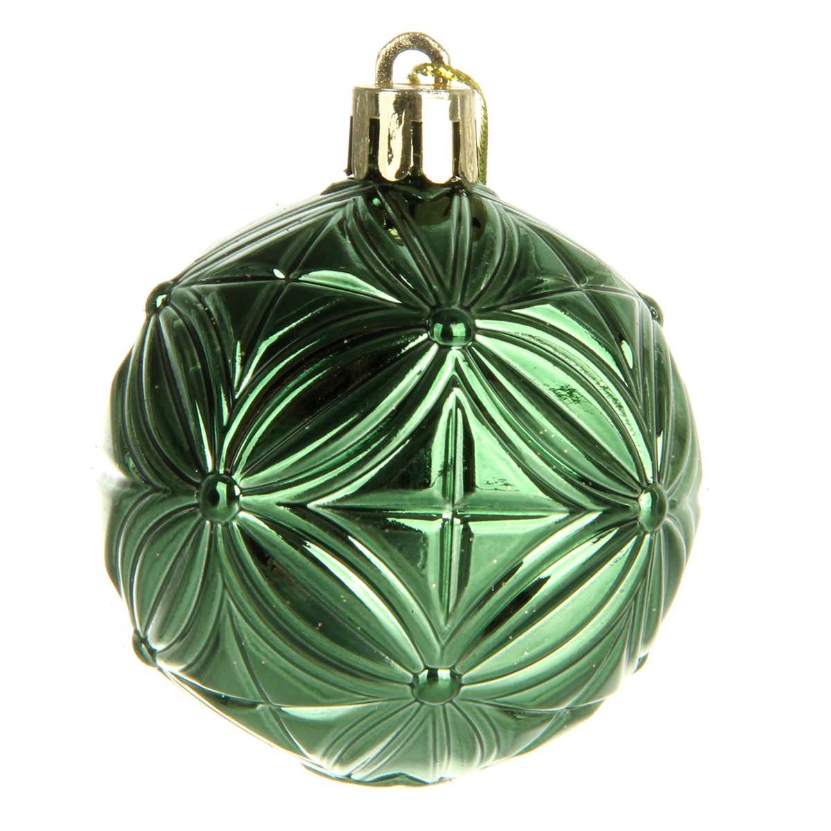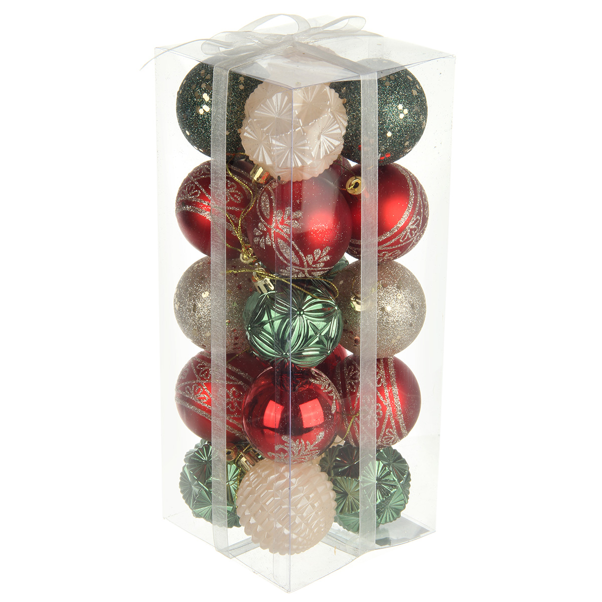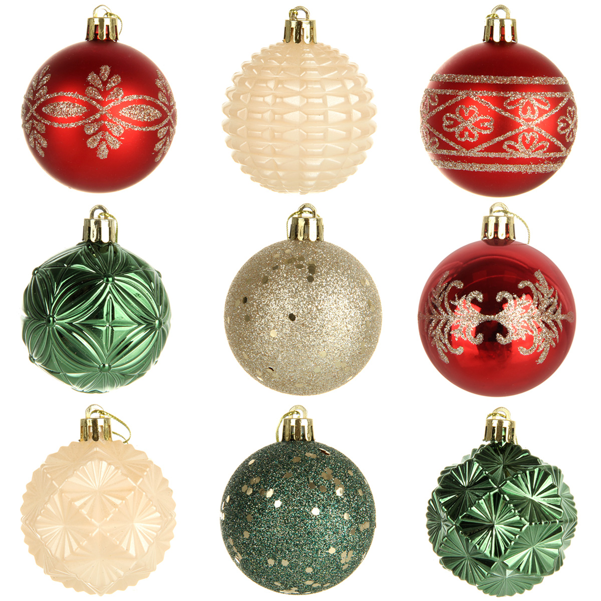 В наборе 20 новогодних шариков для декора. 4 шара изумрудного цвета с фактурной поверхностью, 6 красных матовых шаров с узорами, 2 красных глянцевых шара с узорами, 4 кремовых шара с фактурной поверхностью, 2 серебряных шара, украшенных глиттером, 2 изумрудных шара, украшенных глиттером.