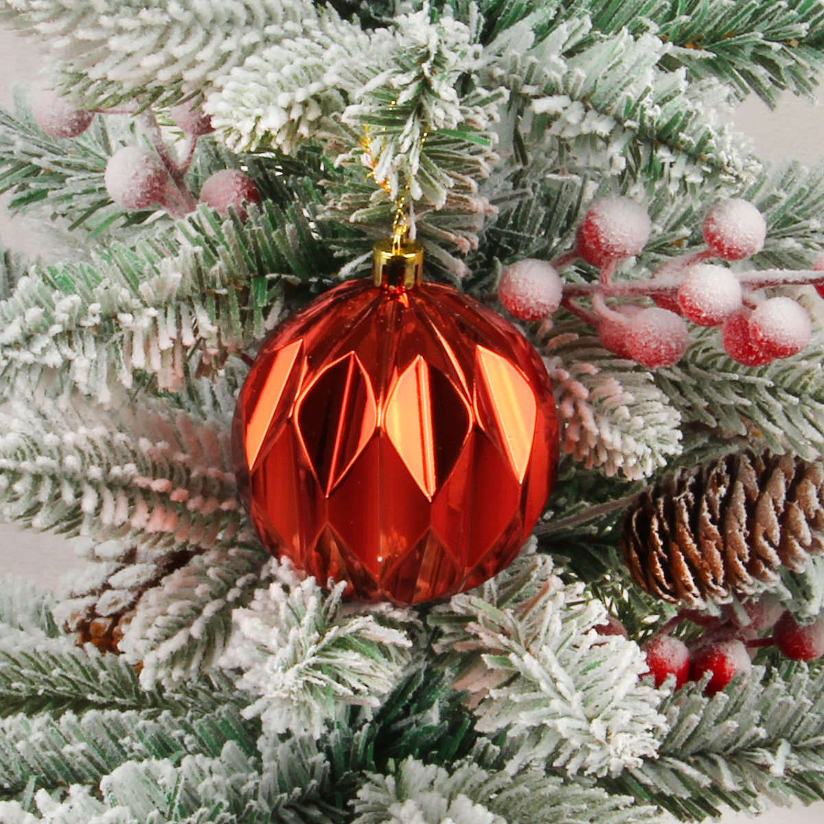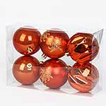 В наборе 6 шариков красного цвета, 2 глянцевых, 2 узорчатых и 2 матовых. Крепление веревочка подвеска.