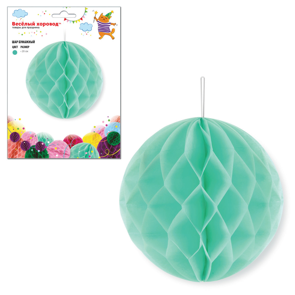 Бумажный шар - очень красивый, яркий и модный элемент для декора помещения. Легко раскладывается и складывается, подойдет для украшения помещения к любому торжеству, поставляется в сложенном виде, цвет - мятный. Принципы сборки бумажного шара: - разверните сложенный шар; - соедините и зафиксируйте края, сняв защитные полоски с двустороннего скотча, который имеется на одной из сторон шара. На шарике есть веревочка-петелька, за которую удобно подвесить шарик. С помощью бумажных шаров можно украсить не только интерьер, но и спинки стульев, арки, шатры, праздничные столы. Бумажные шары хорошо сочетаются с шарами других цветов. Шар изготовлен из картона, бумаги и текстильного материала, упакован в пакет. Диаметр разложенного шара: 20 см. Размеры шара в упаковке: 13*0,5*22 см.