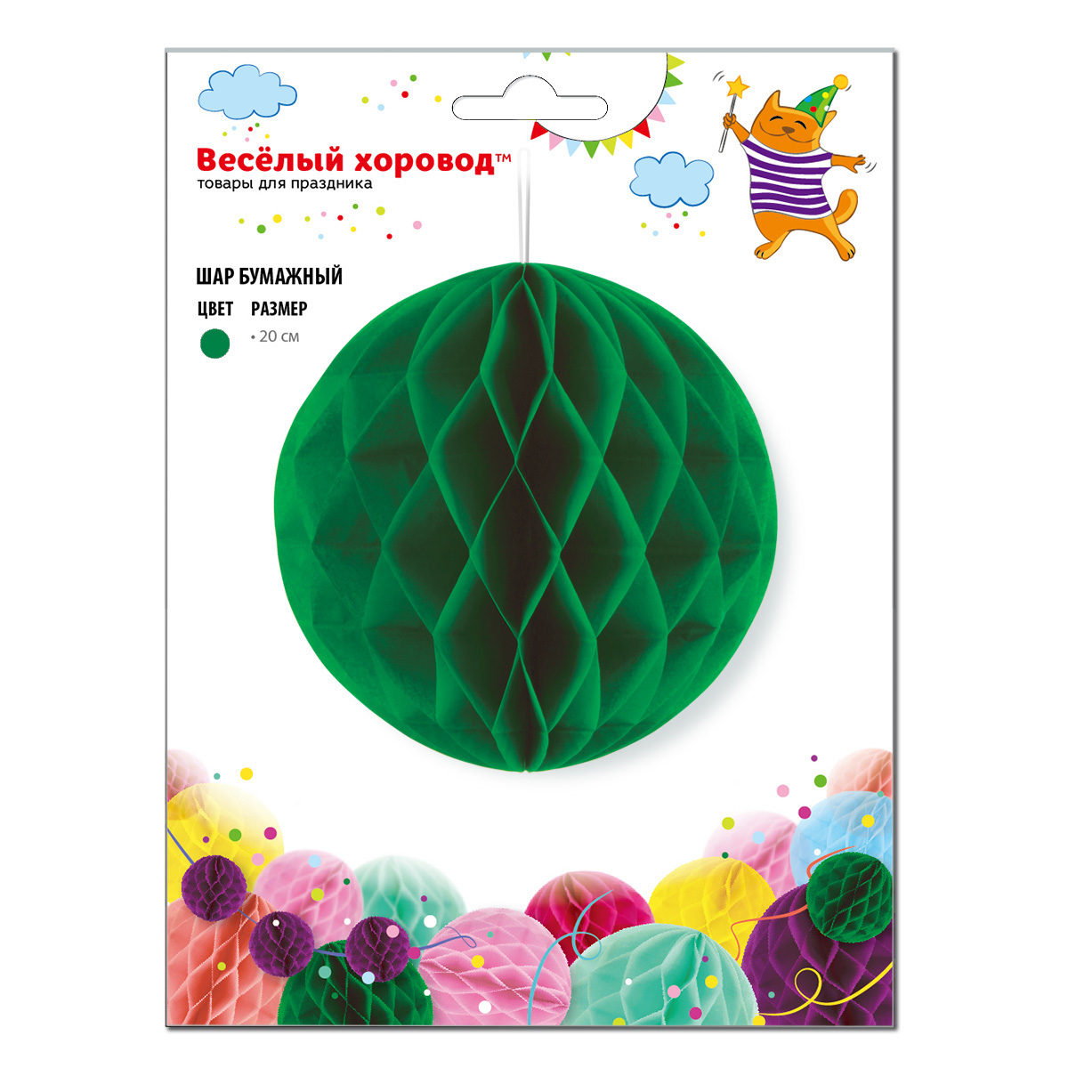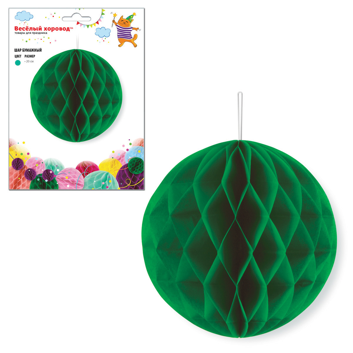 Бумажный шар - очень красивый, яркий и модный элемент для декора помещения. Легко раскладывается и складывается, подойдет для украшения помещения к любому торжеству, поставляется в сложенном виде, цвет - зеленый. Принципы сборки бумажного шара: - разверните сложенный шар; - соедините и зафиксируйте края, сняв защитные полоски с двустороннего скотча, который имеется на одной из сторон шара. На шарике есть веревочка-петелька, за которую удобно подвесить шарик. С помощью бумажных шаров можно украсить не только интерьер, но и спинки стульев, арки, шатры, праздничные столы. Бумажные шары хорошо сочетаются с шарами других цветов. Шар изготовлен из картона, бумаги и текстильного материала, упакован в пакет. Диаметр разложенного шара: 20 см. Размеры шара в упаковке: 13*0,5*22 см.