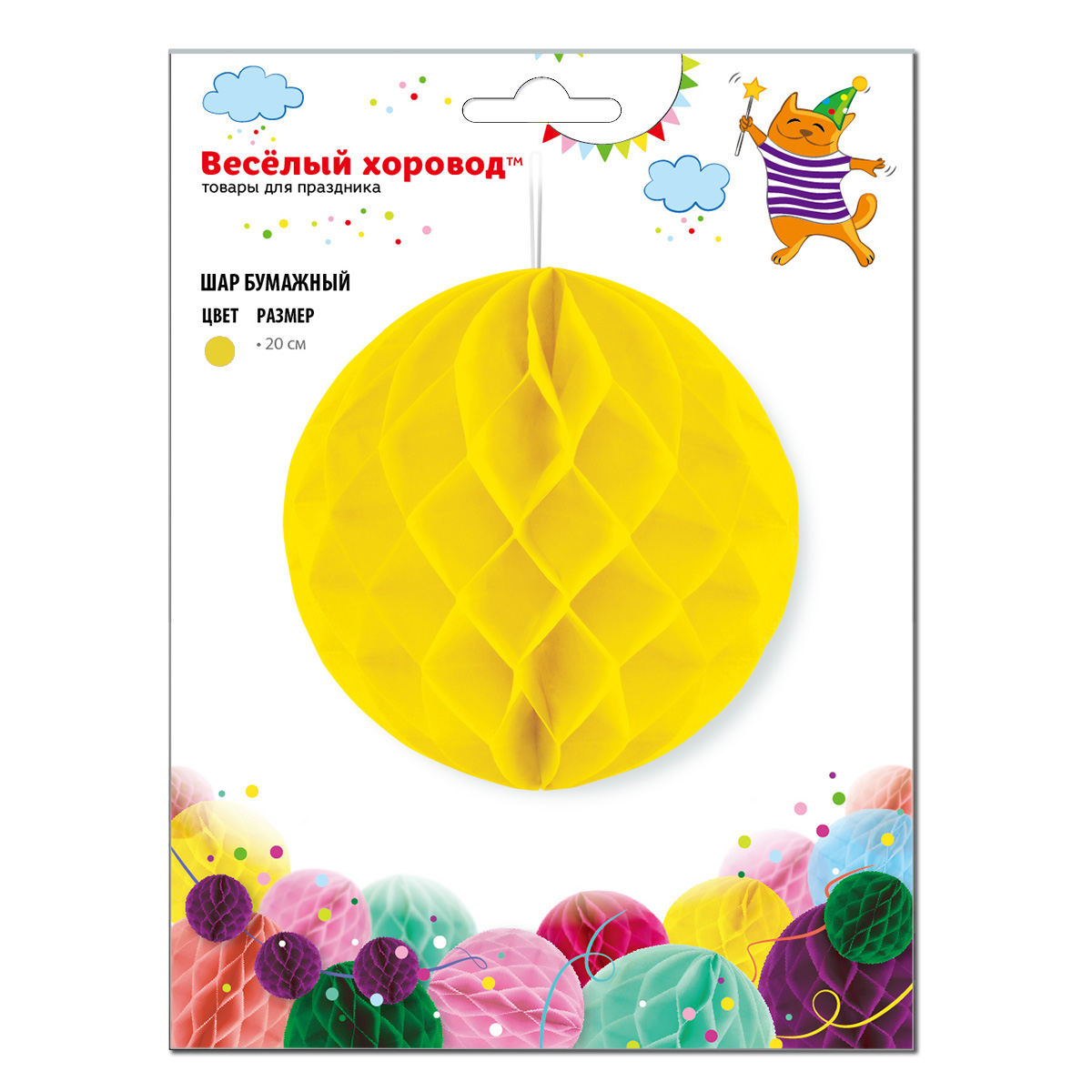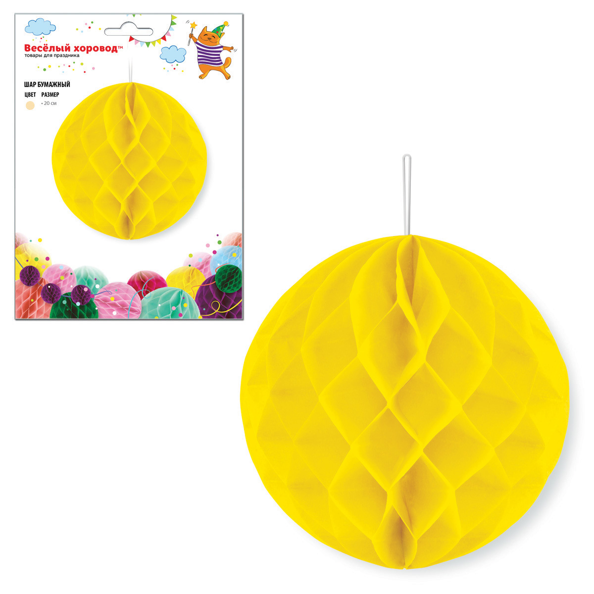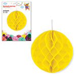 Бумажный шар - очень красивый, яркий и модный элемент для декора помещения. Легко раскладывается и складывается, подойдет для украшения помещения к любому торжеству, поставляется в сложенном виде, цвет - желтый. Принципы сборки бумажного шара: - разверните сложенный шар; - соедините и зафиксируйте края, сняв защитные полоски с двустороннего скотча, который имеется на одной из сторон шара. На шарике есть веревочка-петелька, за которую удобно подвесить шарик. С помощью бумажных шаров можно украсить не только интерьер, но и спинки стульев, арки, шатры, праздничные столы. Бумажные шары хорошо сочетаются с шарами других цветов. Шар изготовлен из картона, бумаги и текстильного материала, упакован в пакет. Диаметр разложенного шара: 20 см. Размеры шара в упаковке: 13*0,5*22 см.